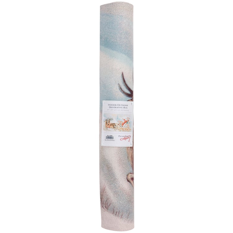 A polyester rug from our Christmas Collection displaying vintage art of Santa riding in his sleigh at the north pole with a seasonal sentiment that reads "Merry Christmas." Seasonal rug can be used indoor or outdoor and features skid-resistant backing to help stay in place. Spot cleaning recommended. Our Merry Christmas rug comes packaged neatly rolled with tag displaying full rug design. A Christmas home accent that adds functional vintage style.