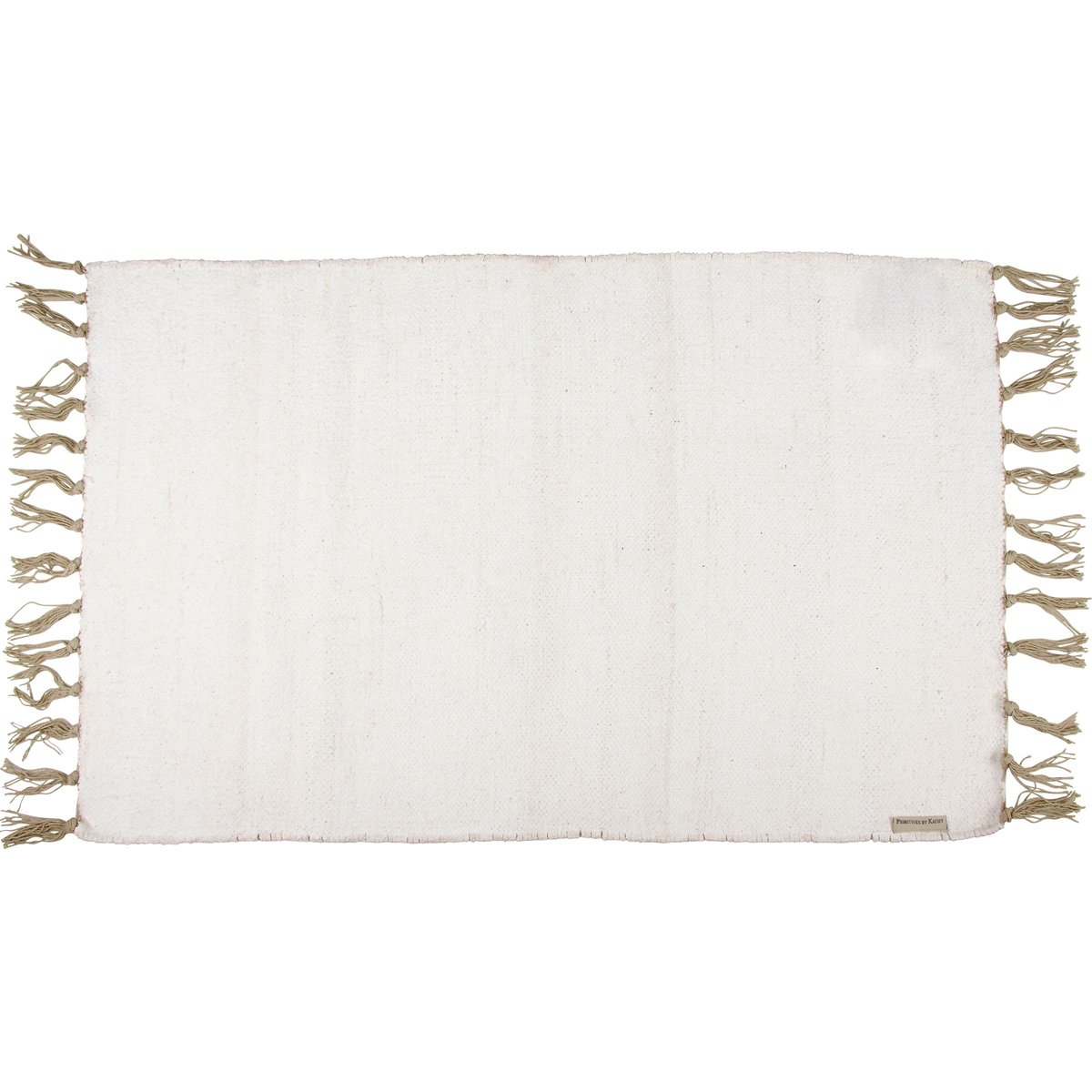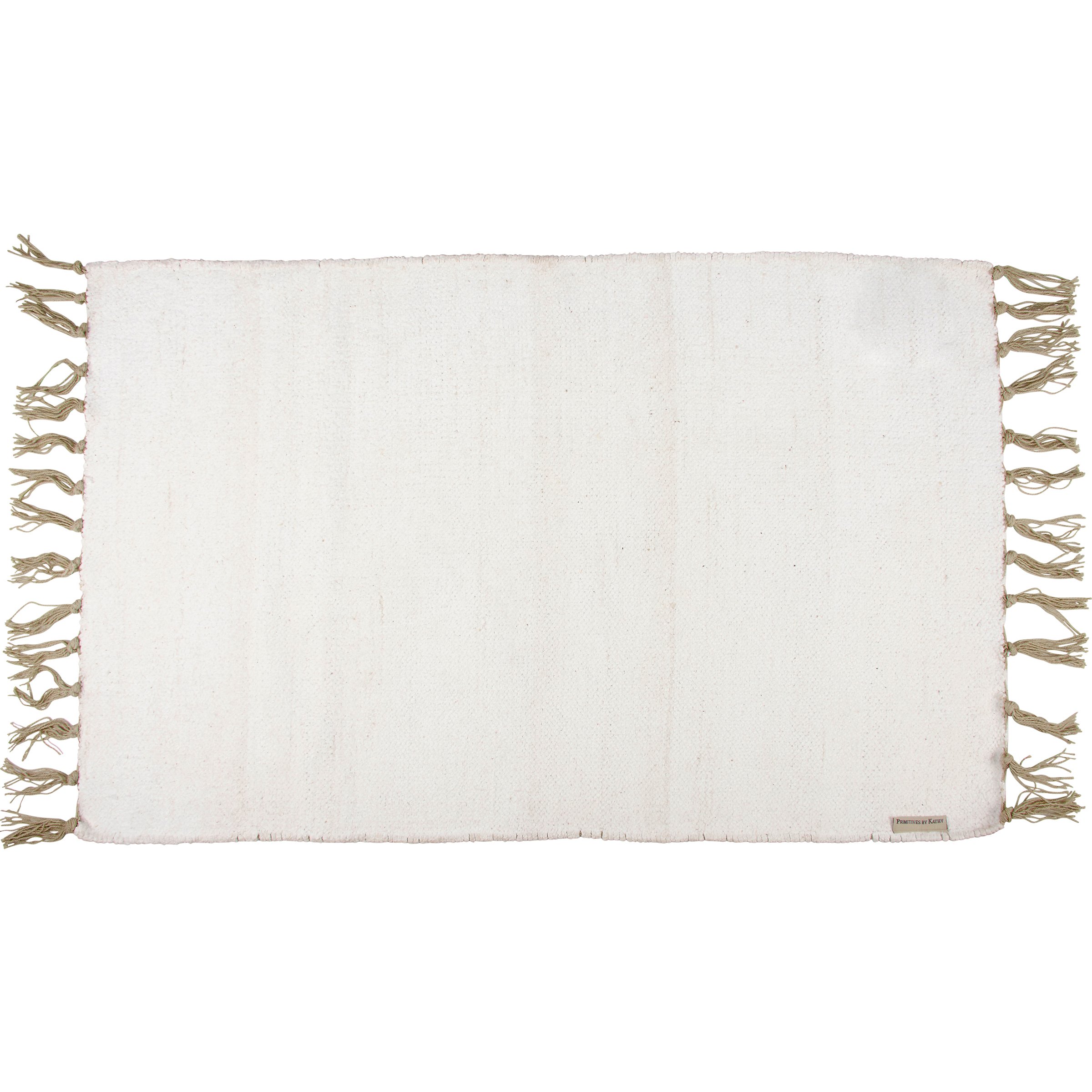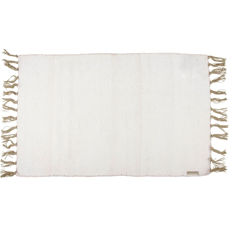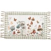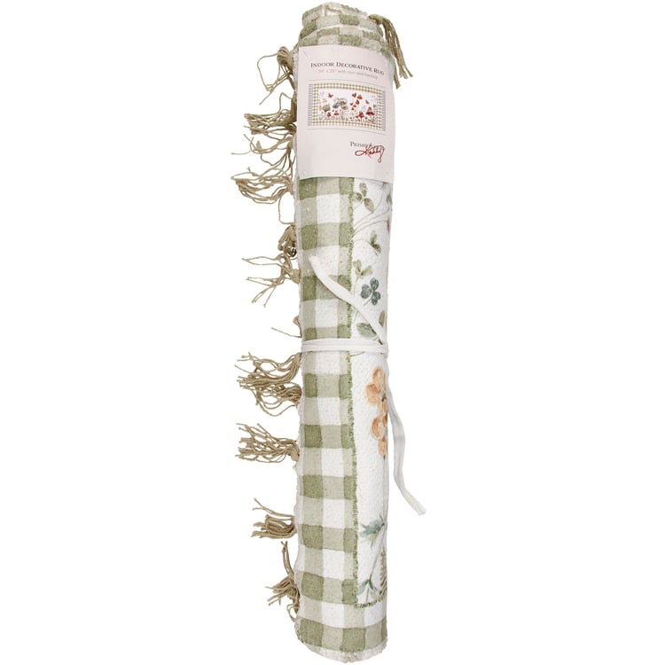 A cotton and chenille rug from our Cottagecore Collection displaying a hand painted design of mushrooms with coordinating green gingham border and tassels on the sides. Rug can be used indoor or outdoor and features skid-resistant backing to help stay in place. Our Mushroom Study rug comes packaged neatly rolled tied with cotton tape and includes tag displaying full rug design. A rustic everyday home accent. Spot cleaning recommended.