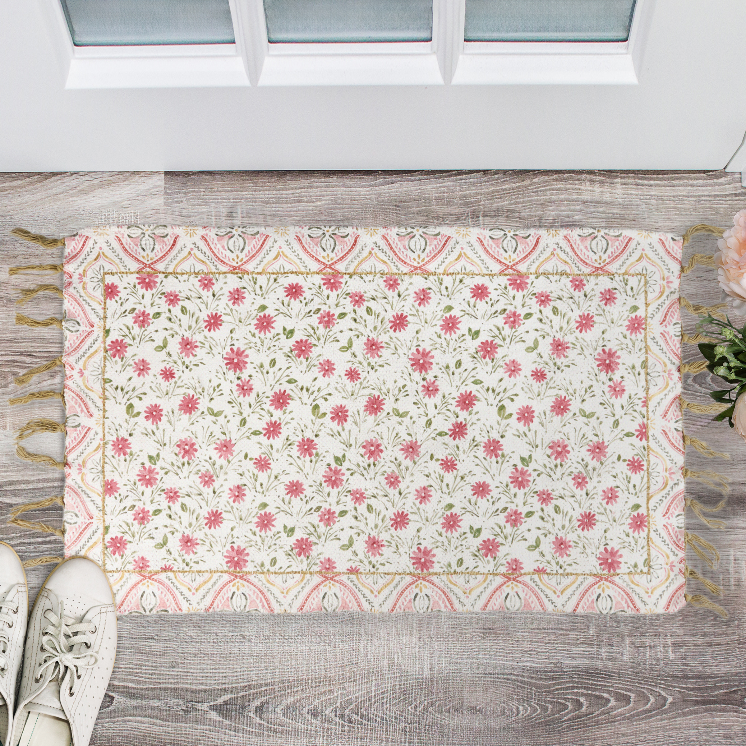 A cotton and chenille rug from our Garden Collection displaying a delightful design of pink florals with coordinating pattern border and tassels on the sides. Design is replicated from original art hand painted in a delicate watercolor style. Rug can be used indoor or covered outdoor and features skid-resistant backing to help stay in place. Spot cleaning recommended. Our Pink Florals rug comes packaged neatly rolled tied with cotton tape and includes tag displaying full rug design. A charming garden-themed home accent that adds functional style.