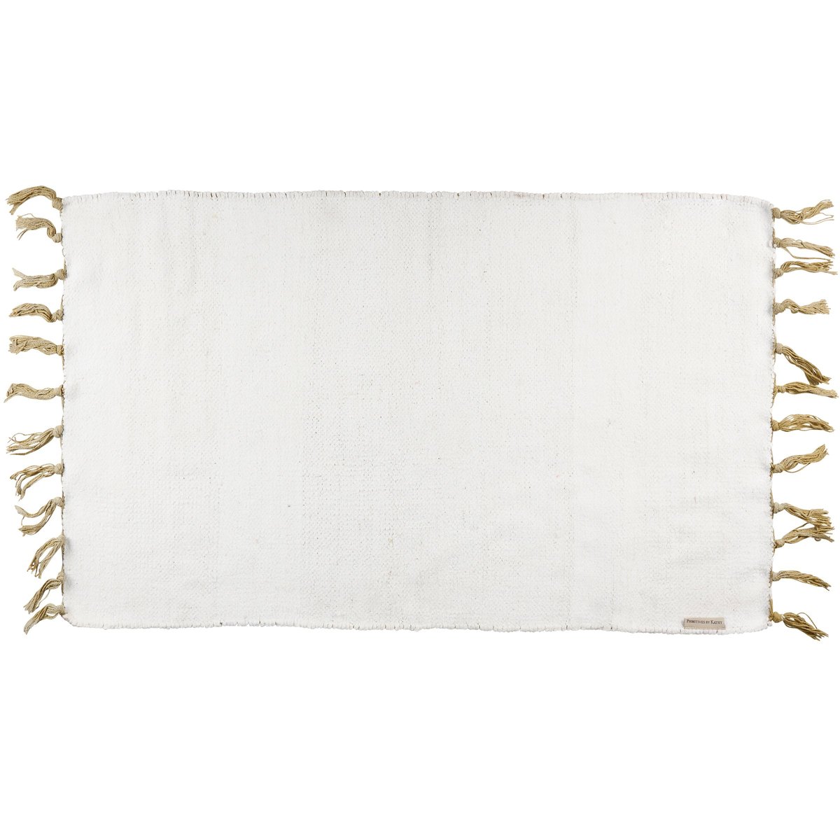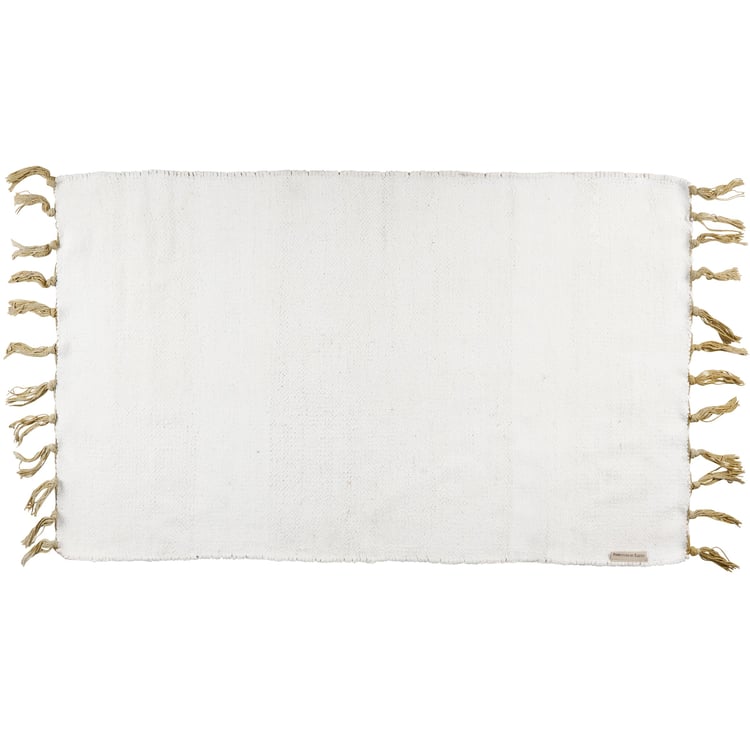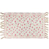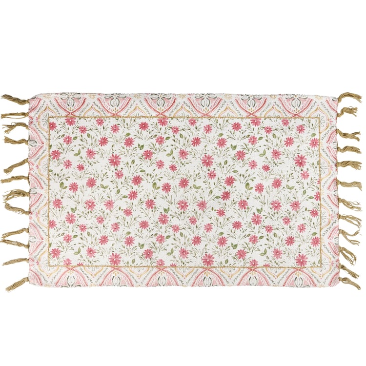 A cotton and chenille rug from our Garden Collection displaying a delightful design of pink florals with coordinating pattern border and tassels on the sides. Design is replicated from original art hand painted in a delicate watercolor style. Rug can be used indoor or covered outdoor and features skid-resistant backing to help stay in place. Spot cleaning recommended. Our Pink Florals rug comes packaged neatly rolled tied with cotton tape and includes tag displaying full rug design. A charming garden-themed home accent that adds functional style.
