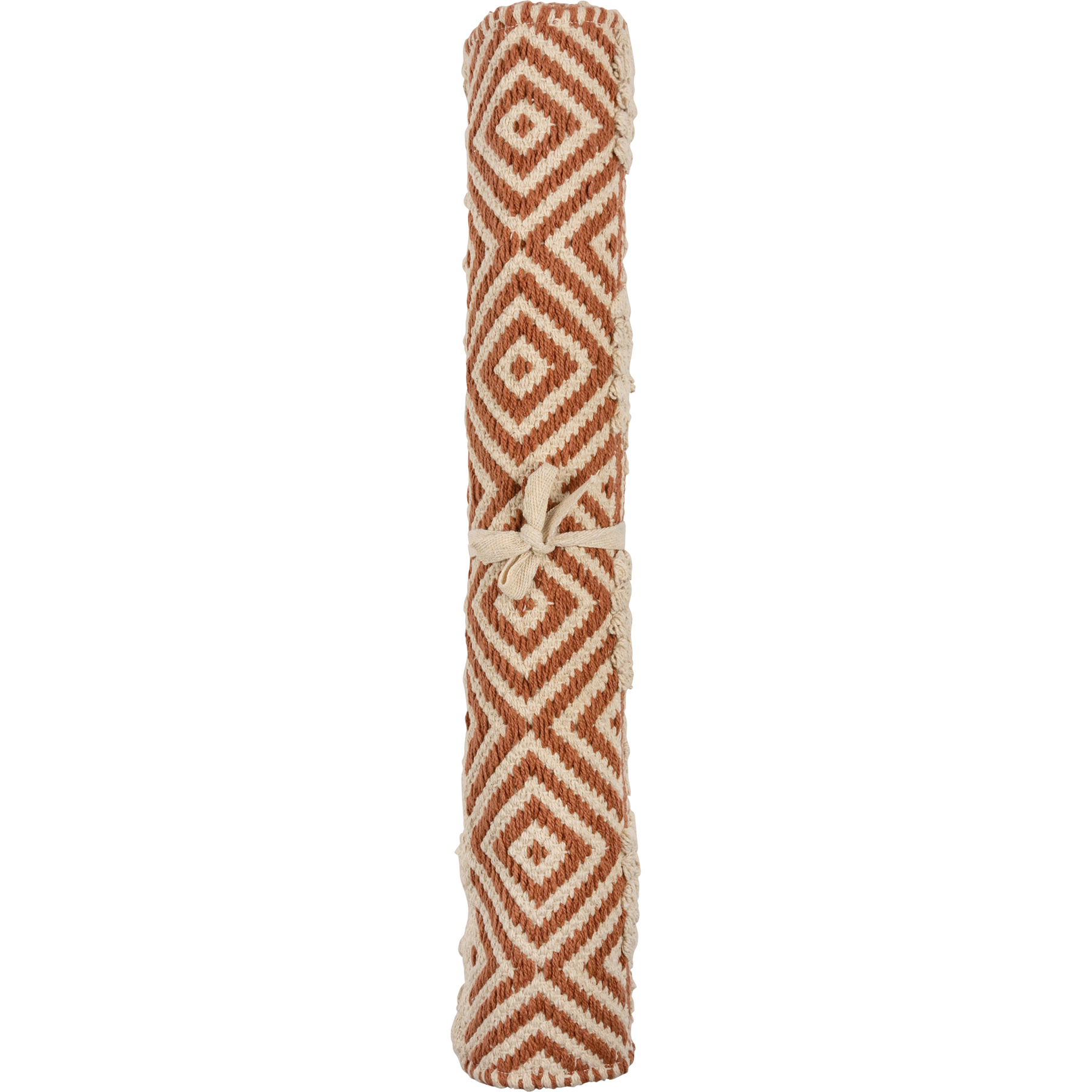 A boho woven cotton rug from our Bohemian Collection featuring textured geometric designs in terracotta and cream tones. Rug features fringe details for added interest. Rug comes rolled and wrapped with tag featuring full design. Our Sierra Geometric is machine-washable.