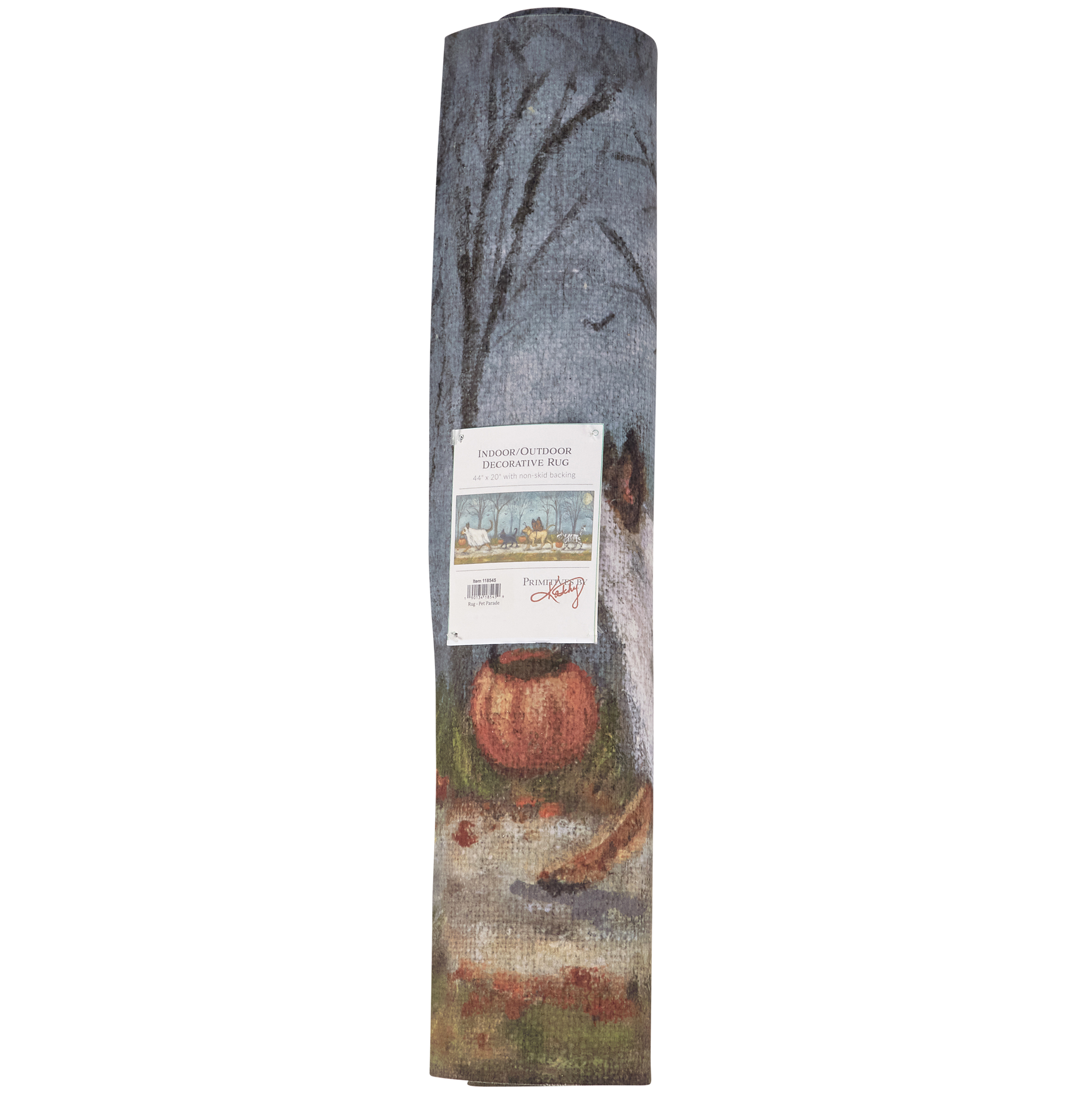 A polyester rug from our Halloween Collection displaying a fun design of pets in various Halloween costumes walking together holding treat buckets. Design is replicated from original artwork painted onto burlap canvas, giving the art a unique depth and texture. Rug can be used indoor or outdoor and features skid-resistant backing to help stay in place. Spot cleaning recommended. Our Spooky Pet Parade rug comes packaged neatly rolled with tag displaying full rug design. A pet-themed seasonal home accent that adds functional style.