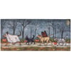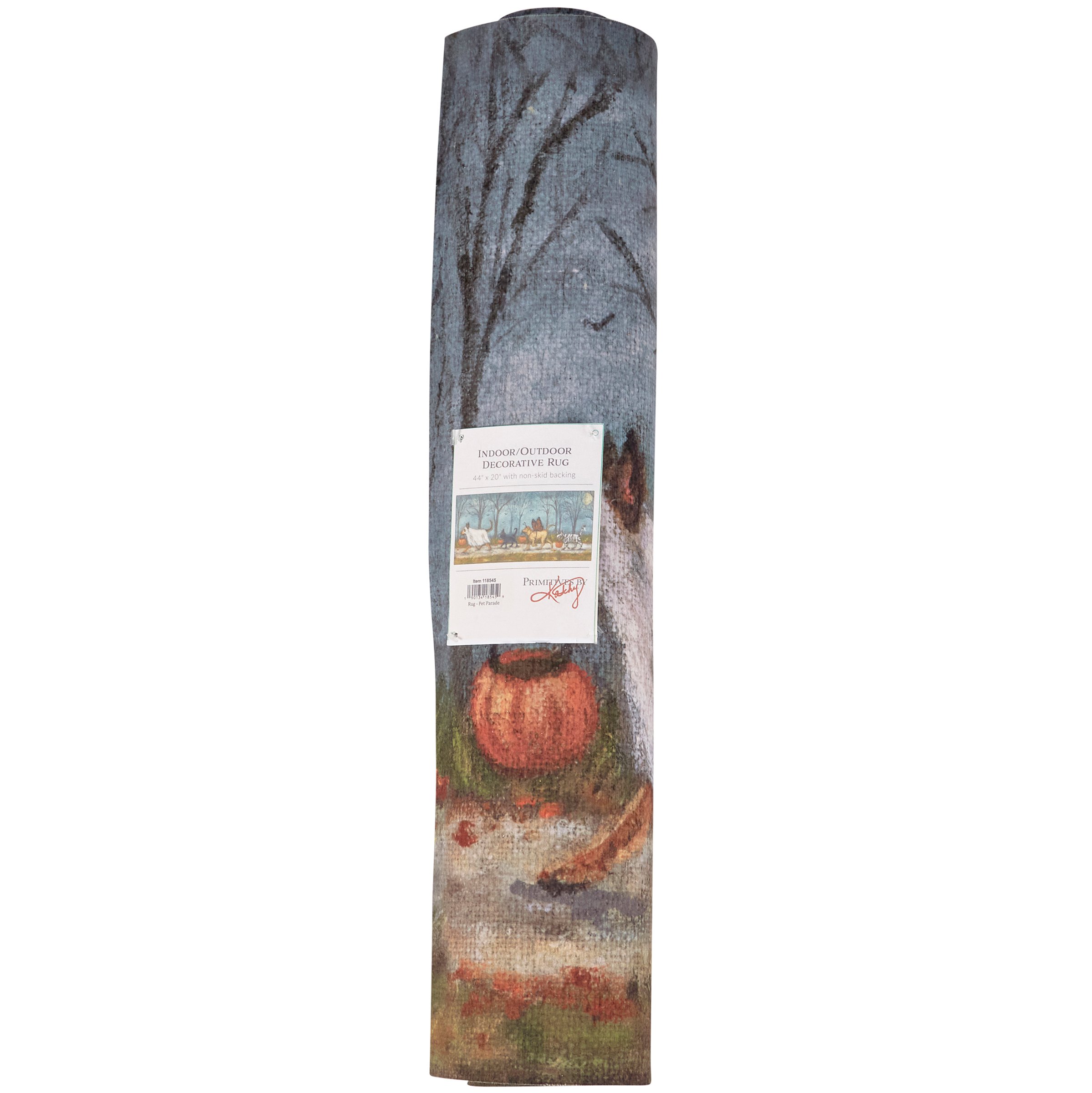 A polyester rug from our Halloween Collection displaying a fun design of pets in various Halloween costumes walking together holding treat buckets. Design is replicated from original artwork painted onto burlap canvas, giving the art a unique depth and texture. Rug can be used indoor or outdoor and features skid-resistant backing to help stay in place. Spot cleaning recommended. Our Spooky Pet Parade rug comes packaged neatly rolled with tag displaying full rug design. A pet-themed seasonal home accent that adds functional style.
