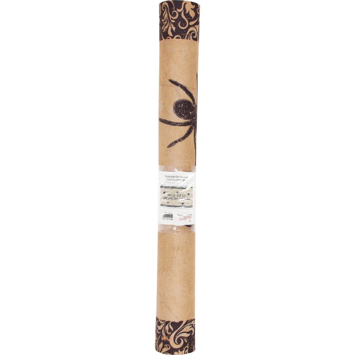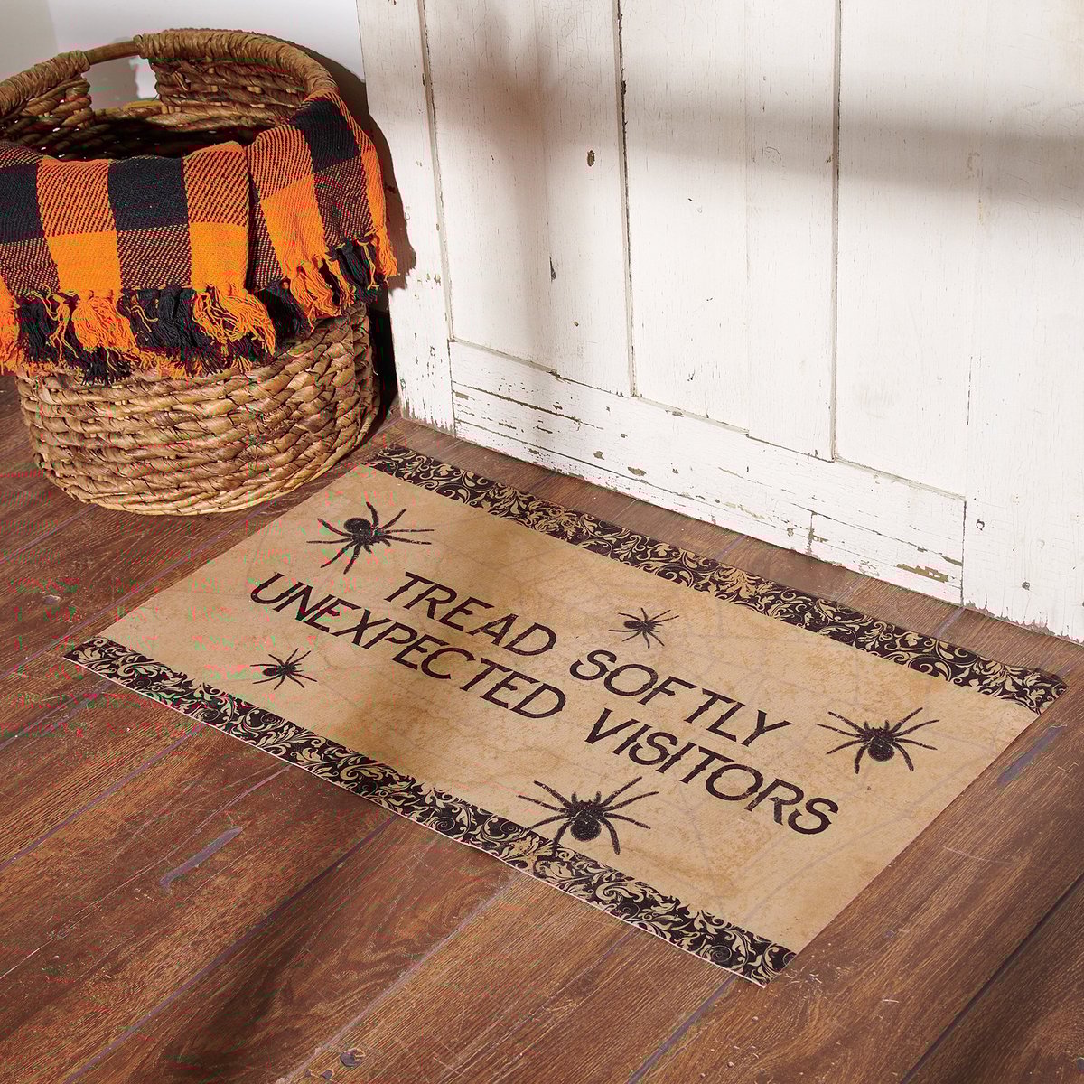 A polyester rug from our Halloween Collection featuring a rustic design with "Tread Softly Unexpected Visitors" sentiment. Features skid-resistant PVC backing and is neatly rolled with a tag displaying full design. Our Tread Softly rug is intended for indoor or sheltered outdoor use. Spot cleaning recommended.