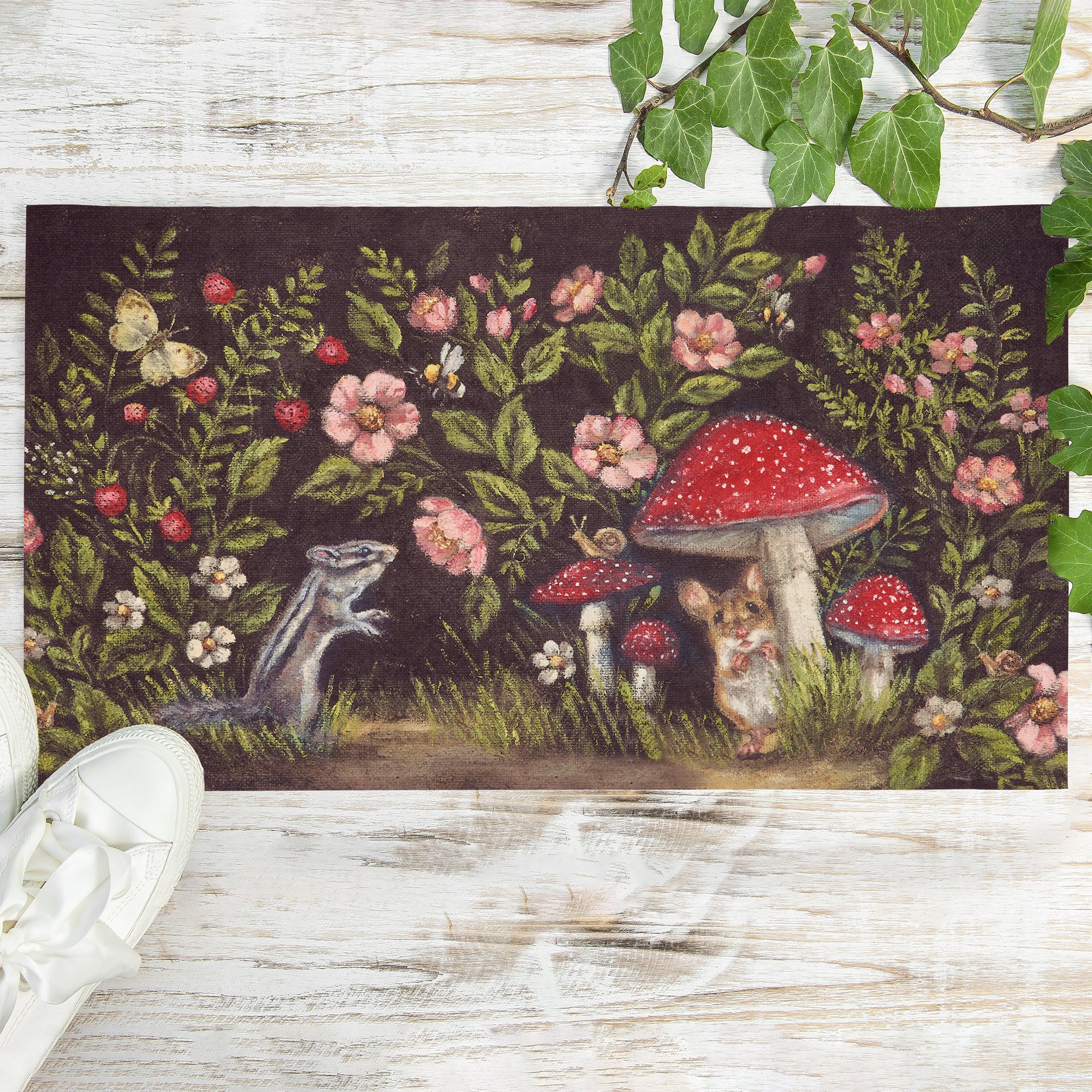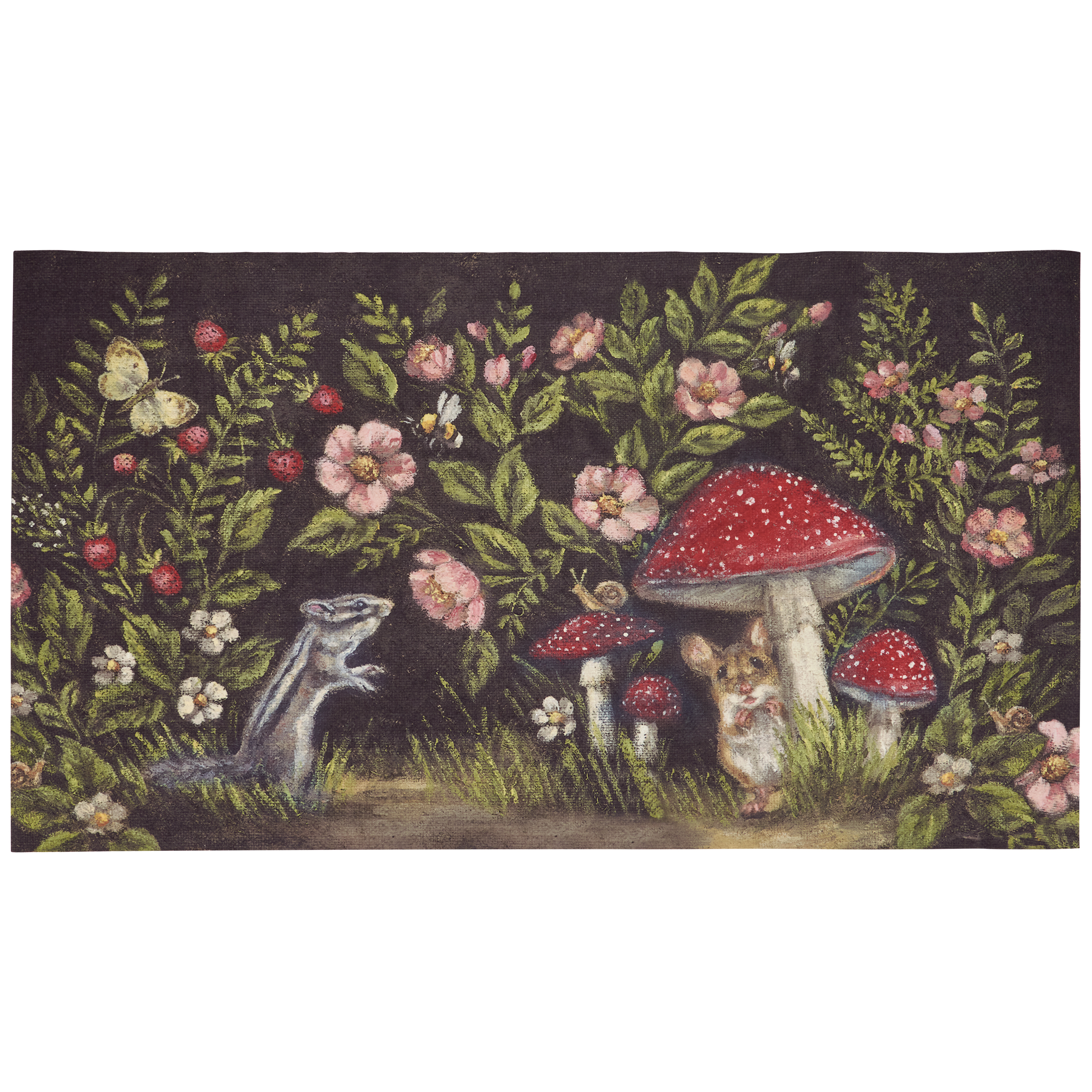 A polyester rug from our Easter & Spring Collection displaying a comforting scene of woodland animals surrounded by spring florals in a moody color palette. Design is replicated from original artwork painted onto burlap canvas, giving the art a unique depth and texture. Rug can be used indoor or outdoor and features skid-resistant backing to help stay in place. Spot cleaning recommended. Our Woodland Friends rug comes packaged neatly rolled with tag displaying full rug design. A stylish seasonal home accent that adds functional style.