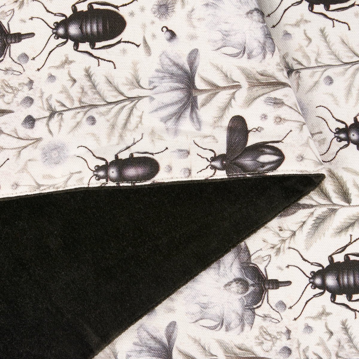 A cotton table runner from our Moody Collection displaying a pattern of beetles and florals with black velvet on the other side. Runner can be used as table décor or as an accent to a home décor display. Our Beetles table runner is conveniently machine-washable for easy cleaning. Includes 52 inches of length for plenty of coverage. A dark academia inspired home accent with a variety of display options.