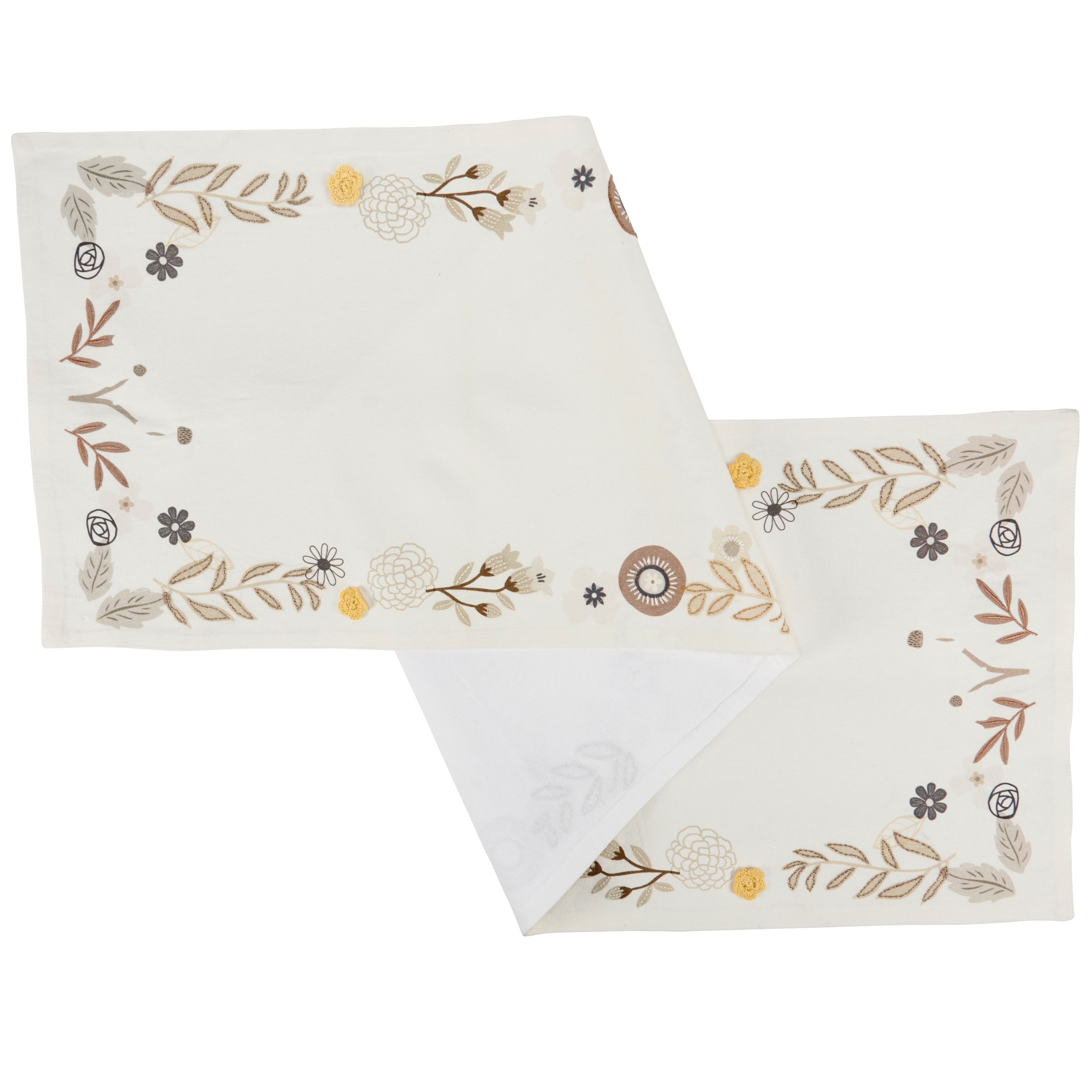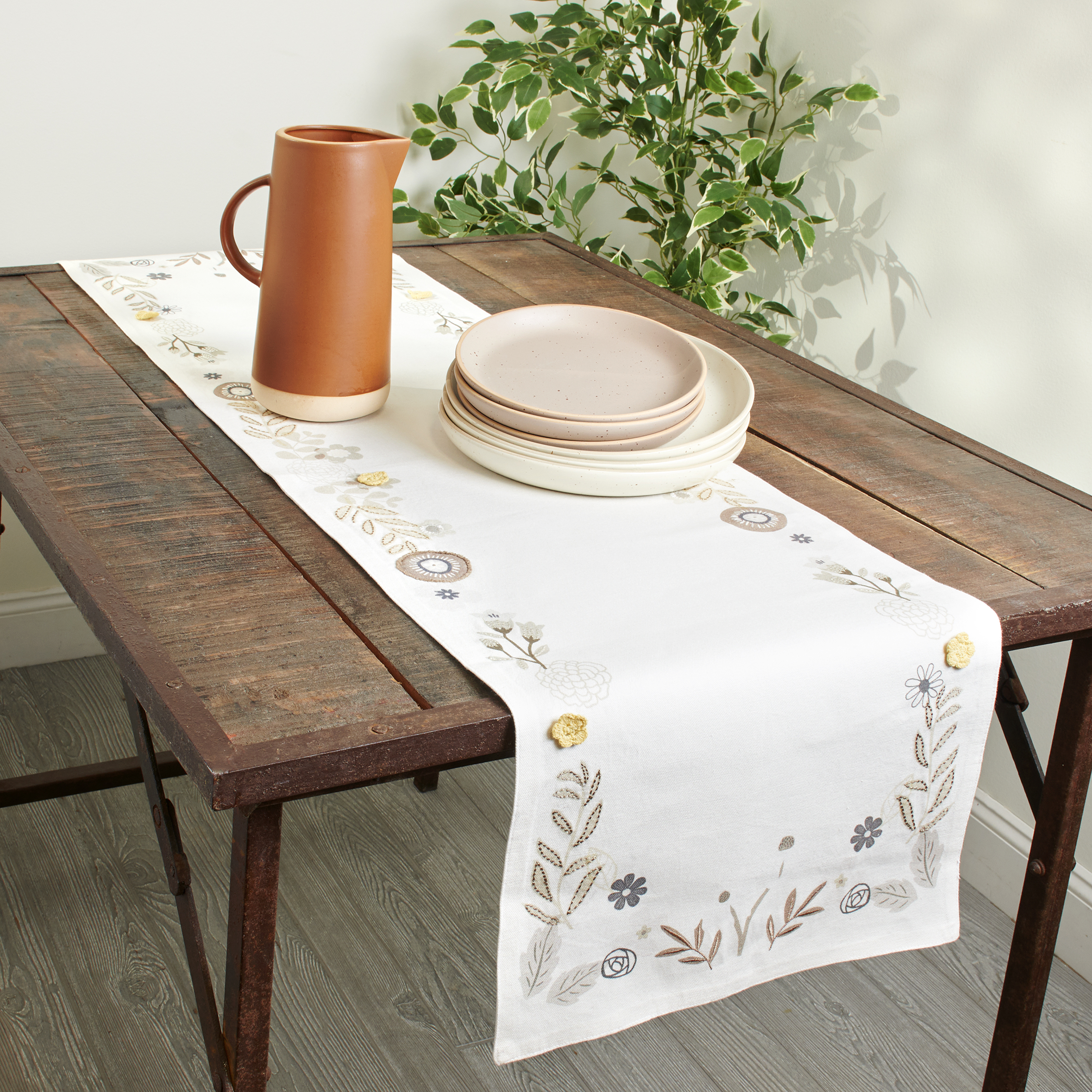 A beige cotton table runner from our Home Collection displaying floral designs along the edges with stitched details and knit flower accents. Floral runner can be used as table décor or as an accent to a home décor display and features 52 inches of length for plenty of coverage. Our Beige Floral runner is conveniently machine-washable for easy cleaning. A floral inspired home accent with a variety of display options.