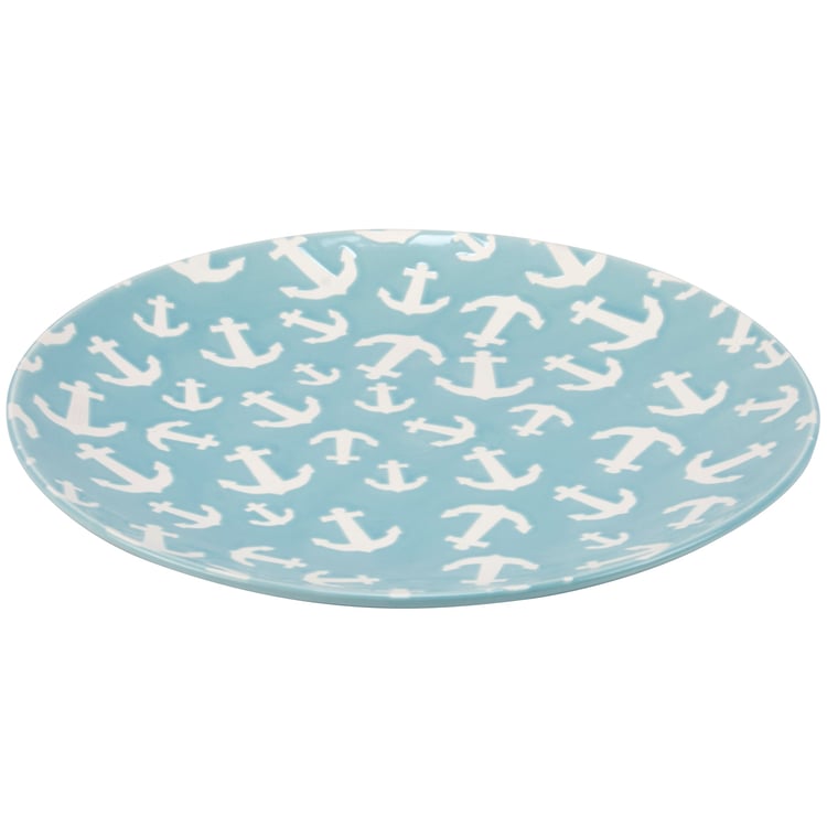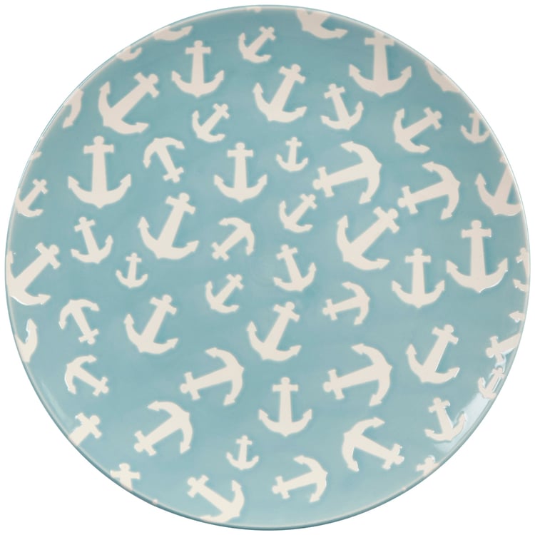 A durable stoneware salad plate from ourĀ Beach Collection displaying an ocean inspired blue glaze with a fun debossed anchor pattern on the inside of the plate. Our Anchors salad plate is conveniently microwave, dishwasher, and food safe for easy use. A piece of rustic dishware perfect for beach-themed tablescapes.