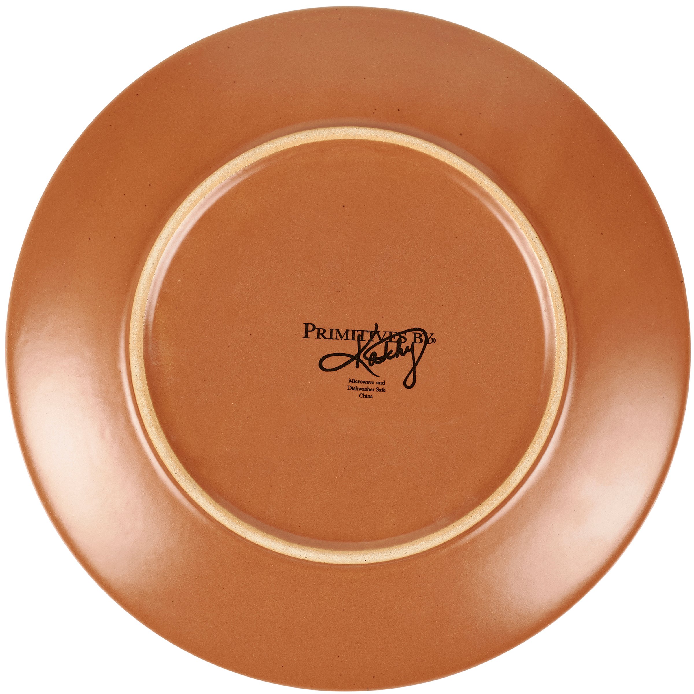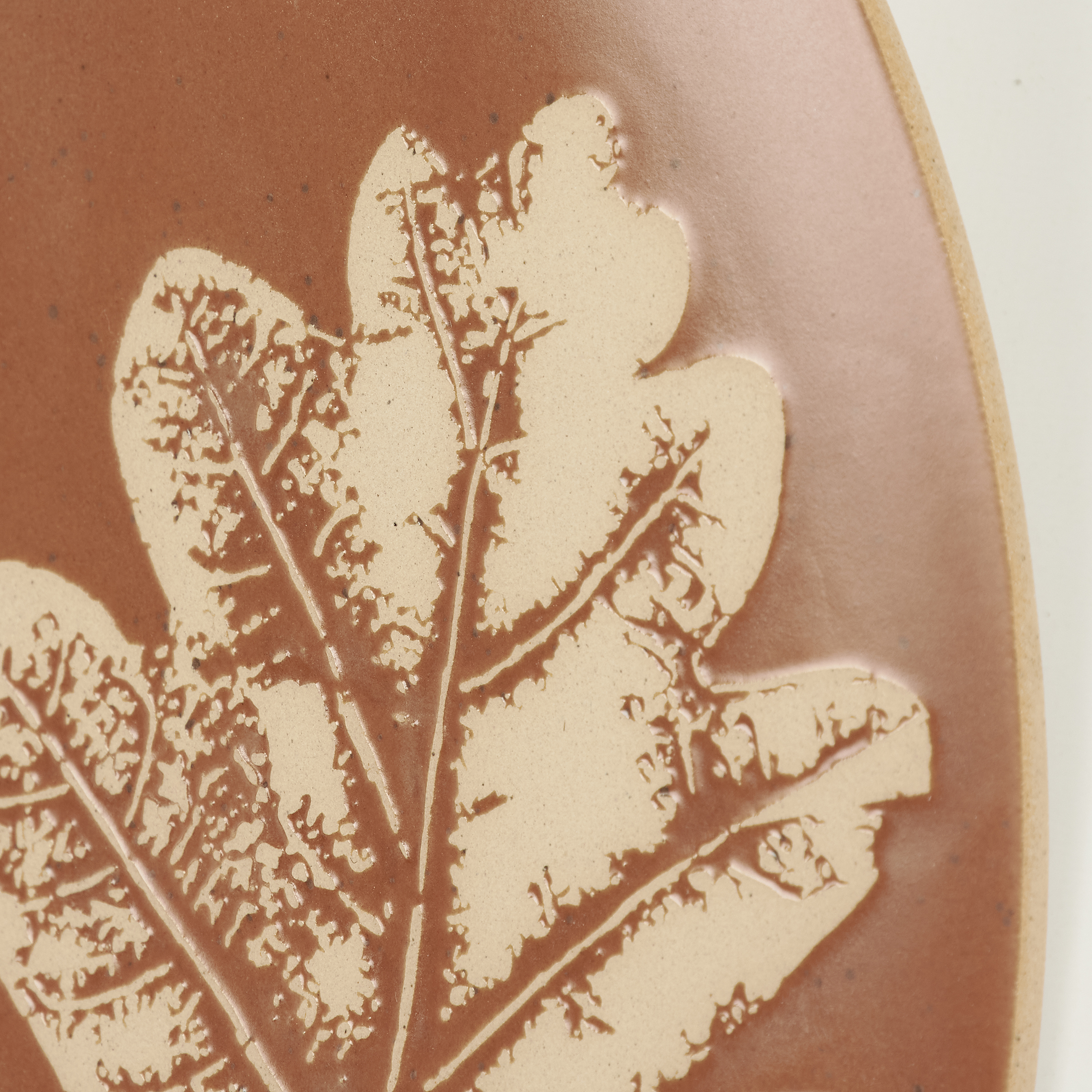 A durable stoneware salad plate from ourĀ Fall & Harvest Collection displaying an autumn brown color with debossed fall leaves in cream on the inside and bare ceramic accents on the rim. Our Fall Leaves salad plate is microwave, dishwasher, and food safe for convenient use. A piece of rustic tableware perfect for seasonal gatherings.