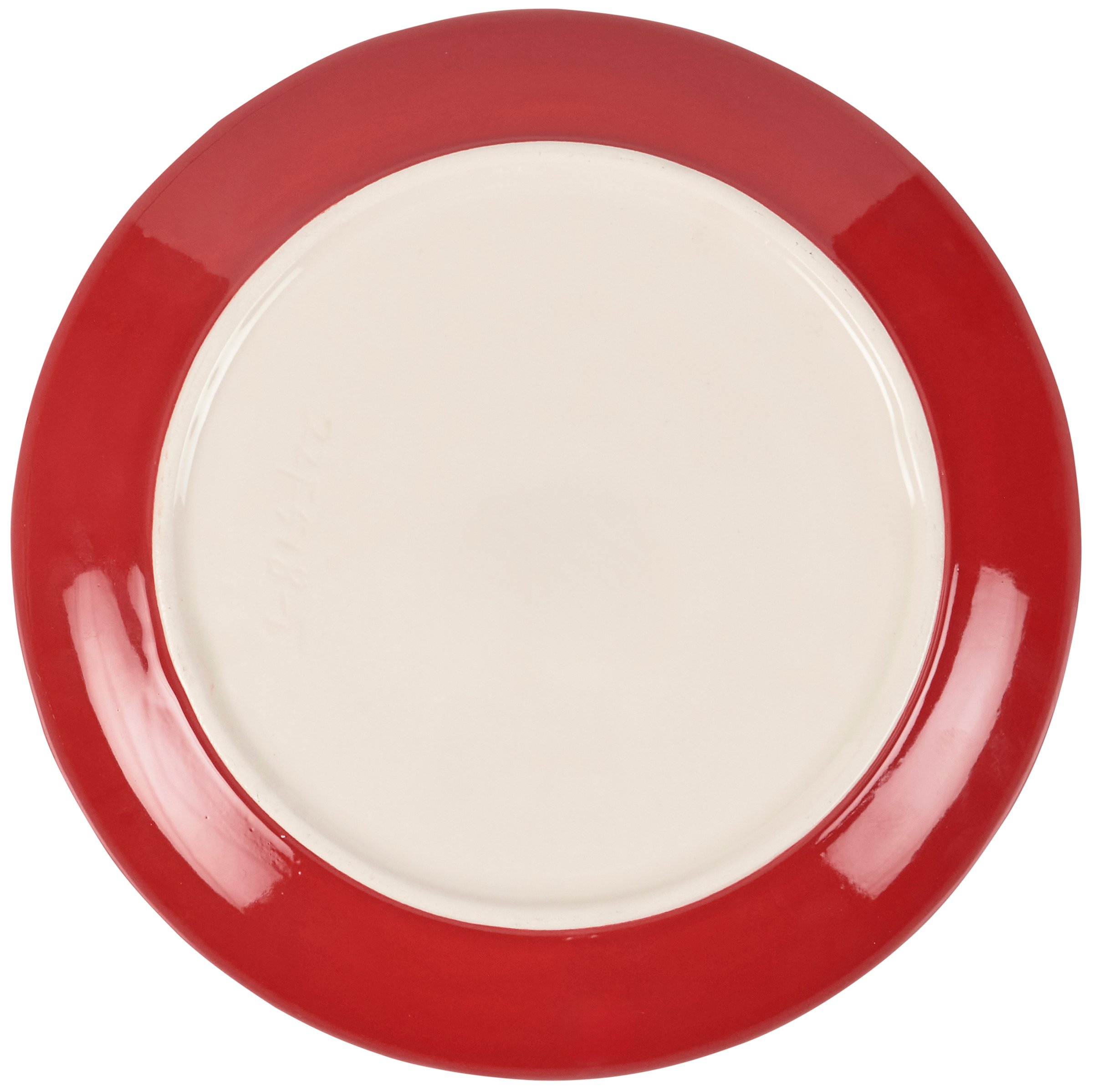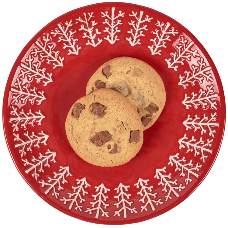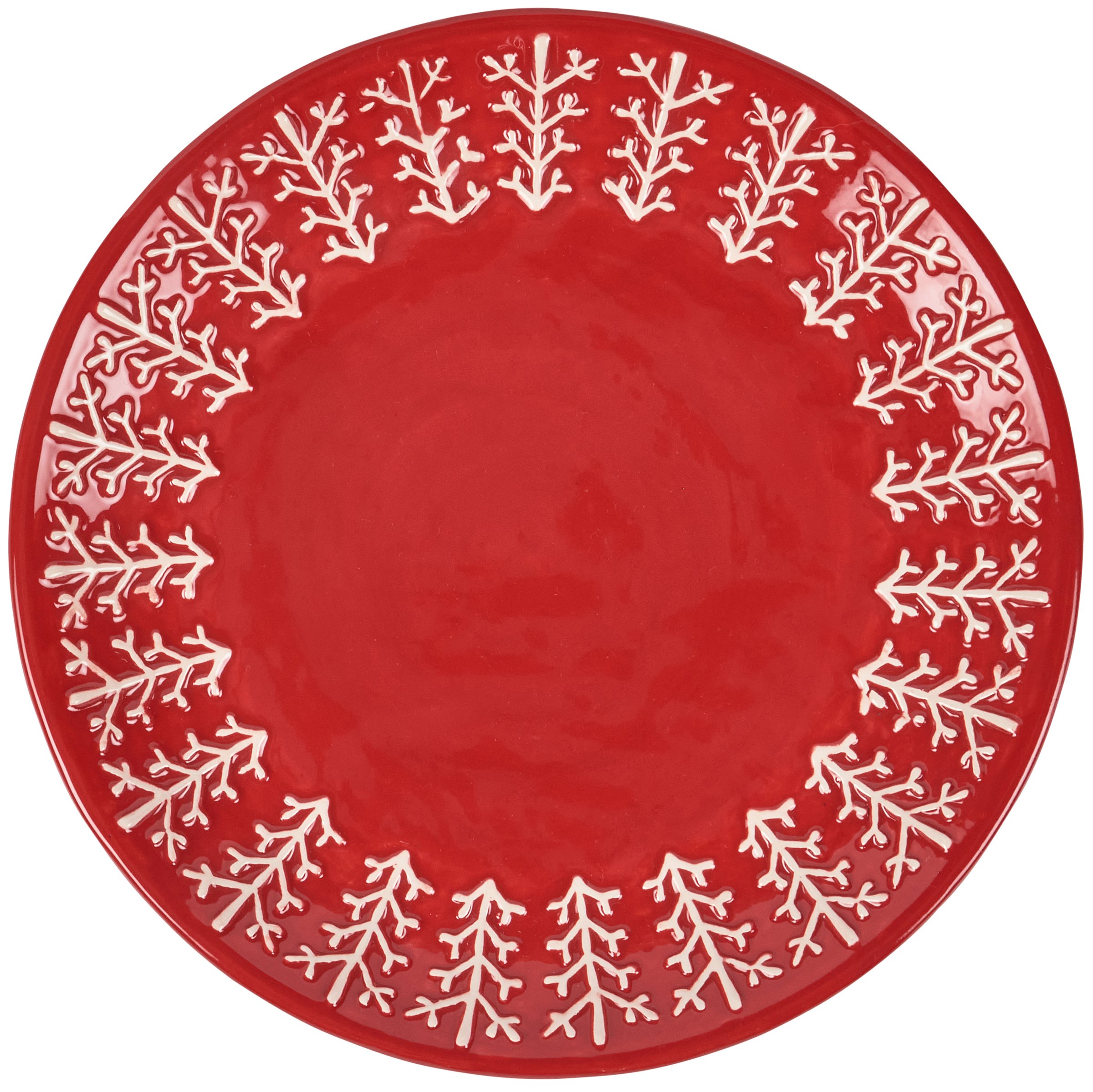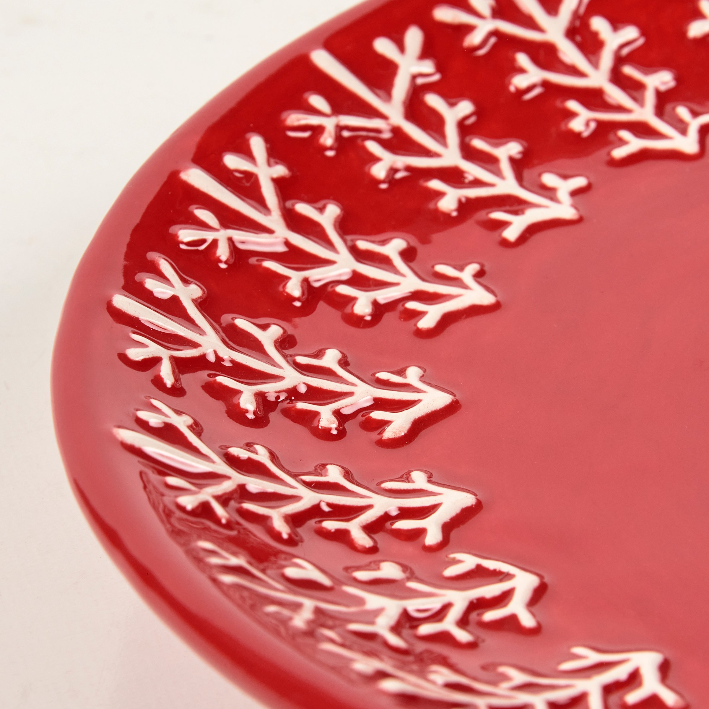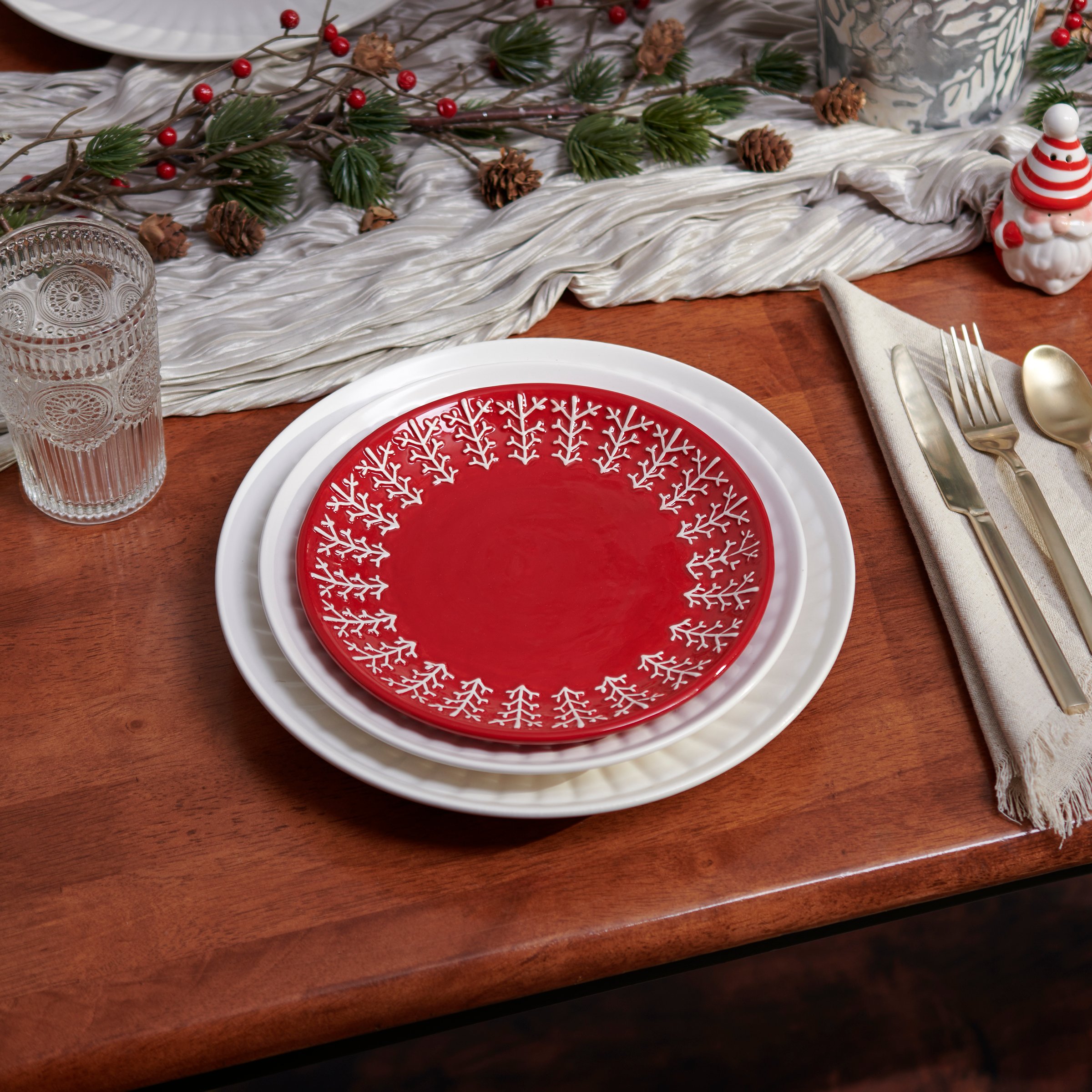 A lightweight, but durable ceramic salad plate from our Christmas Collection displaying a holiday red glaze finish with embossed Nordic inspired tree designs along the inside edge. Embossed designs feature textured detail and holiday white color. Our Nordic Trees salad plate is conveniently microwave, dishwasher, and food safe for easy use. A piece of Christmas tableware perfect for seasonal gatherings.
