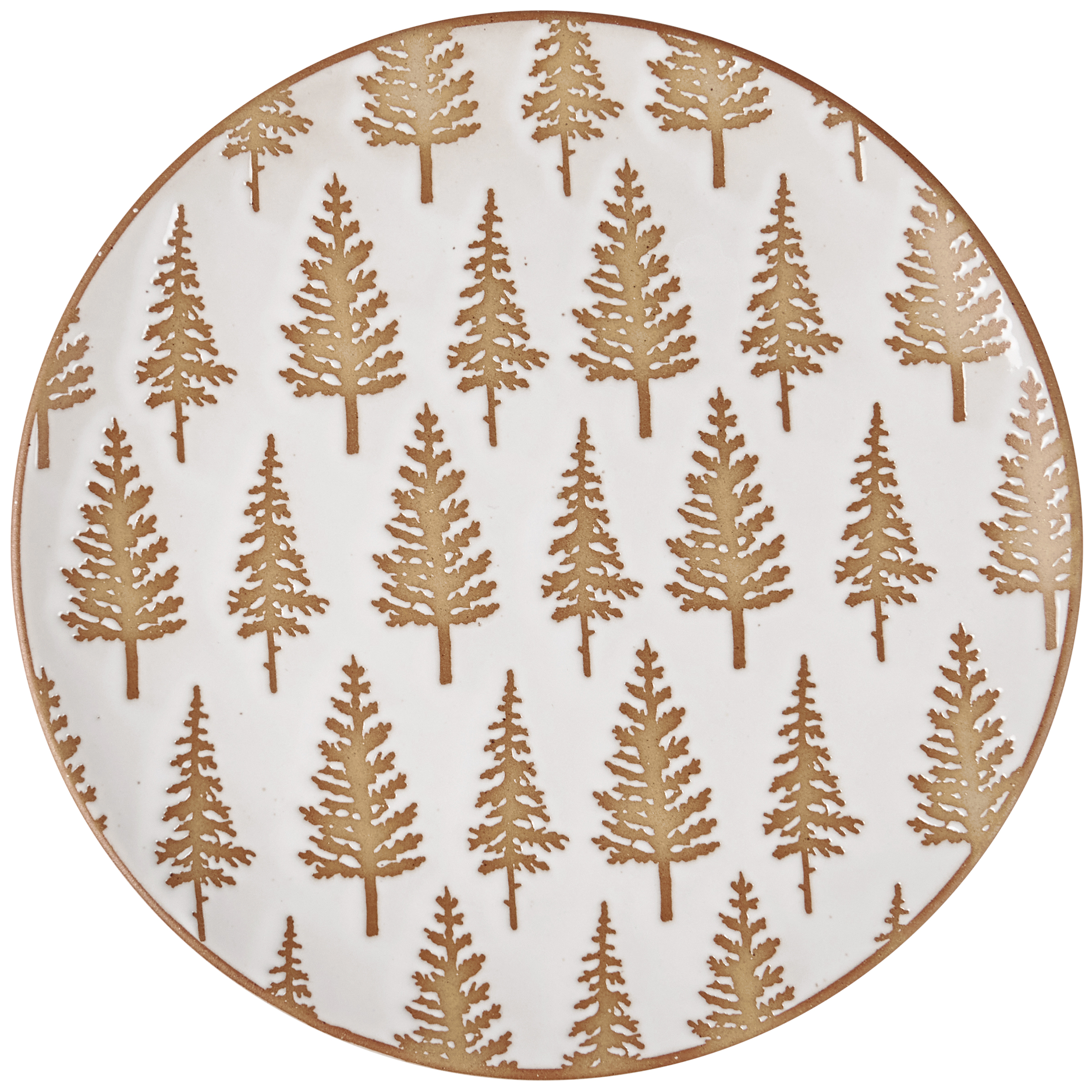 A durable stoneware salad plate from our Christmas Collection displaying a snowy cream color with a debossed brown winter tree pattern. Salad Plate features bare ceramic along the rim. Our Winter salad plate is microwave, dishwasher, and food safe for convenient use. A piece of rustic tableware perfect for seasonal gatherings.