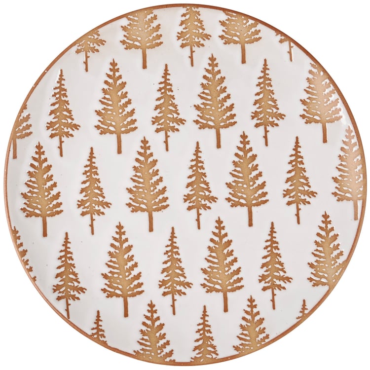 A durable stoneware salad plate from our Christmas Collection displaying a snowy cream color with a debossed brown winter tree pattern. Salad Plate features bare ceramic along the rim. Our Winter salad plate is microwave, dishwasher, and food safe for convenient use. A piece of rustic tableware perfect for seasonal gatherings.