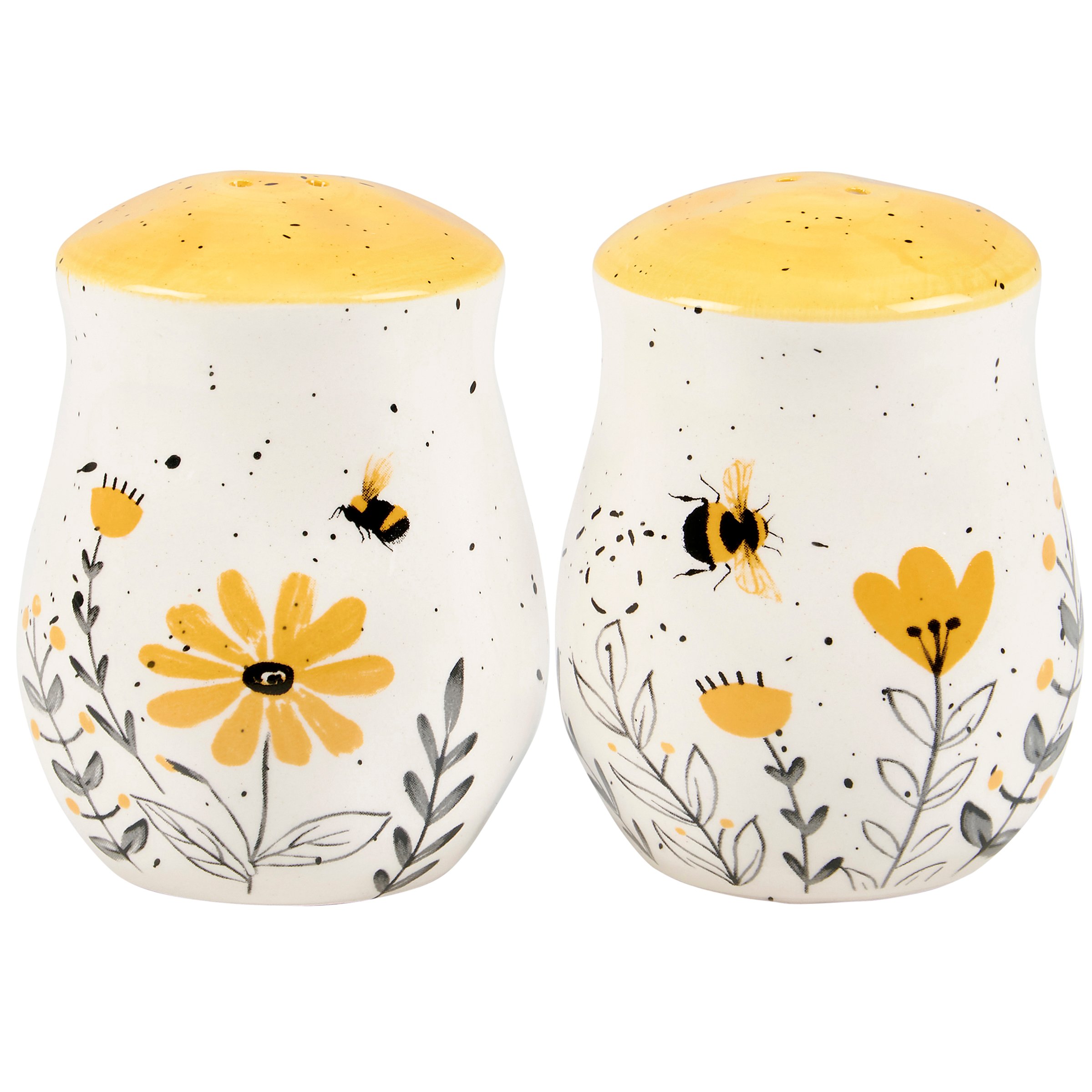 A set of ceramic salt and pepper shakers from our Garden Collection displaying a bee inspired design with handmade details. Designs feature bees buzzing over flowers with yellow accents on the top. Shakers include unique openings to tell them apart as well as plastic stoppers for easy refilling and cleaning. Our Bee salt and pepper shakers are dishwasher and food safe for convenient use. A set of everyday tableware perfect for bee-themed gatherings.