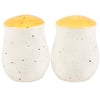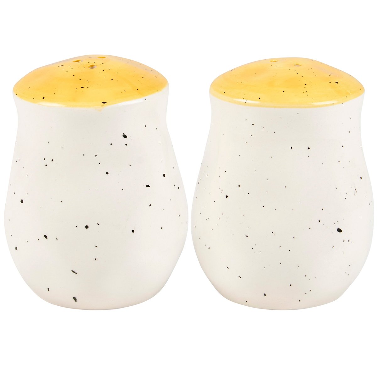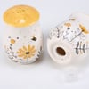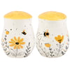 A set of ceramic salt and pepper shakers from our Garden Collection displaying a bee inspired design with handmade details. Designs feature bees buzzing over flowers with yellow accents on the top. Shakers include unique openings to tell them apart as well as plastic stoppers for easy refilling and cleaning. Our Bee salt and pepper shakers are dishwasher and food safe for convenient use. A set of everyday tableware perfect for bee-themed gatherings.