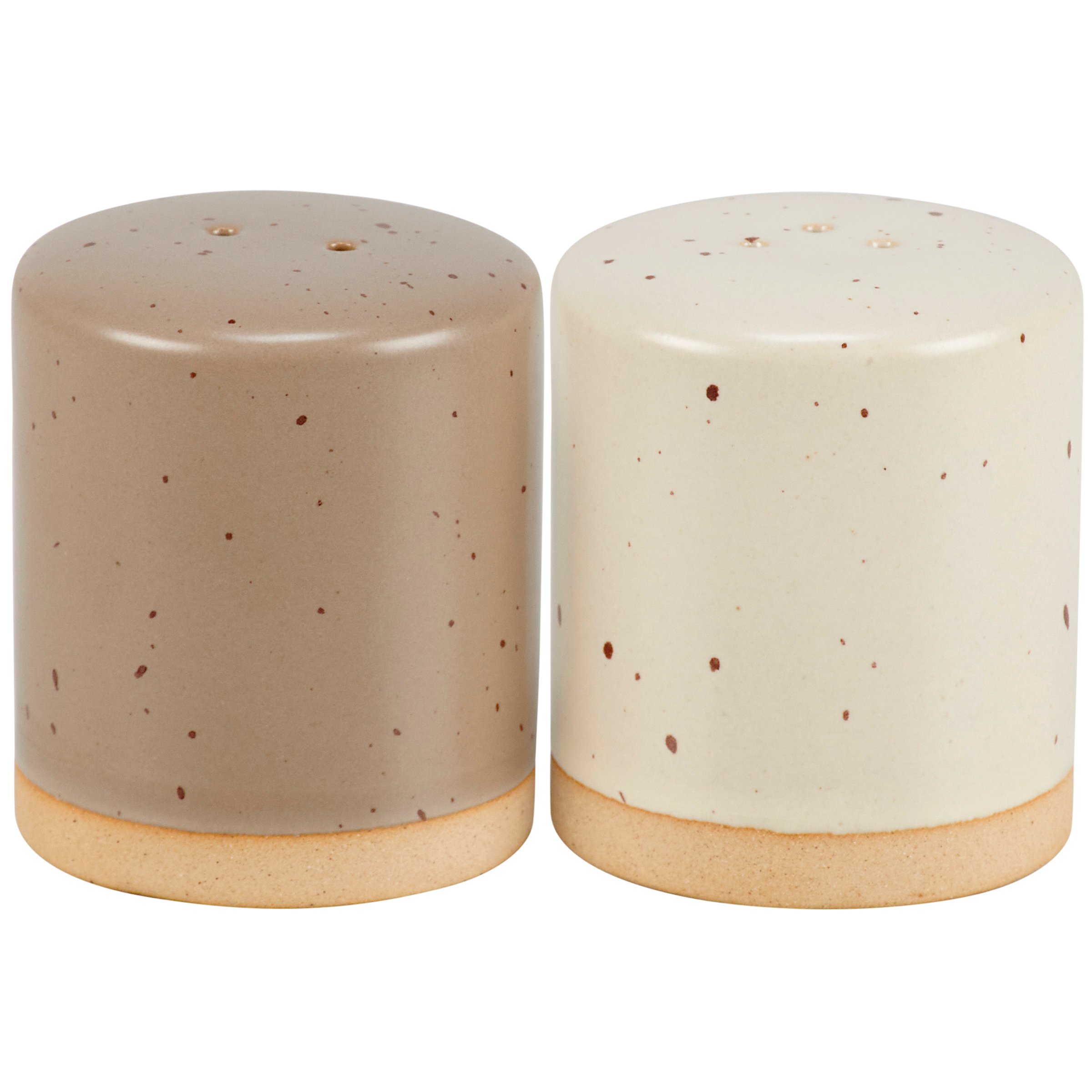 A set of stoneware salt and pepper shakers from our Cottagecore Collection displaying cottage gray and cream color on each with bare ceramic accents. Shakers include unique openings to tell them apart as well as plastic stoppers for easy refilling and cleaning. Our Cottage salt and pepper shakers are dishwasher and food safe for convenient use. A rustic set of tabletop accessories perfect for everyday gatherings.