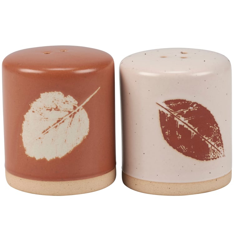 A set of stoneware salt and pepper shakers from ourĀ Fall & Harvest Collection displaying alternating autumn brown and cream colors on each with individual debossed fall leaf designs and bare ceramic accents. Shakers include unique openings to tell them apart as well as plastic stoppers for easy refilling and cleaning. Our Fall Leaves salt and pepper shakers are microwave, dishwasher, and food safe for convenient use. A set of rustic tableware perfect for seasonal gatherings.
