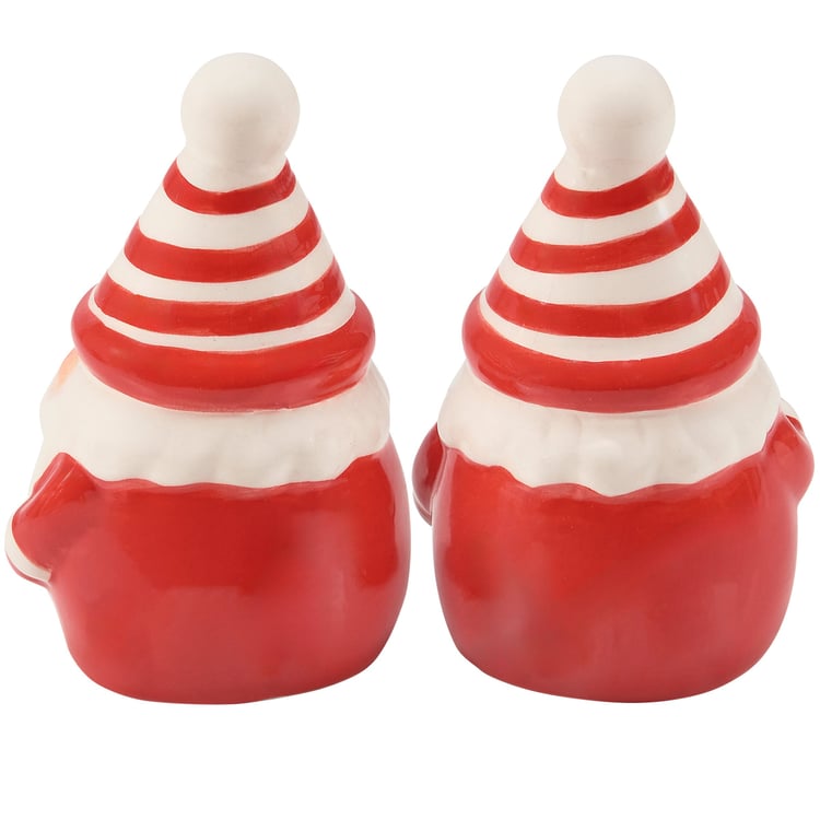 A set of ceramic salt and pepper shakers from our Christmas Collection displaying a Nordic inspired Santa design with colorful glaze finish. Our Nordic Santas salt and pepper shakers include unique openings to tell them apart as well as plastic stoppers for easy refilling and cleaning. Hand wash only. A fun set of tabletop accessories perfect for seasonal gatherings.
