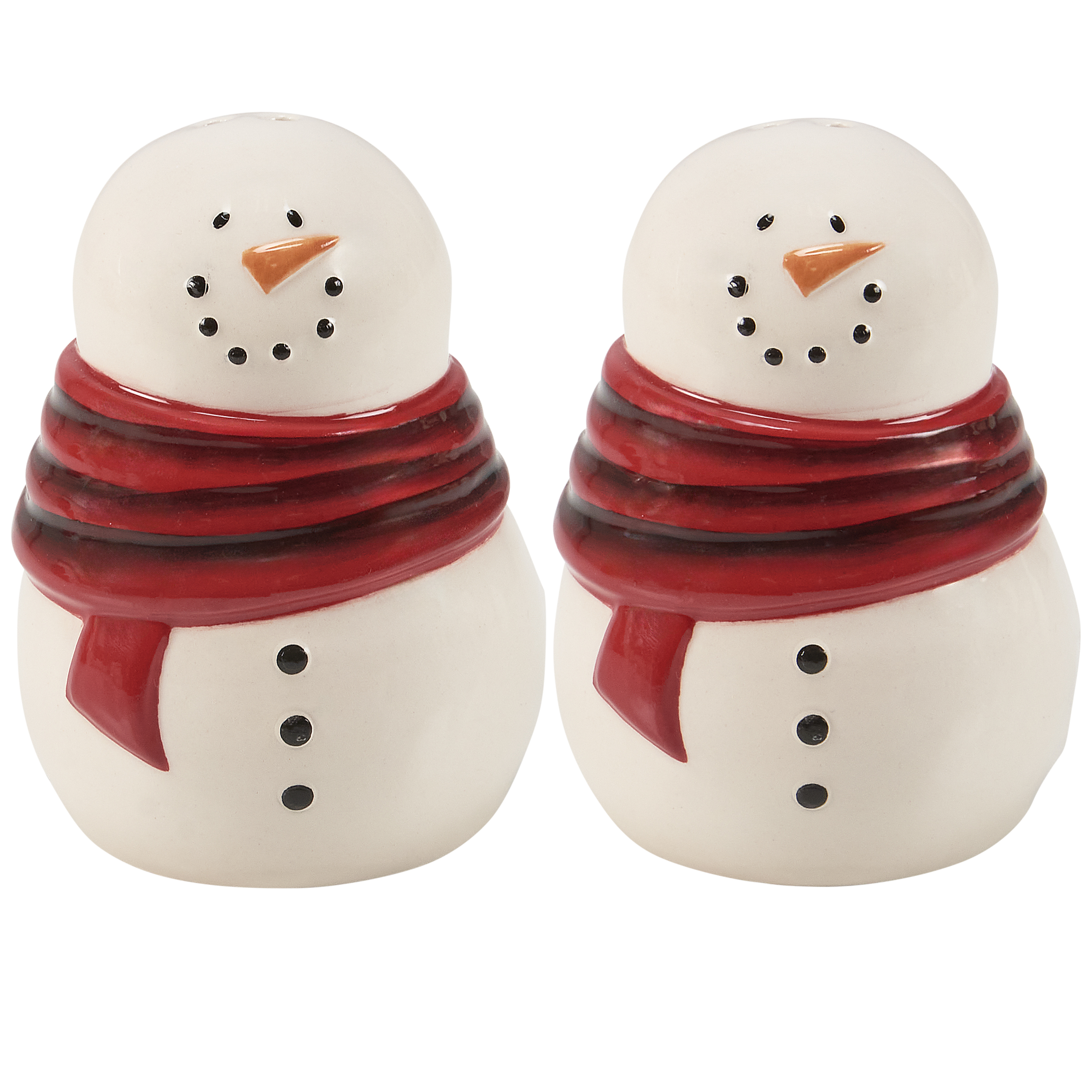 A set of ceramic salt and pepper shakers from our Christmas Collection displaying a happy snowman design with colorful glaze finish. Our Snowmen salt and pepper shakers include unique openings to tell them apart as well as plastic stoppers for easy refilling and cleaning. Hand wash only. A fun set of tabletop accessories perfect for seasonal gatherings.