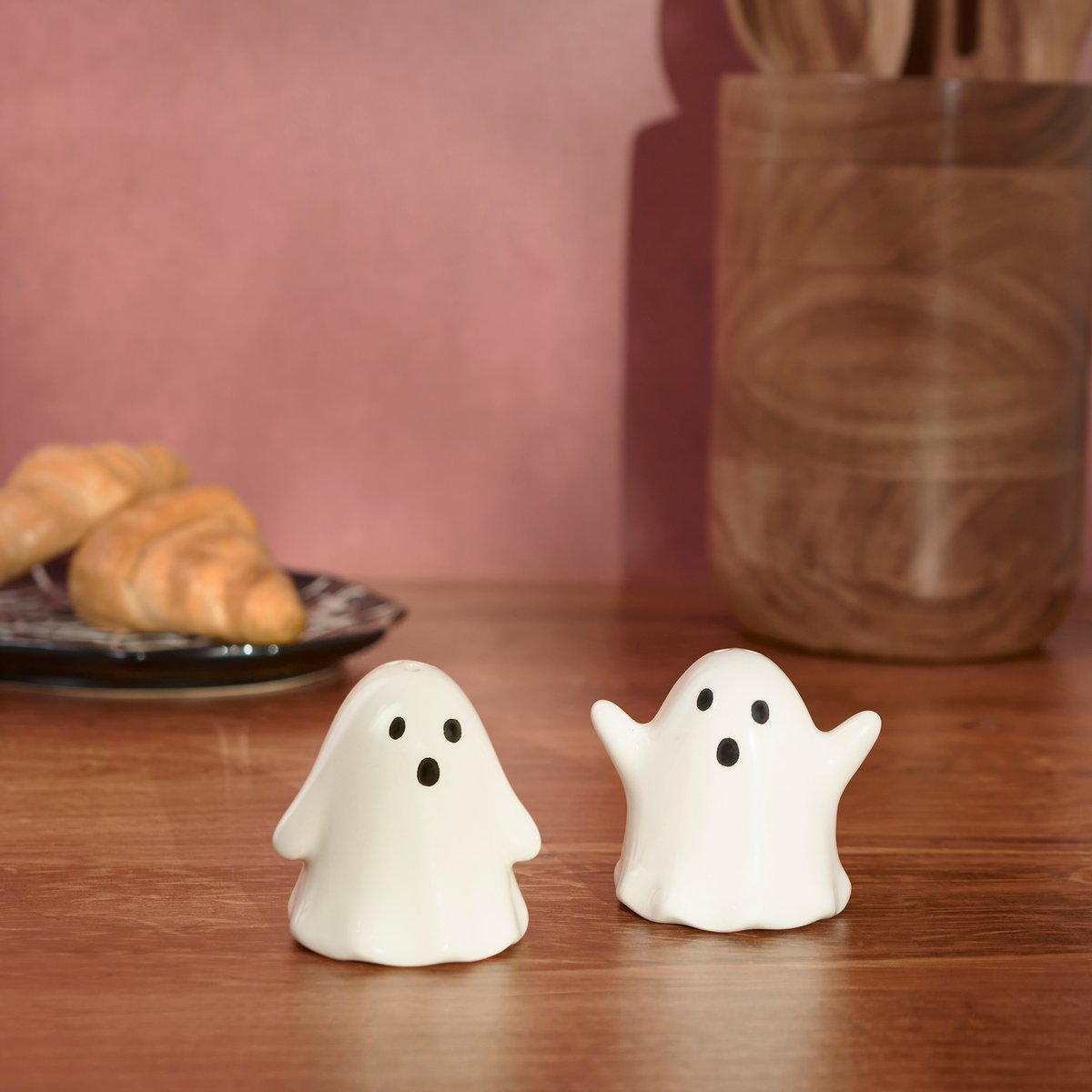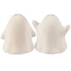 A set of ceramic salt and pepper shakers from our Halloween Collection displaying a fun pair of ghosts in different poses with simple face detail and white glaze finish. Our Ghost Pair salt and pepper shakers include plastic stoppers for easy refilling and cleaning. Hand wash only. A fun set of tabletop accessories perfect for seasonal gatherings.