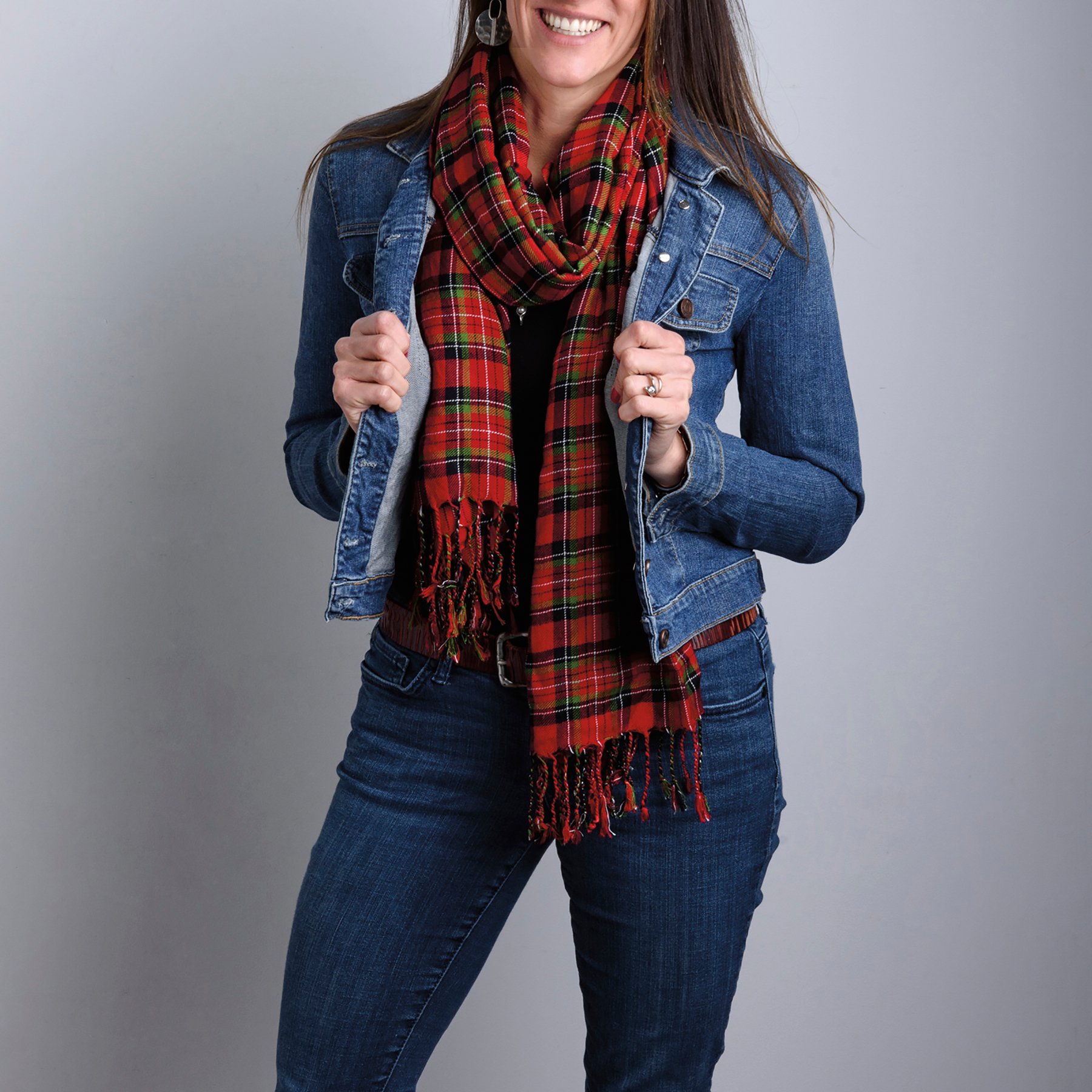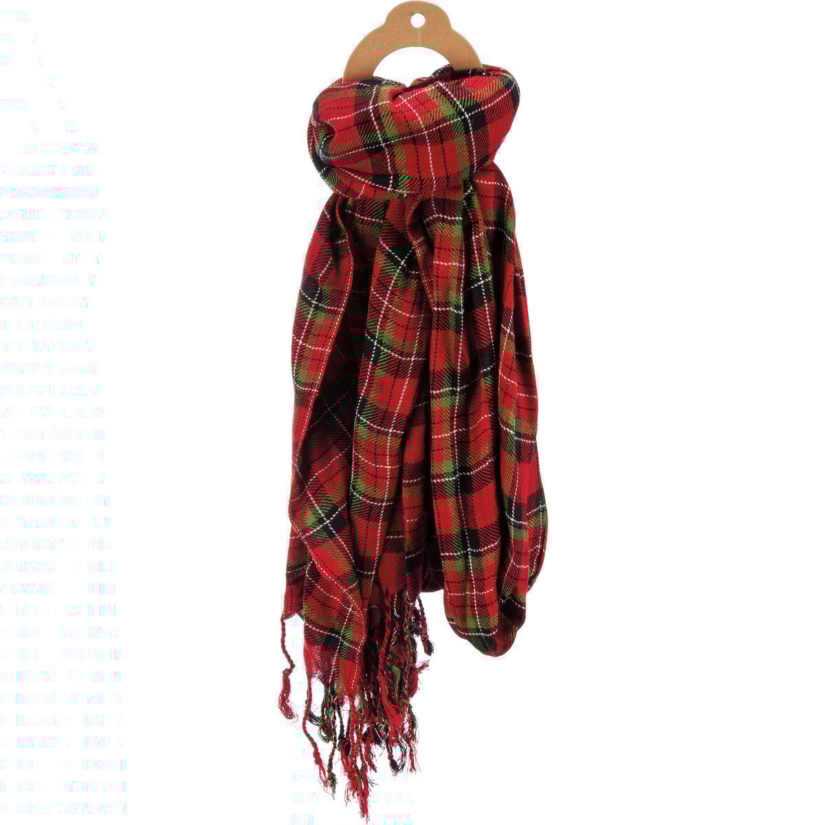 This unisex woven scarf features an all-over red & black plaid design and tassel accents for added interest. Dry clean only. Neatly packaged on a cardboard hanger with a hole to easily hang on rack. Scarf pairs well with coordinating pet bow ties and bandanas so pet parents and their fur babies can have a sweet matching moment.