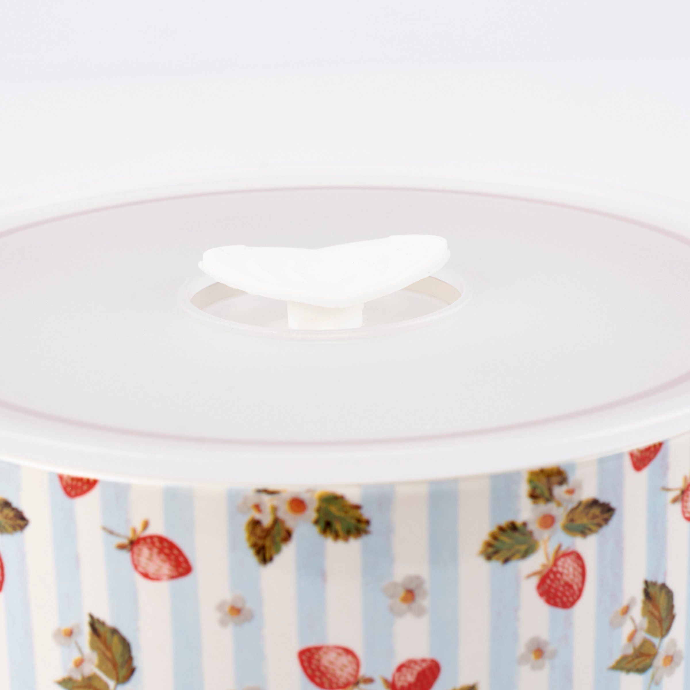 A set of ceramic serveware from our Garden Collection displaying wild strawberry inspired patterns replicated from original hand pained artwork in a unique watercolor style. Set includes 3 servers in different sizes with plastic lids that feature a convenient venting lid. Our Strawberry server set is microwave, oven, dishwasher, and food safe for easy use. A charming strawberry-themed set of serveware perfect for everyday use.