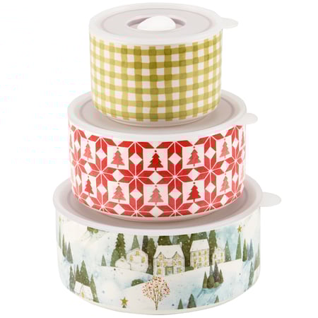 A set of ceramic serveware from our Christmas Collection displaying coordinating winter inspired patterns replicated from original hand pained artwork in a delicate watercolor style. Set includes 3 servers in different sizes with plastic lids that feature a convenient venting lid. Our Winter Wonderland server set is microwave, oven, dishwasher, and food safe for easy use. A winter-themed set of serveware perfect for seasonal use.