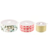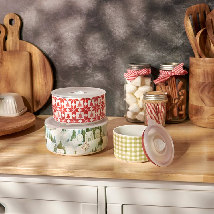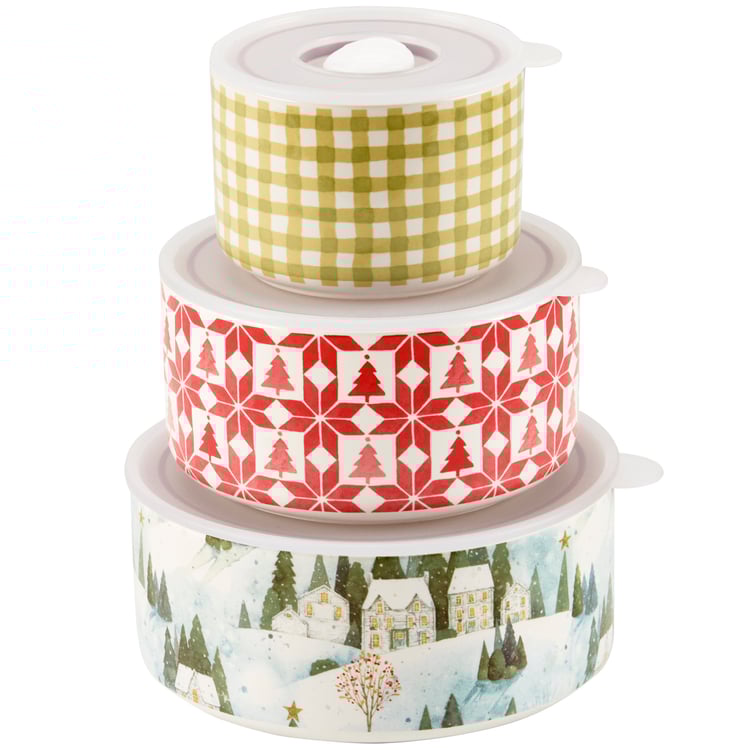 A set of ceramic serveware from our Christmas Collection displaying coordinating winter inspired patterns replicated from original hand pained artwork in a delicate watercolor style. Set includes 3 servers in different sizes with plastic lids that feature a convenient venting lid. Our Winter Wonderland server set is microwave, oven, dishwasher, and food safe for easy use. A winter-themed set of serveware perfect for seasonal use.