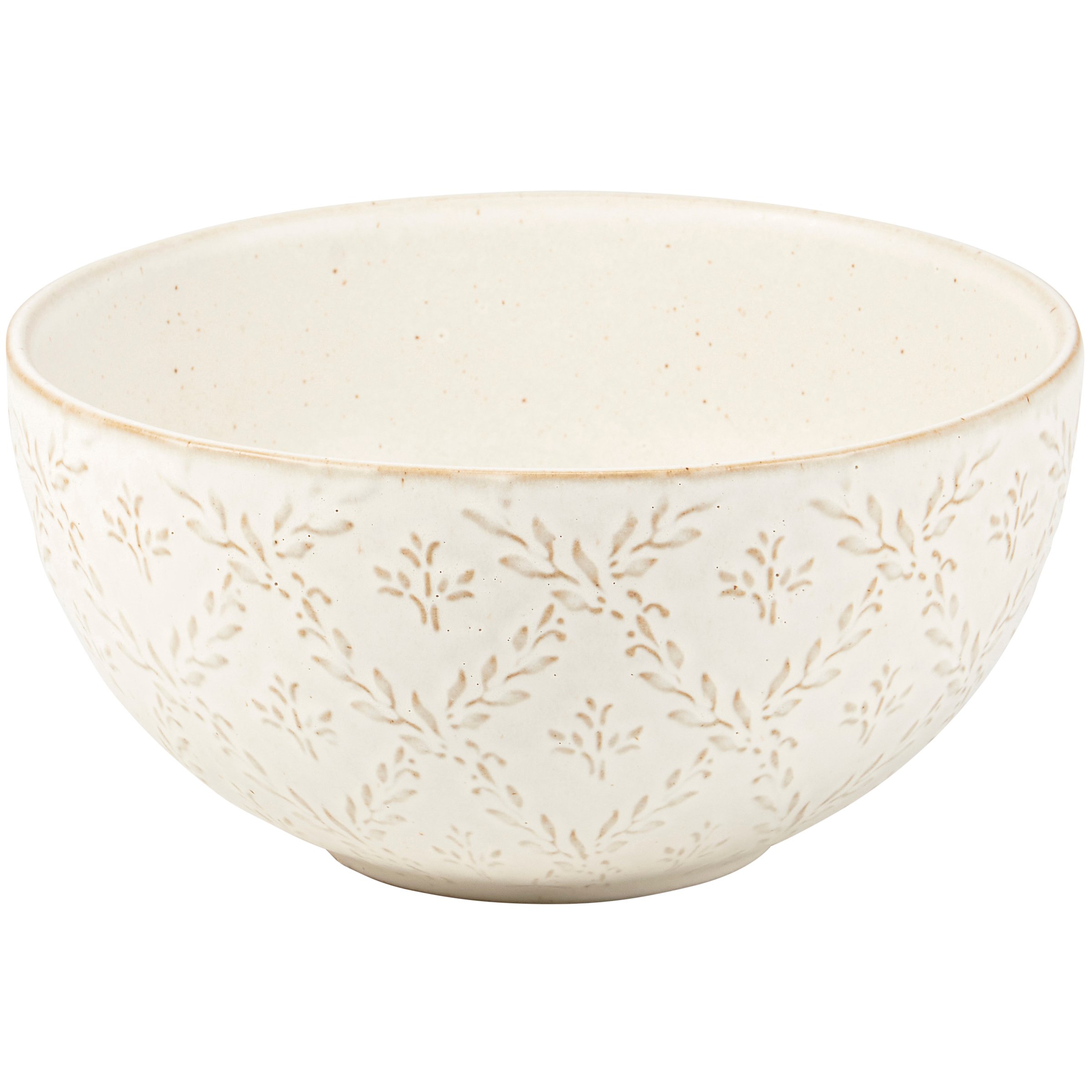 A durable ceramic serving bowl from our Cottagecore Collection displaying a cream glaze finish with embossed patterns of plant vines around the bowl. Embossed vine designs come through the glaze for textured detail. Our Cottage Vine serving bowl features a neutral color palette to easily coordinate with a variety of table décor. Hand wash only. An elegant piece of tableware perfect for everyday gatherings.