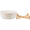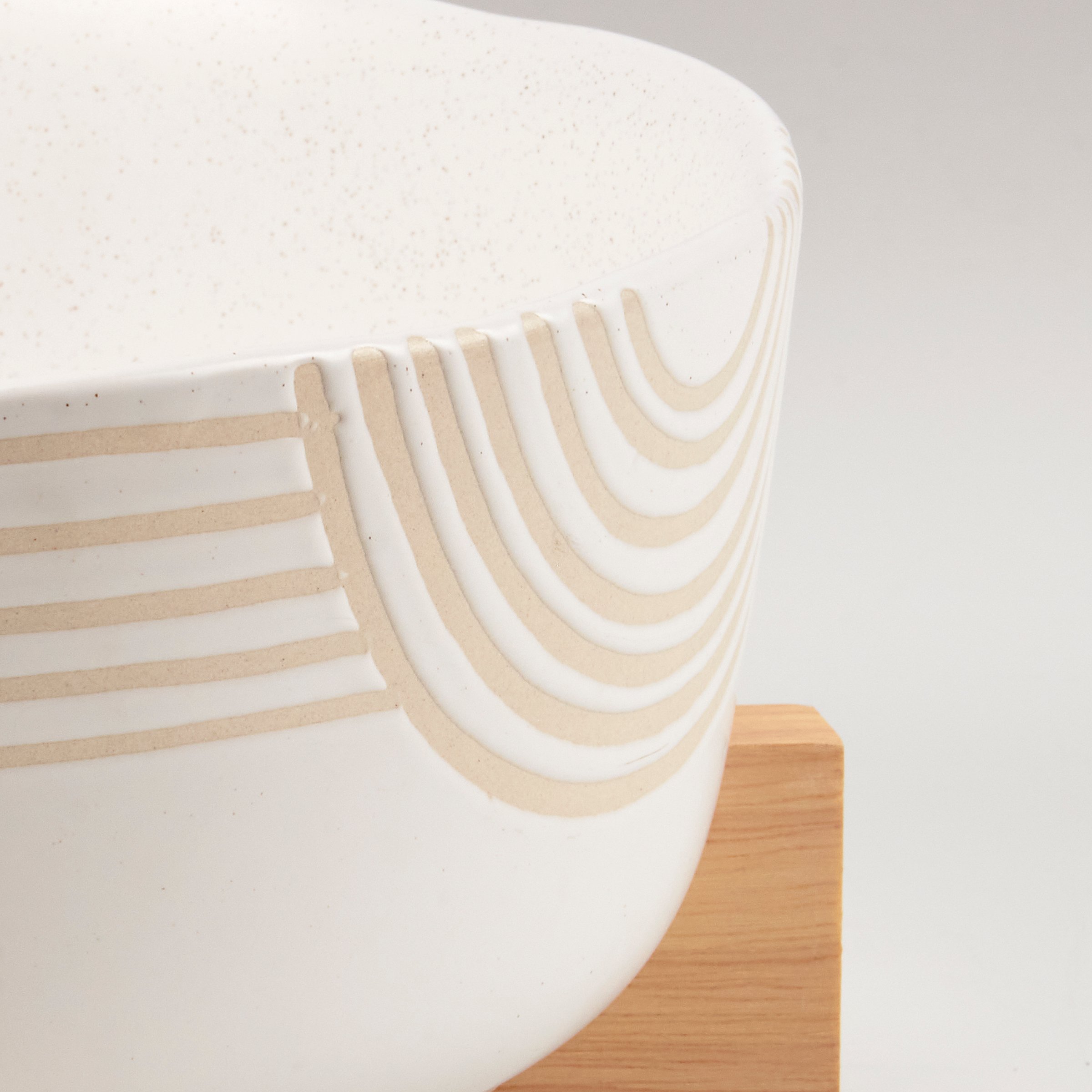 A stoneware serving bowl set from our Tabletop Collection including a serving bowl displaying a cream glaze finish with bare ceramic designs and a natural wood stand to set the bowl on. Bowl design features a neutral color palette to coordinate with a variety of styles. Our Share serving bowl is microwave, oven, dishwasher, and food safe for convenient use. A stylish piece of tableware perfect for everyday gatherings.