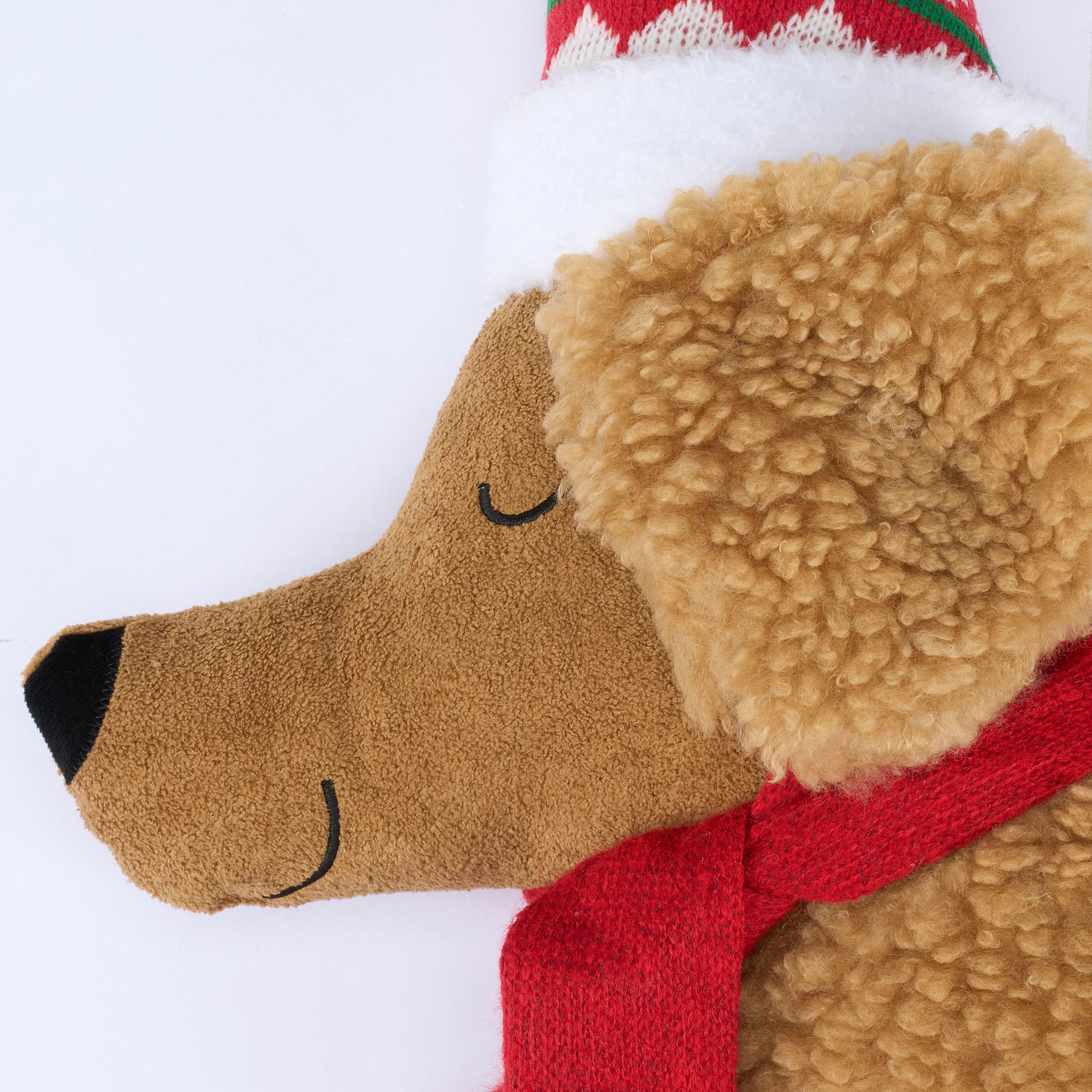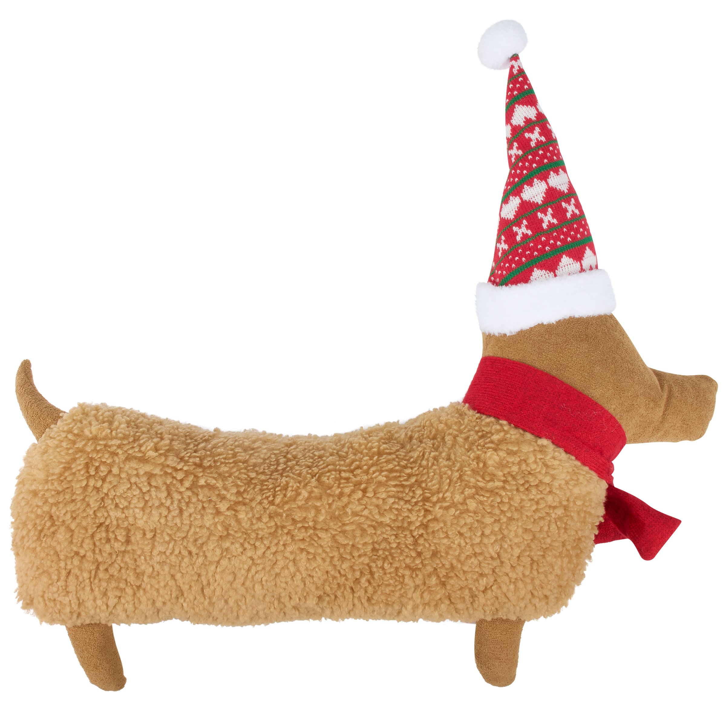 A decorative pillow from our Holiday Collection in the shape of a dachshund with winter hat and scarf. Our Winter Dachshund shaped pillow features a plush texture to create the look and feel of dog fur with embroidered face details. This pet Christmas shaped pillow contains polyester filling and is for decorative use only; not a toy. A fun pet themed home accent perfect for adding seasonal style to any space.