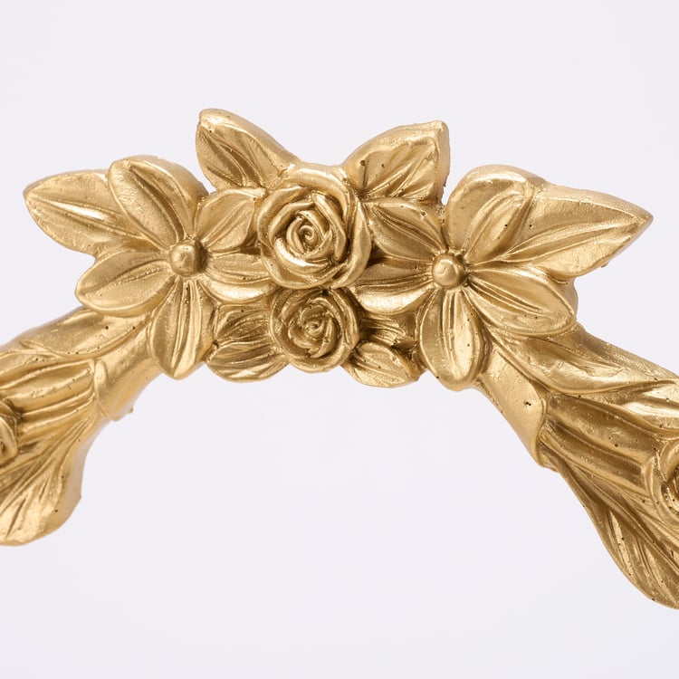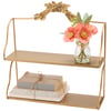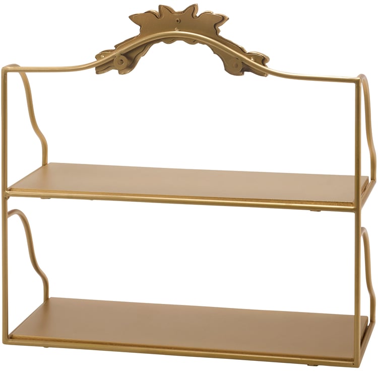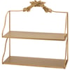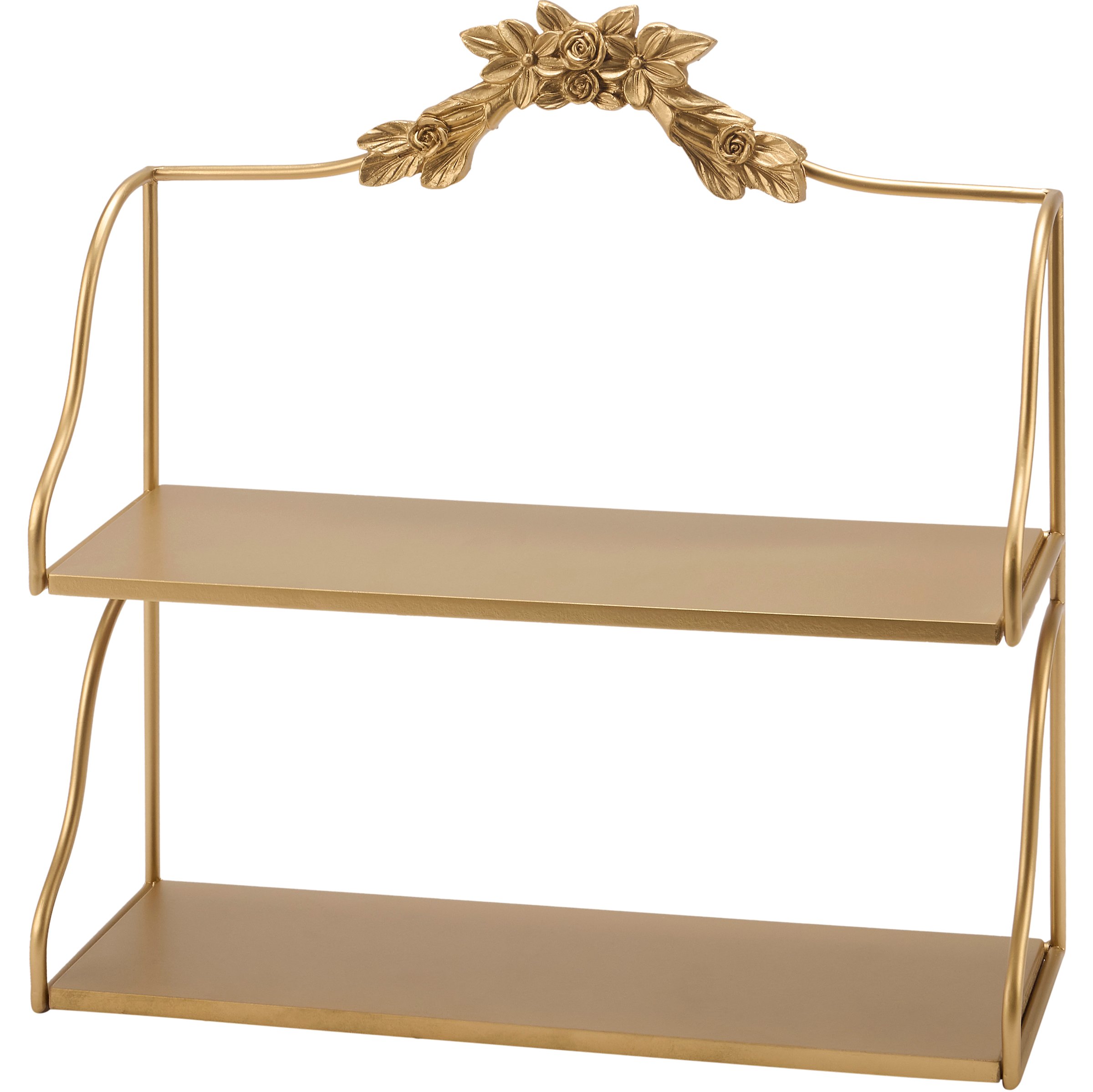 A wall shelf from our Art Nouveau Collection featuring a two-tier shelf design with metallic gold finish and art nouveau inspired sculpted floral accent at the top. Our Nouveau shelf is easy to hang for display via metal hangers on the back. Accessories pictured not included. A stylish vintage home accent perfect for home or office organization.