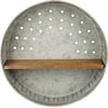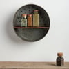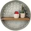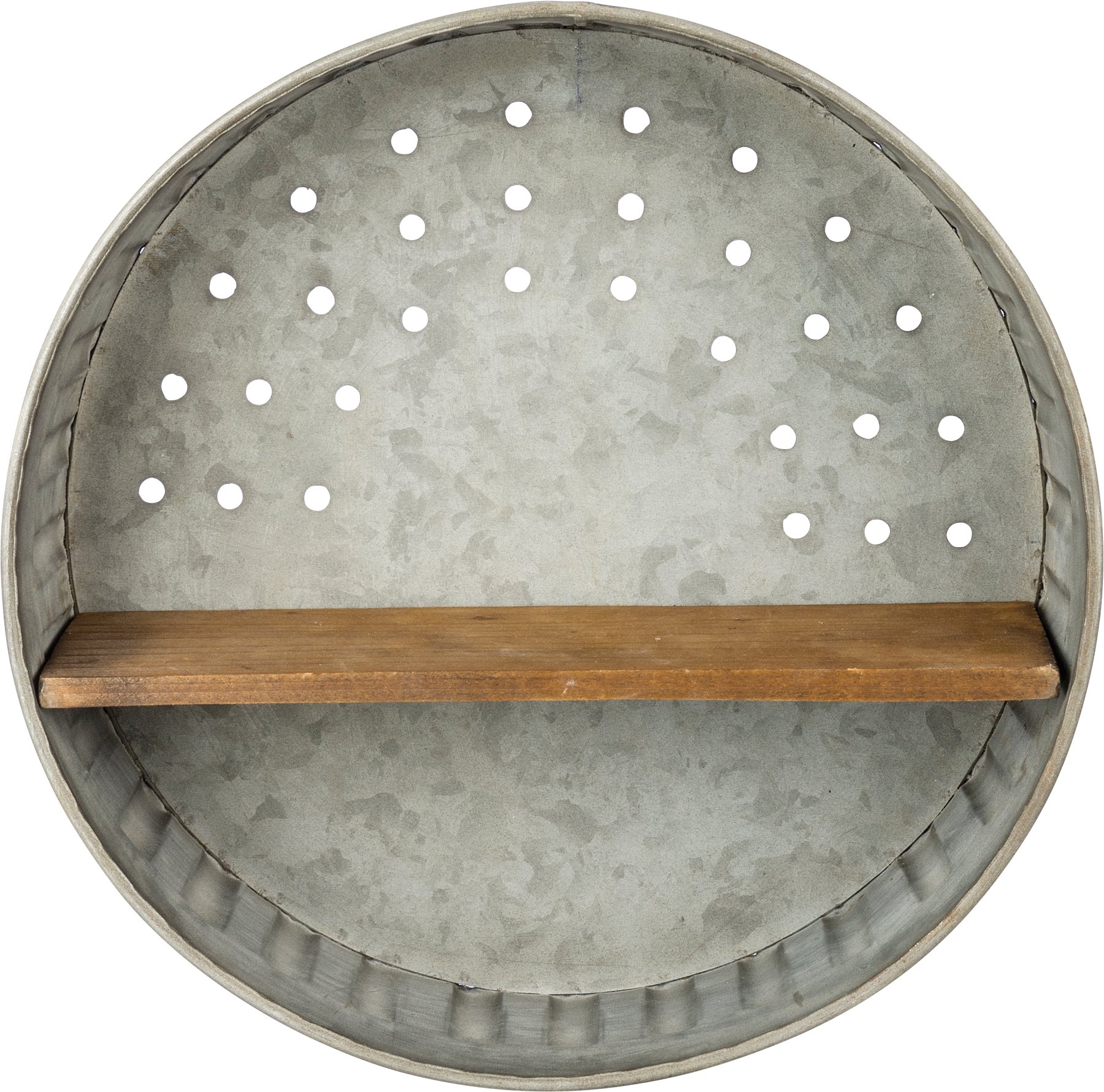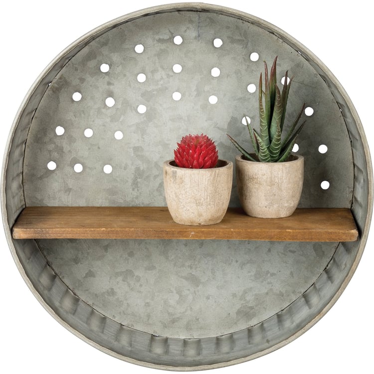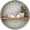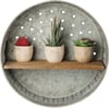 Great for garden or kitchen decor, a round distressed metal wall hanging with a wooden shelf that's easy to hang and practical to use.