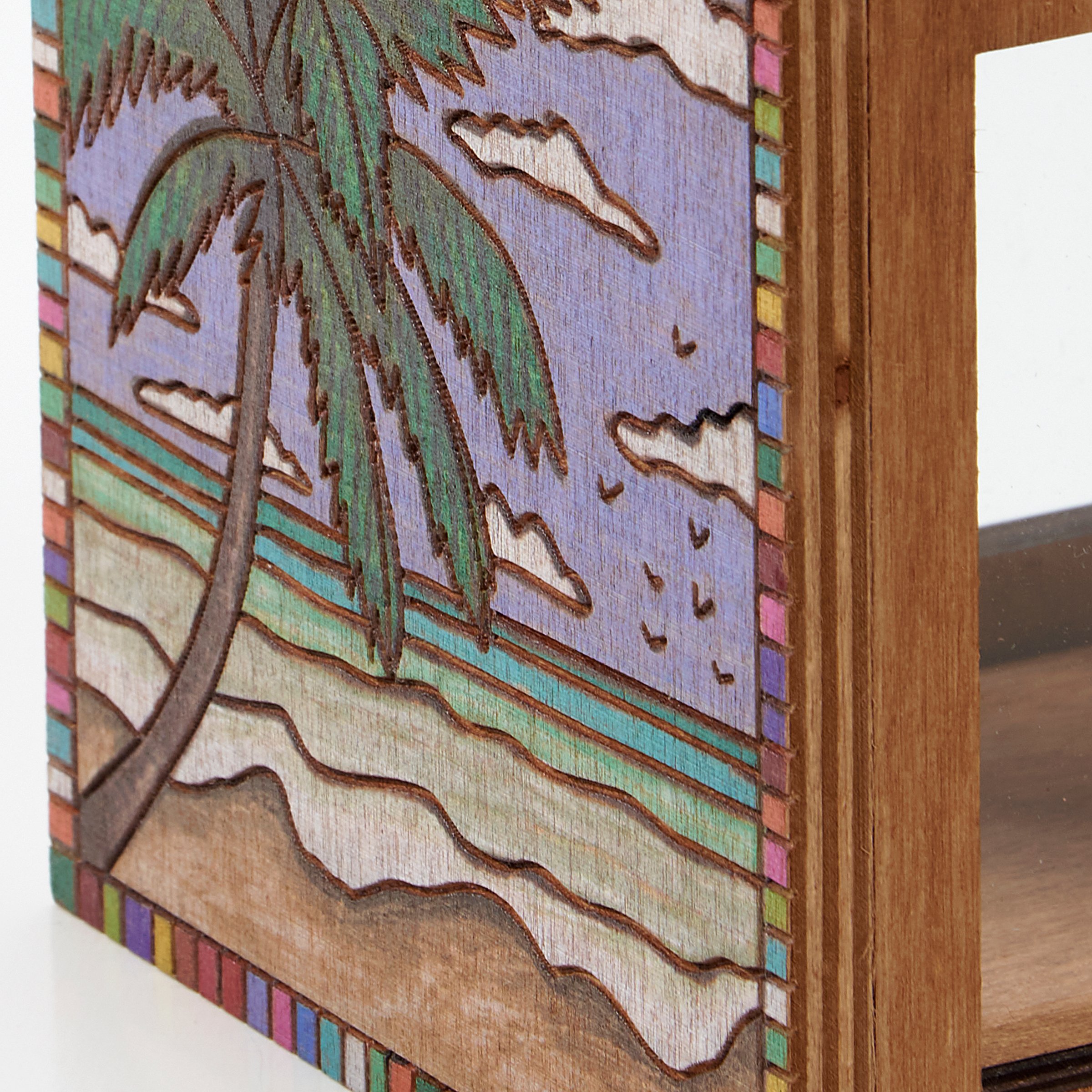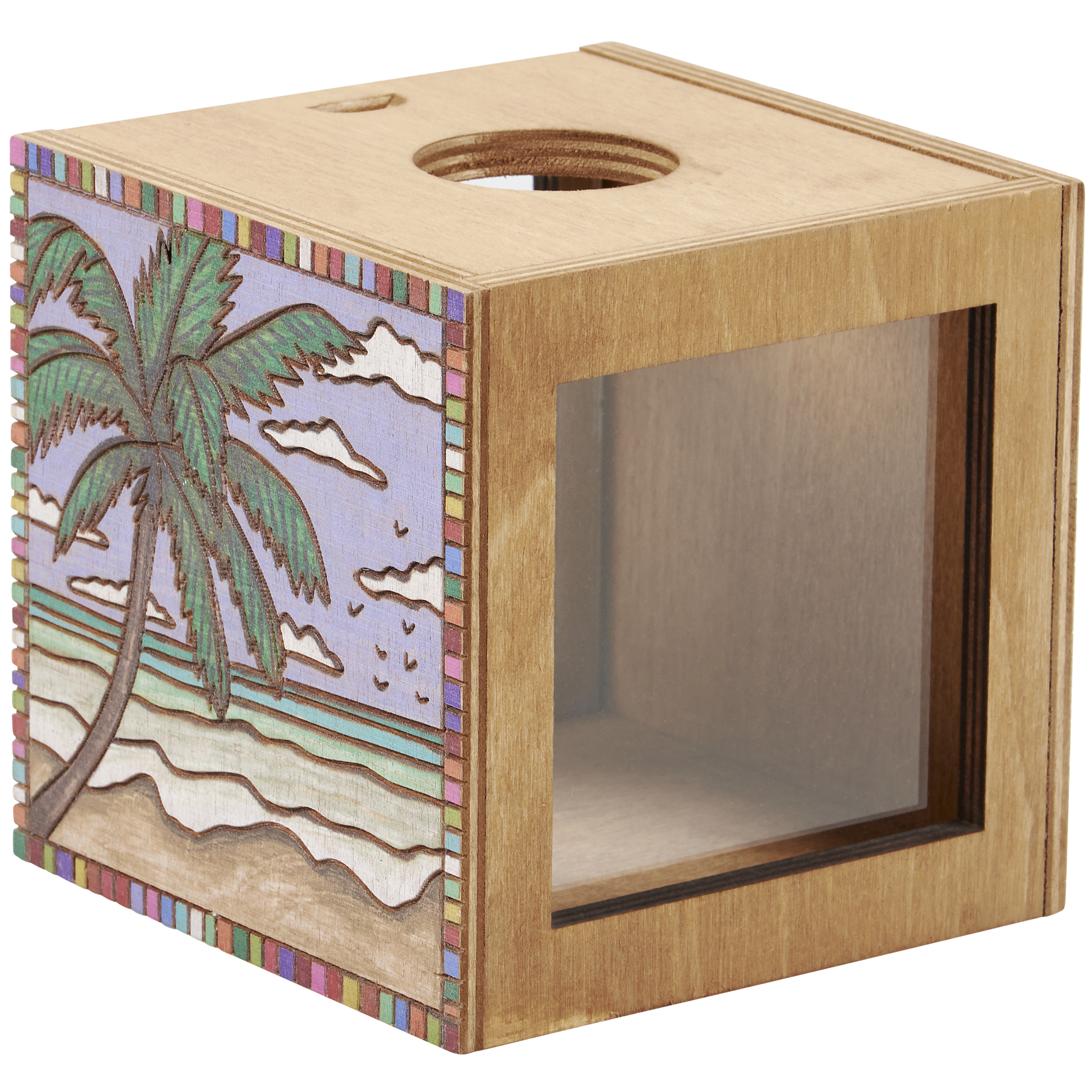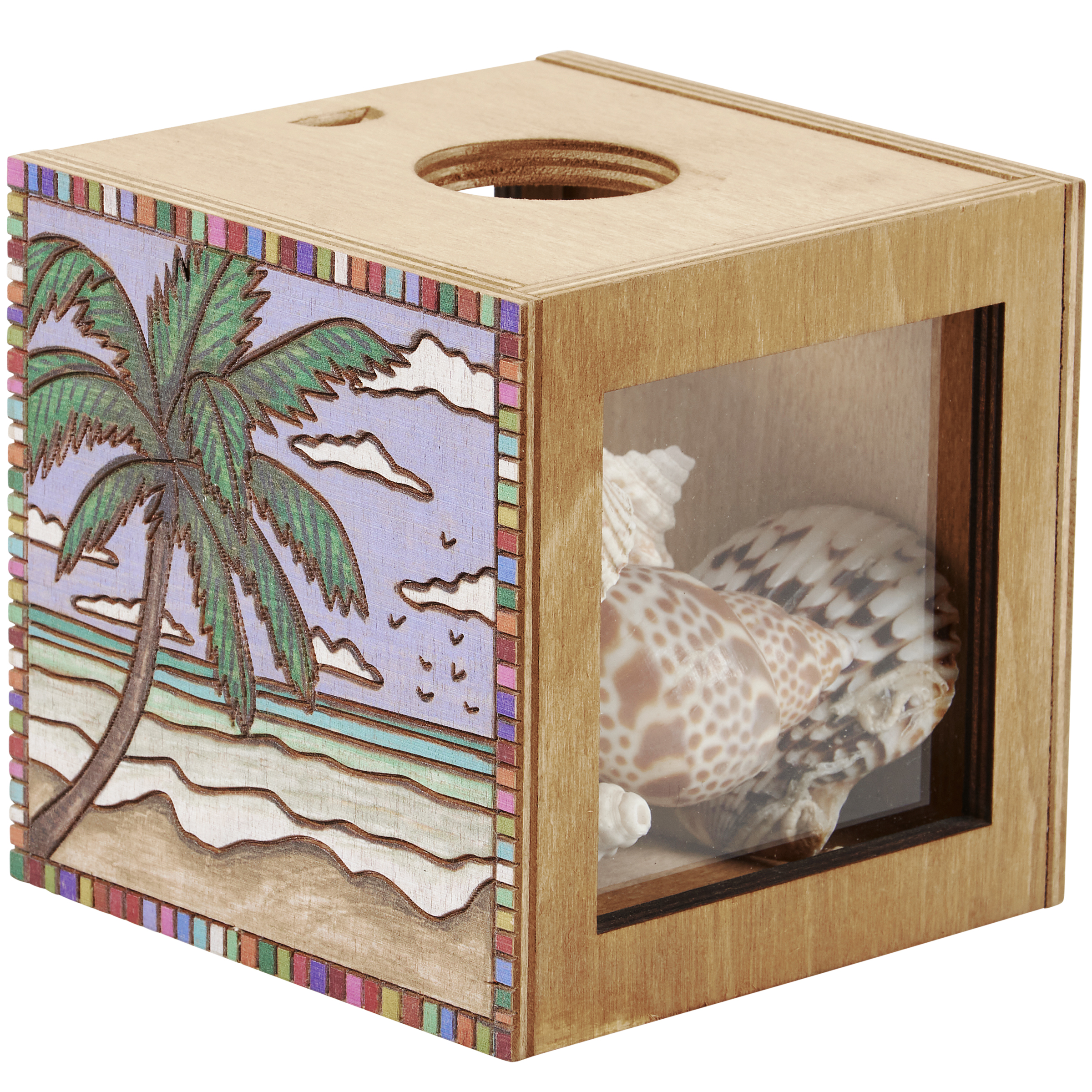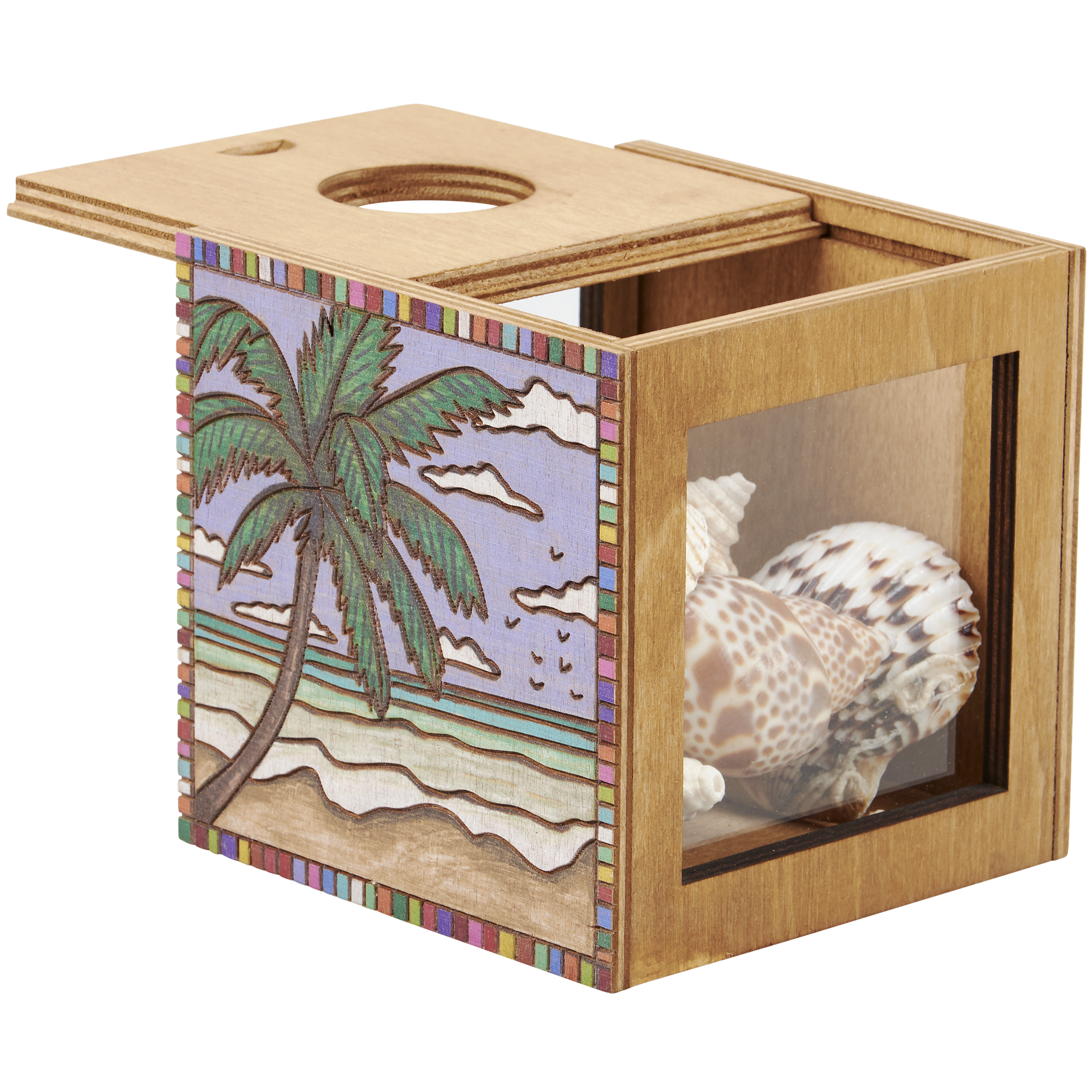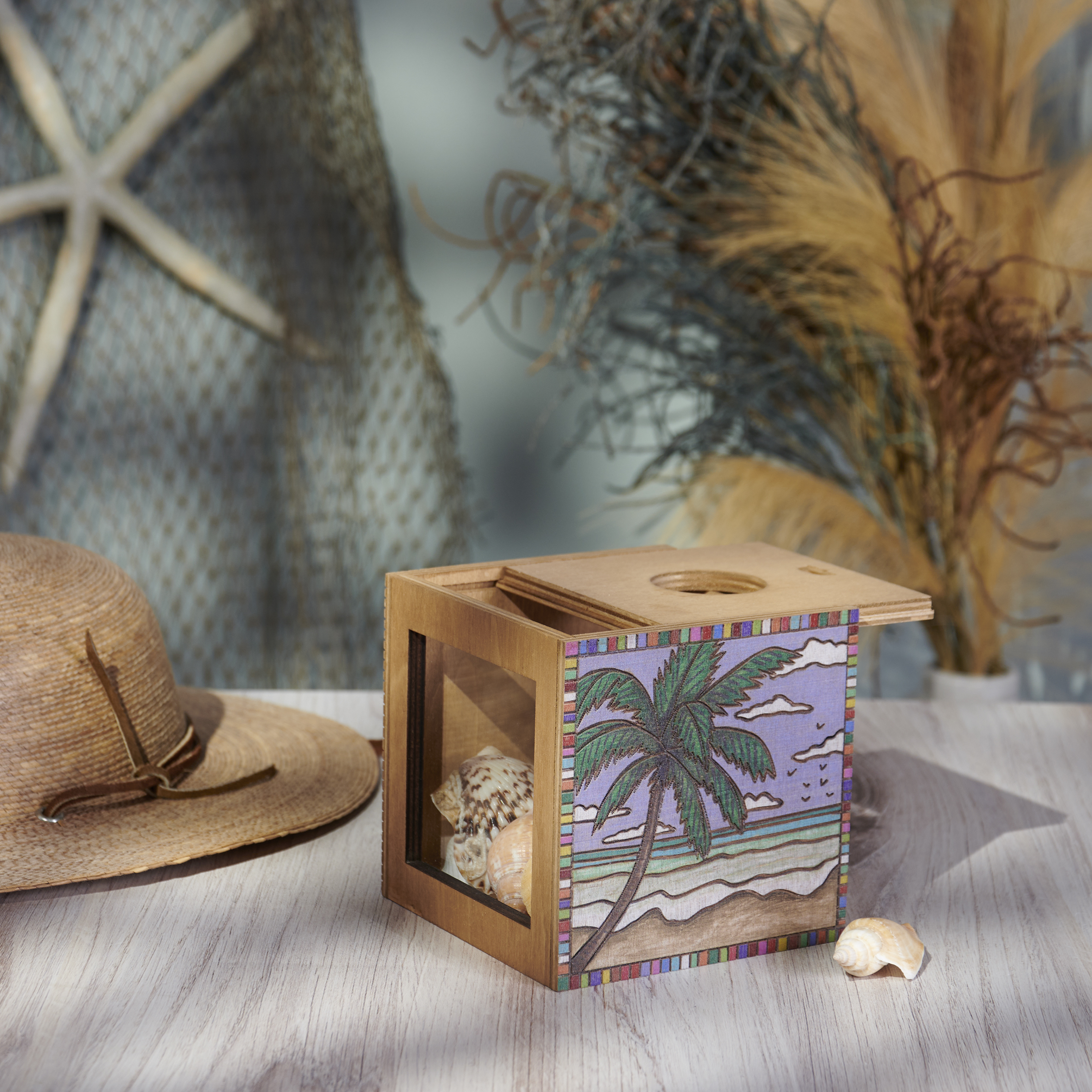 A double-sided wooden seashell holder from our Beach Collection with a vibrant hand illustrated scene of a beach and palm tree with wood burned details for added texture. Wood frame features a coordinating natural wood with distressed details. Our Palm Tree shell holder includes side panel glass windows to view keepsakes and a top opening to drop items in that also slides out to easily retrieve what is inside. A fun beach-themed gift to display keepsakes as everyday home décor.