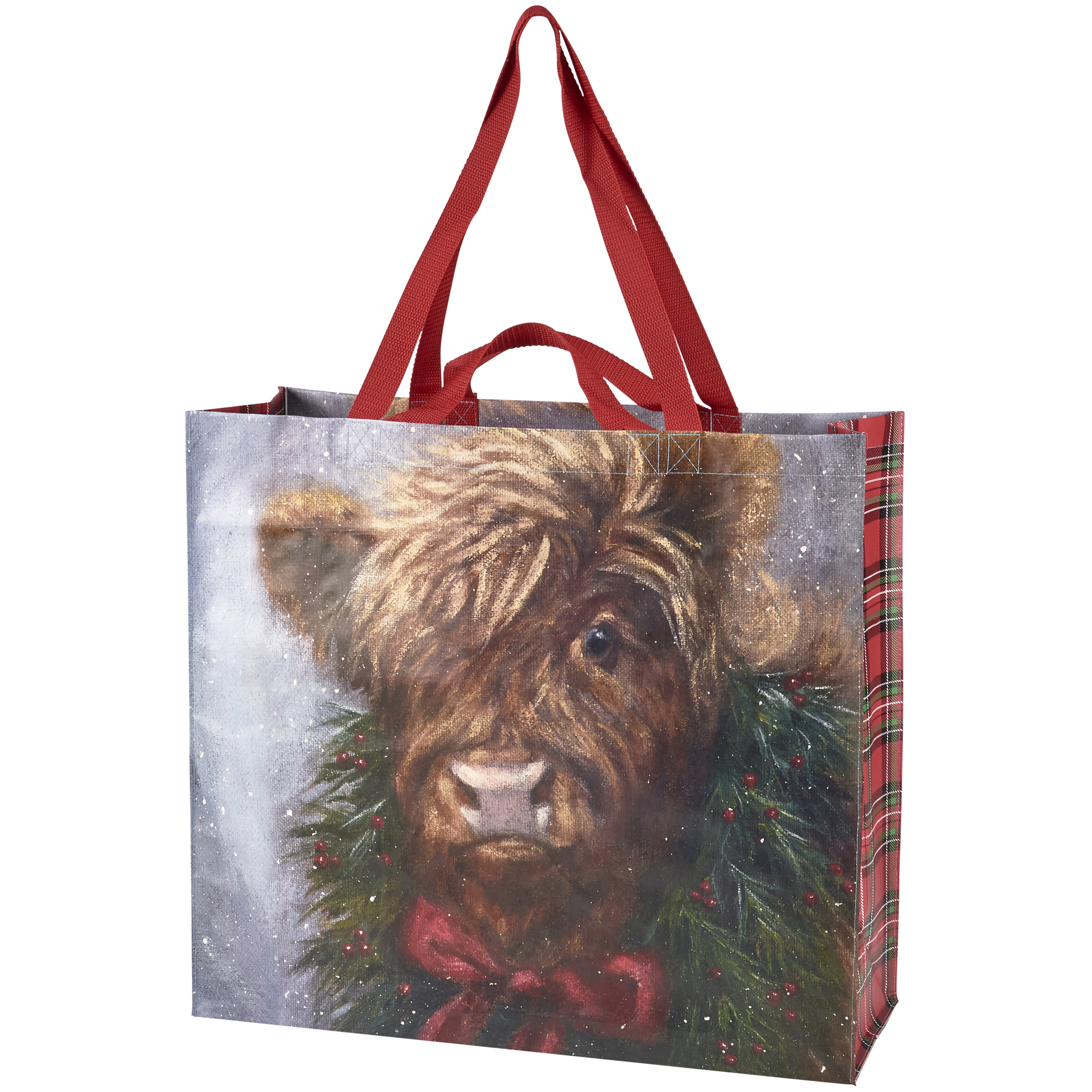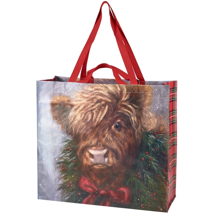 A double-sided shopping tote from our Christmas Collection displaying a charming winter scene of a highland cow wearing a Christmas wreath. Side gussets display coordinating Christmas tartan plaid pattern. Design is replicated from original artwork painted onto burlap canvas, giving the art a unique depth and texture. Seasonal shopping tote includes both hand and shoulder straps in red nylon and a convenient inside pocket with matching plaid pattern. Our Highland shopping tote is made from eco-friendly post-consumer material and folds flat for compact storage. A rustic seasonal accessory perfect for holiday shopping and great for reusable gift wrapping.