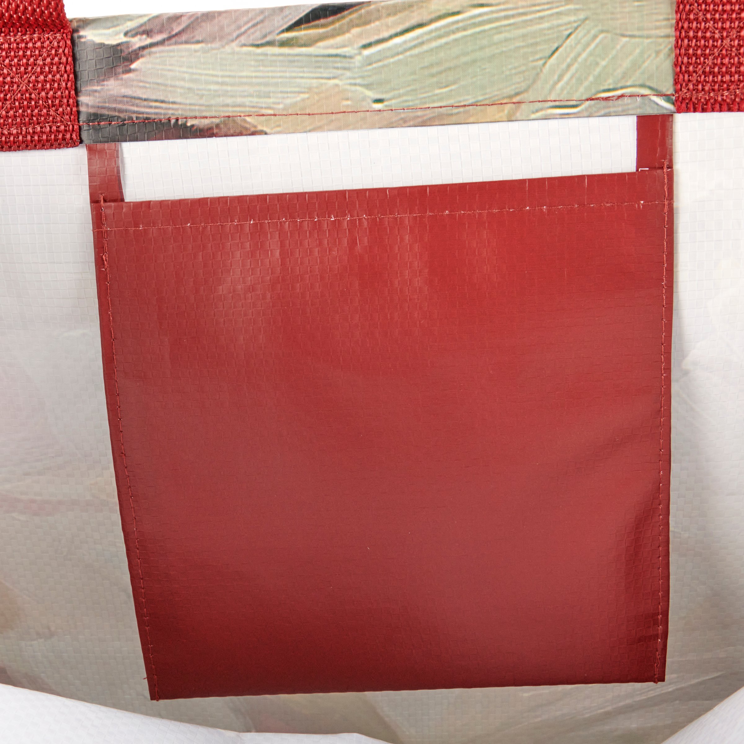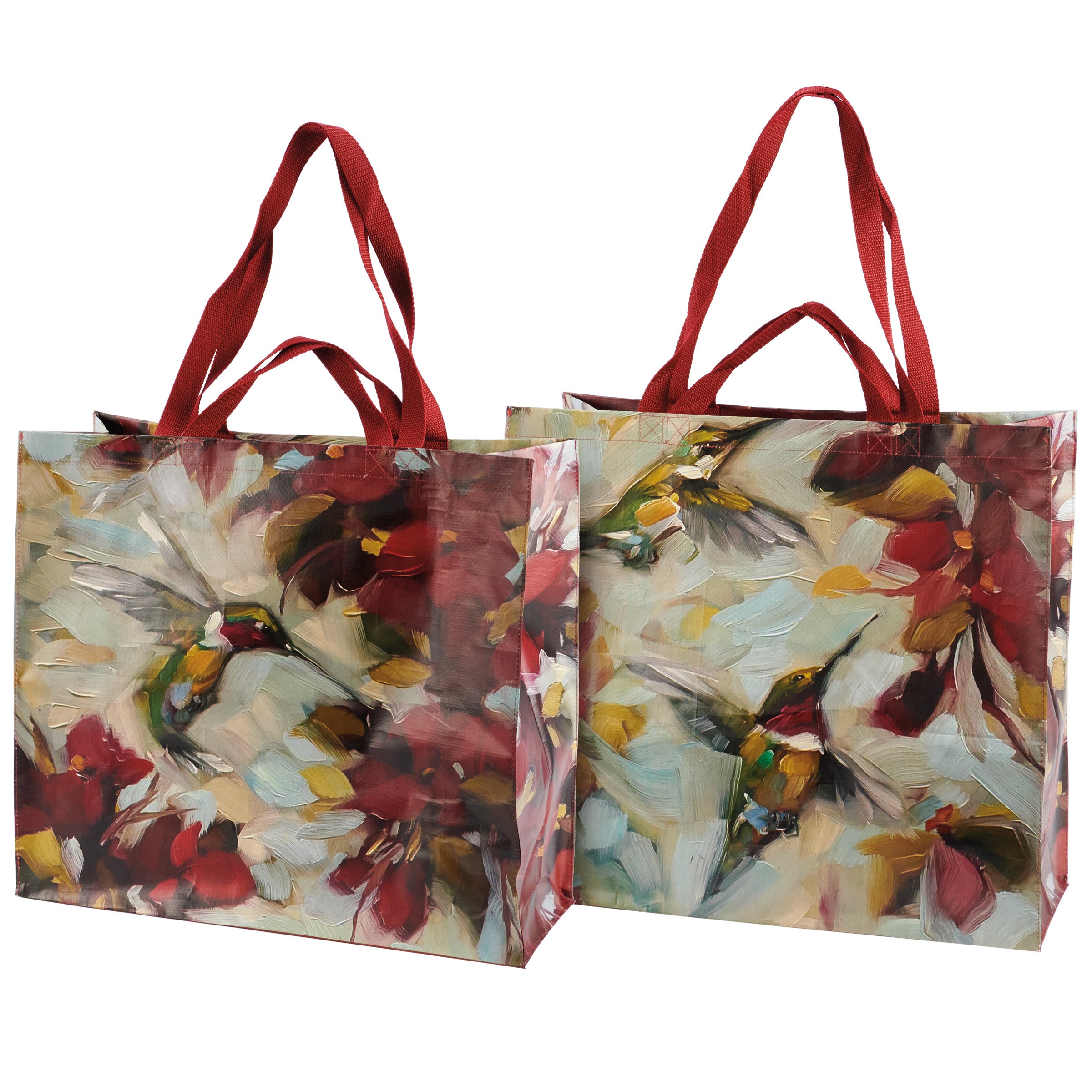 A double-sided shopping tote from our Easter & Spring Collection displaying a calming scene of hummingbirds and spring flowers. Designs are replicated from original artwork hand painted in a unique textured style. Shopping tote includes both hand and shoulder straps in red nylon and a convenient inside pocket with red color. Our Hummingbird shopping tote is made from eco-friendly post-consumer material and folds flat for easy storage. A charming spring-themed accessory perfect for shopping or traveling.