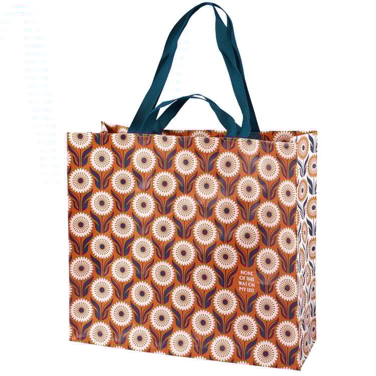 We all know we're gonna grab more than we need, so go ahead and use this double-sided shopping tote displaying an eye-catching floral pattern in a bold color palette with a relatable sentiment that reads "None Of This Was On My List." Side gussets display floral pattern in an alternate color scheme. Stylish shopping tote includes both hand and shoulder straps in green nylon with a convenient inside pocket displaying a single flower design. Questionables shopping totes are made from eco-friendly post-consumer material and fold flat for easy storage. Our None Of This shopping tote demands the attention of others making it a statement making accessory perfect for everyday shopping or traveling.