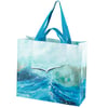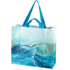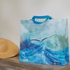 A double-sided shopping tote from our Beach Collection displaying a comforting scene of a seagull flying over a cresting ocean wave in stunning blue color palette. Design is replicated from original art created at the Friendship Heart Gallery in downtown Lancaster, PA that supports artists with intellectual disabilities and autism. Shopping tote includes both hand and shoulder straps in ocean blue nylon and a convenient inside pocket with ocean water design. Our Ocean Wave shopping tote is made from eco-friendly post-consumer material and folds flat for easy storage. An ocean-themed everyday accessory perfect for beach activities or traveling.