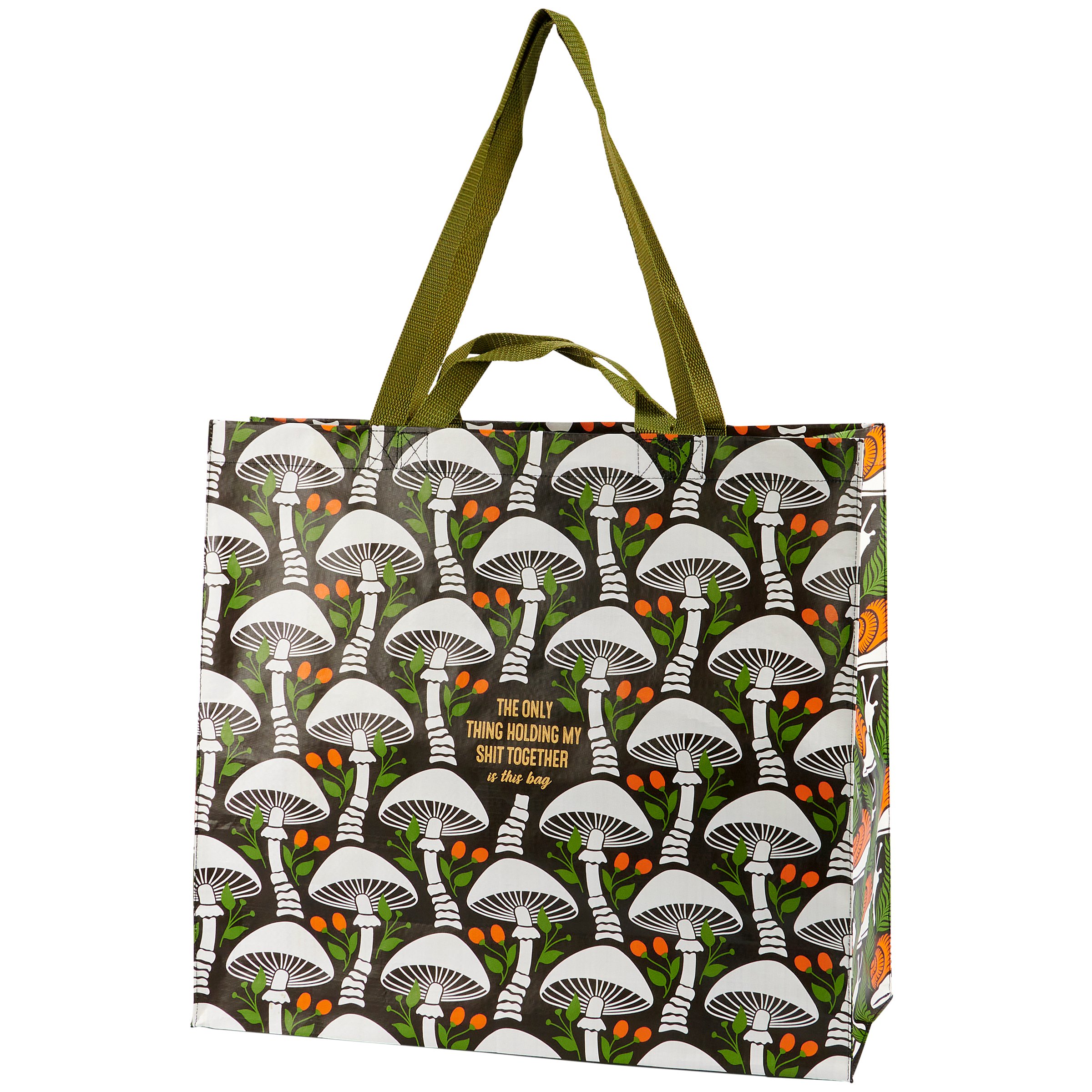 For those of us with both physical and emotional baggage, this double-sided shopping tote displays a relaxing mushroom pattern in a bold color palette and a relatable sentiment that reads "The Only Thing Holding My Shit Together." Side gussets display a coordinating snail pattern. Stylish shopping tote includes both hand and shoulder straps in green nylon with a convenient inside pocket displaying a single mushroom design. Questionables shopping totes are made from eco-friendly post-consumer material and fold flat for easy storage. Our Only Thing shopping tote is an everyday accessory with a down-to-earth style perfect for shopping or traveling.