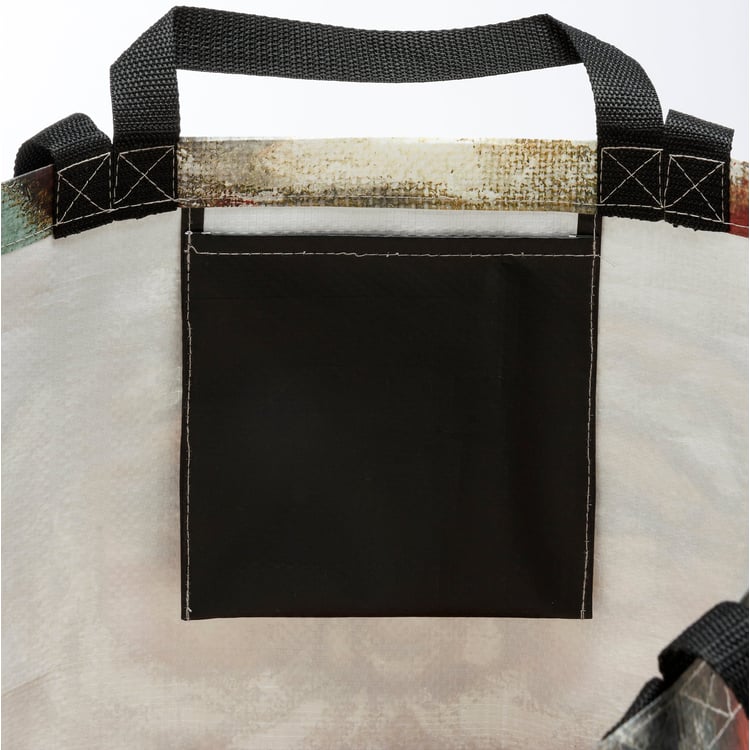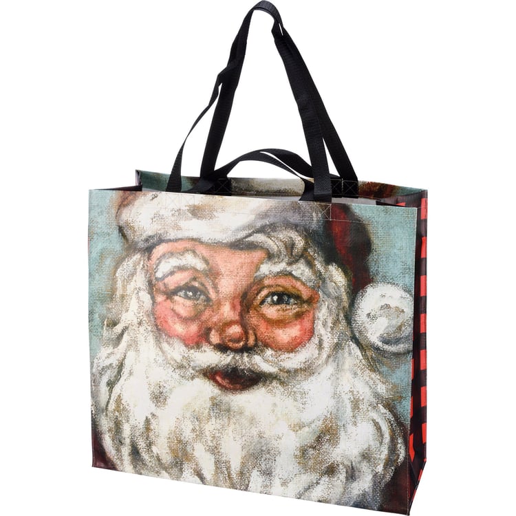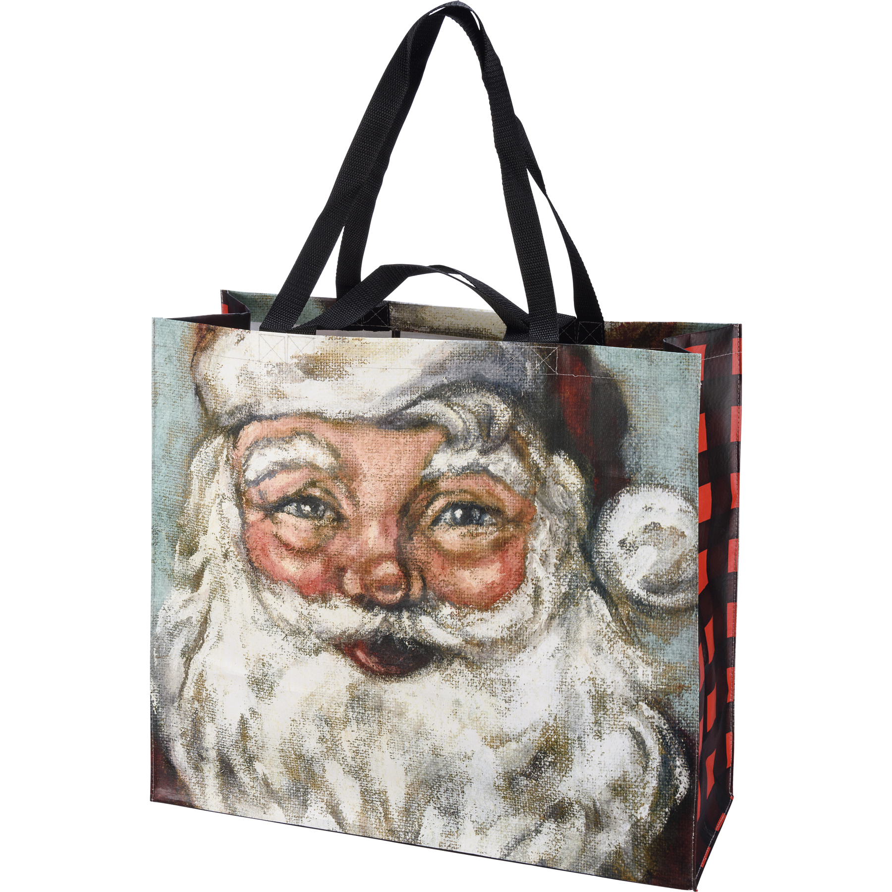 Made of post-consumer material, this double-sided shopping tote features a Santa face design. Gusset features coordinating red and black buffalo check designs. Designs are replicated from original artwork painted onto burlap canvas, giving the art a unique depth and texture. Includes dual nylon straps.