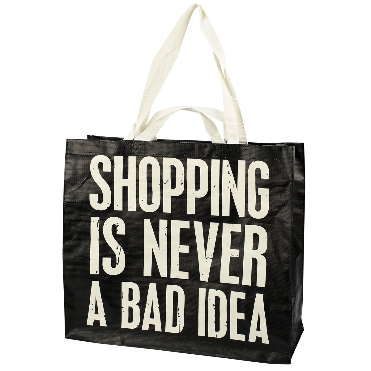 A double-sided shopping tote from our Box Sign Style Collection displaying a fun shopping-themed sentiment in a classic box sign style that reads "Shopping Is Never A Bad Idea." Shopping tote includes both hand and shoulder straps in white nylon and a convenient inside pocket. Our Shopping Never Bad Idea shopping tote is made from eco-friendly post-consumer material and folds flat for easy storage. A fun everyday accessory perfect for a day of shopping at local stores. 100% of the proceeds from the sale of this Benefit Item will be donated to Heart on Main Street, a non-profit organization dedicated to providing small businesses and independent retailers with the tools, resources, and education to help them thrive and evolve. Visit the benefits page on our website for more information.