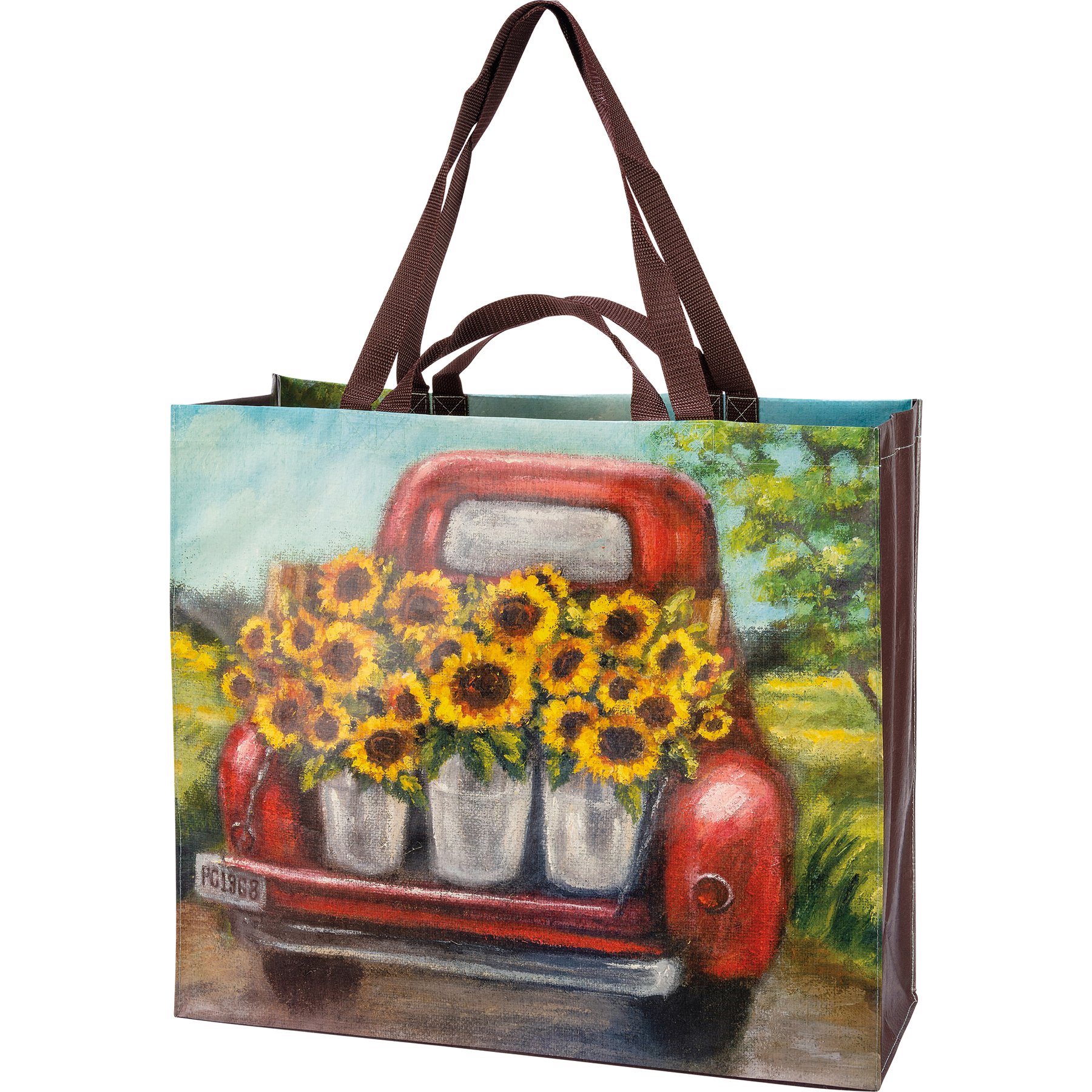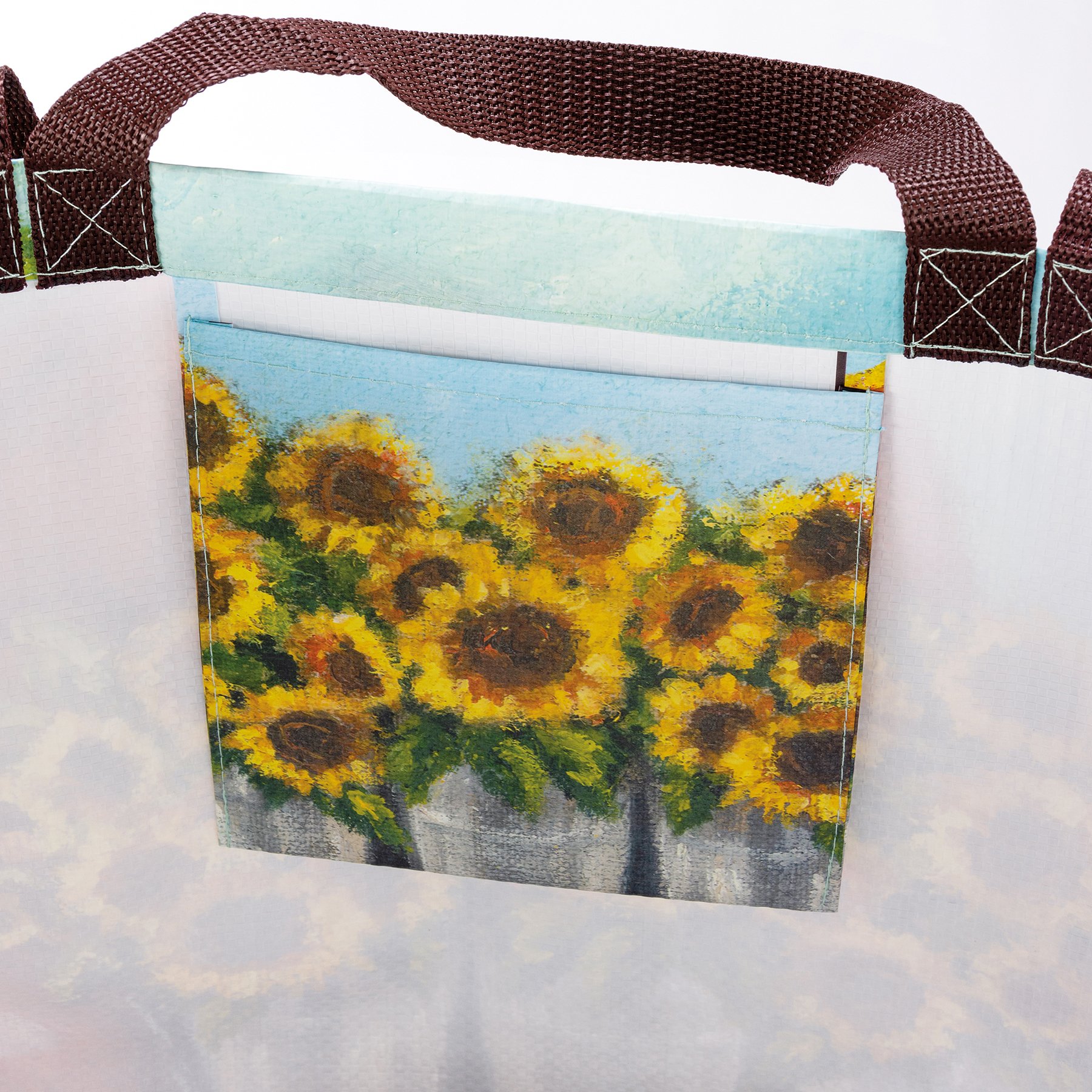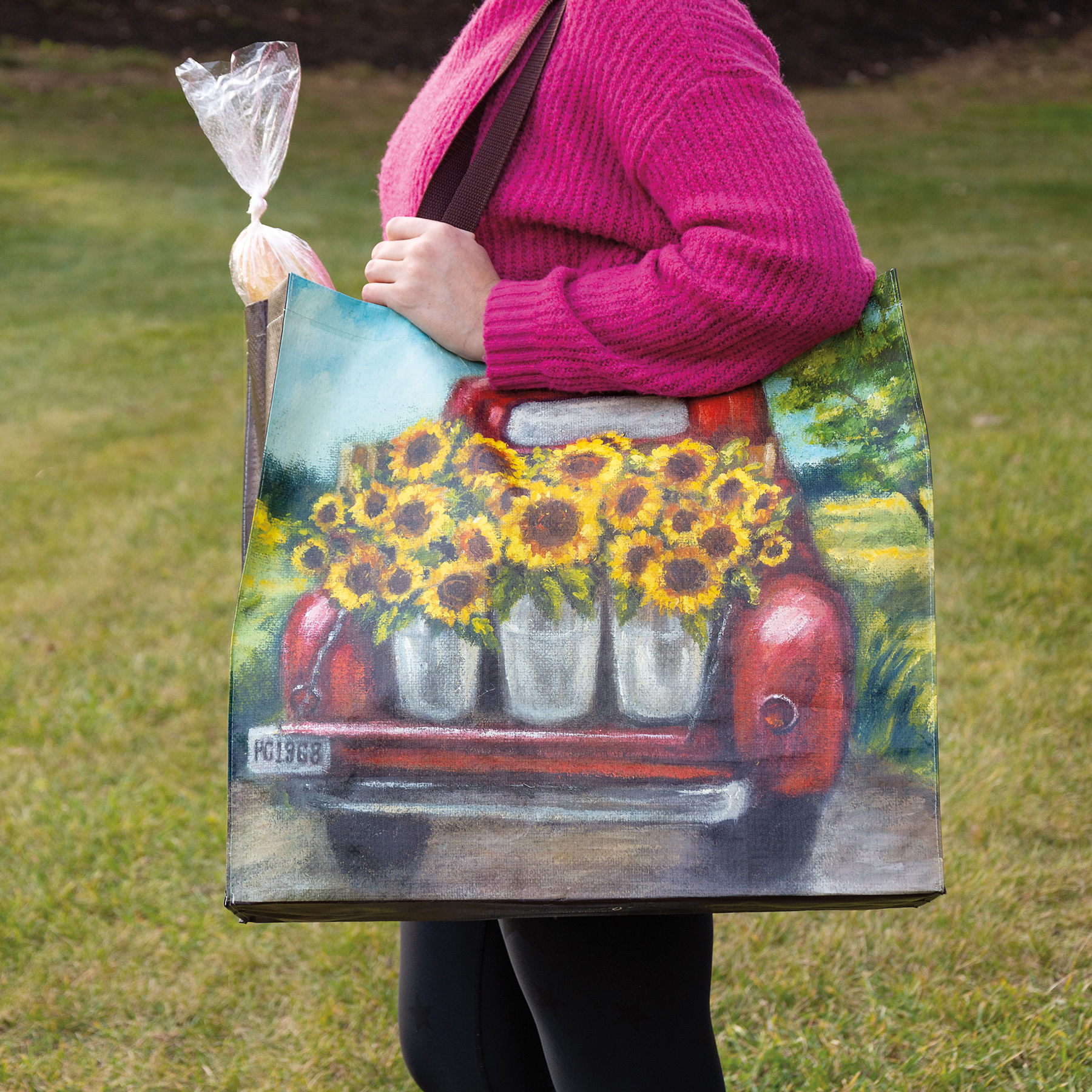 Made of post-consumer material, this double-sided shopping tote features a design of a truck hauling oversized sunflowers. Design is replicated from original artwork painted onto burlap canvas, giving the art a unique depth and texture. Gussets feature coordinating color. Our Sunflowers shopping tote contains an interior pocket and dual nylon hand and shoulder straps for easy carrying.