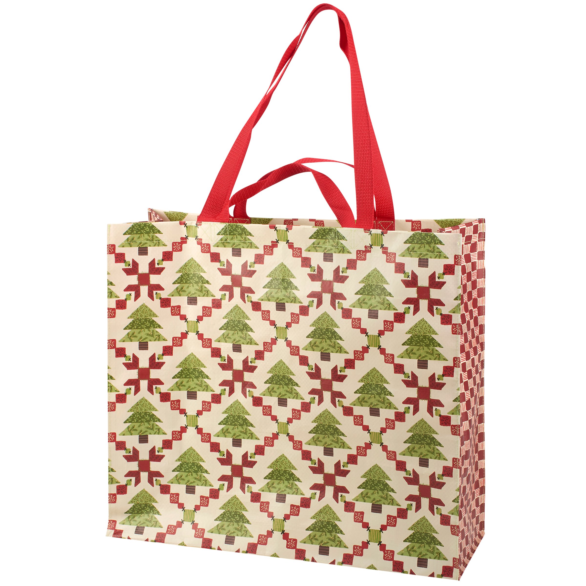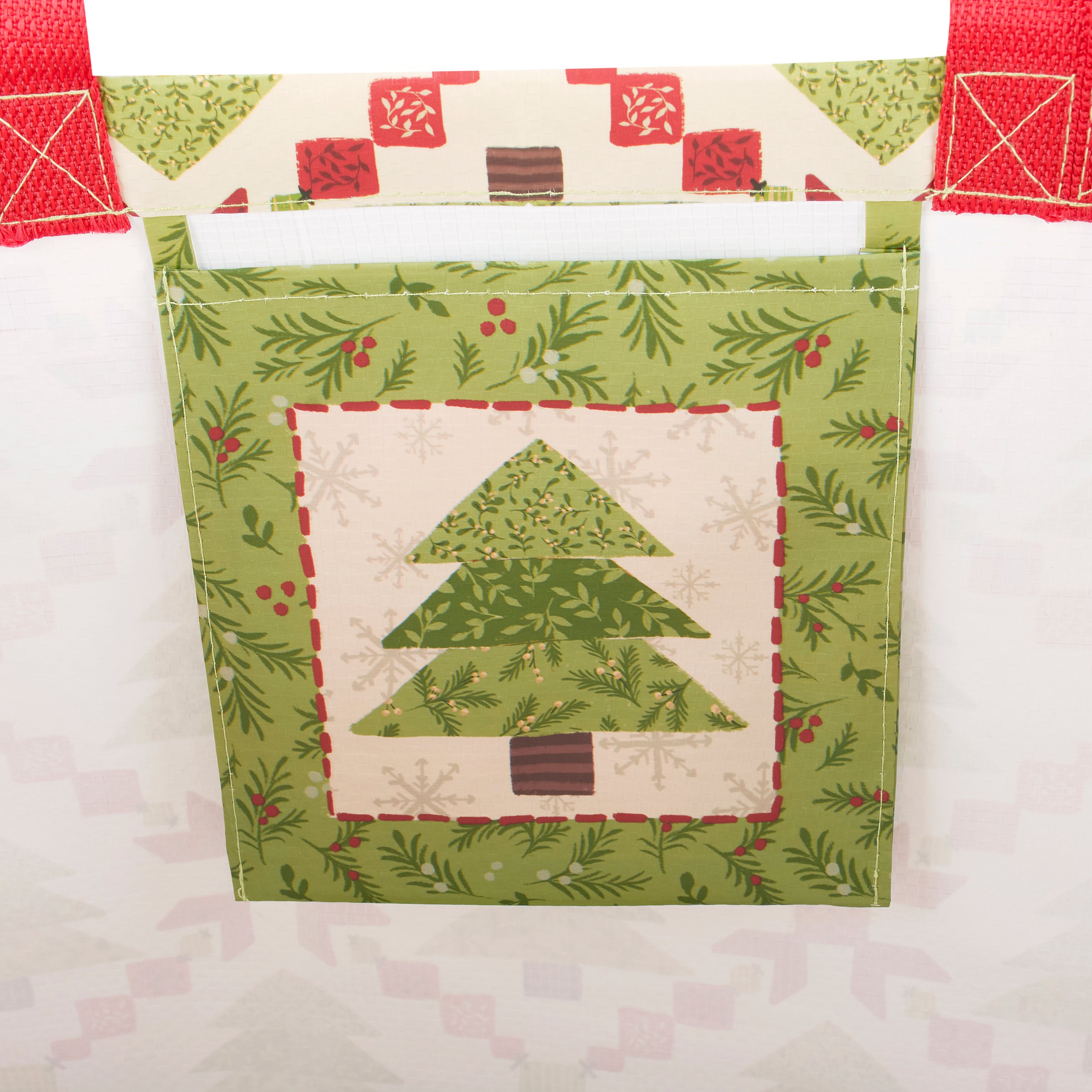 A shopping tote from our Christmas Collection featuring a double-sided design displaying a craft inspired Christmas tree quilt design with quilt check pattern on the gussets. Quilt designs are replicated from original art hand painted in a unique watercolor style. Seasonal market tote includes both hand and shoulder straps in red nylon and a convenient inside pocket displaying a tree quilt patch design. Our Tree Quilt shopping tote is made from eco-friendly post-consumer material and folds flat for compact storage. A craft Christmas tote perfect for a seasonal accessory and great for reusable gift wrapping.