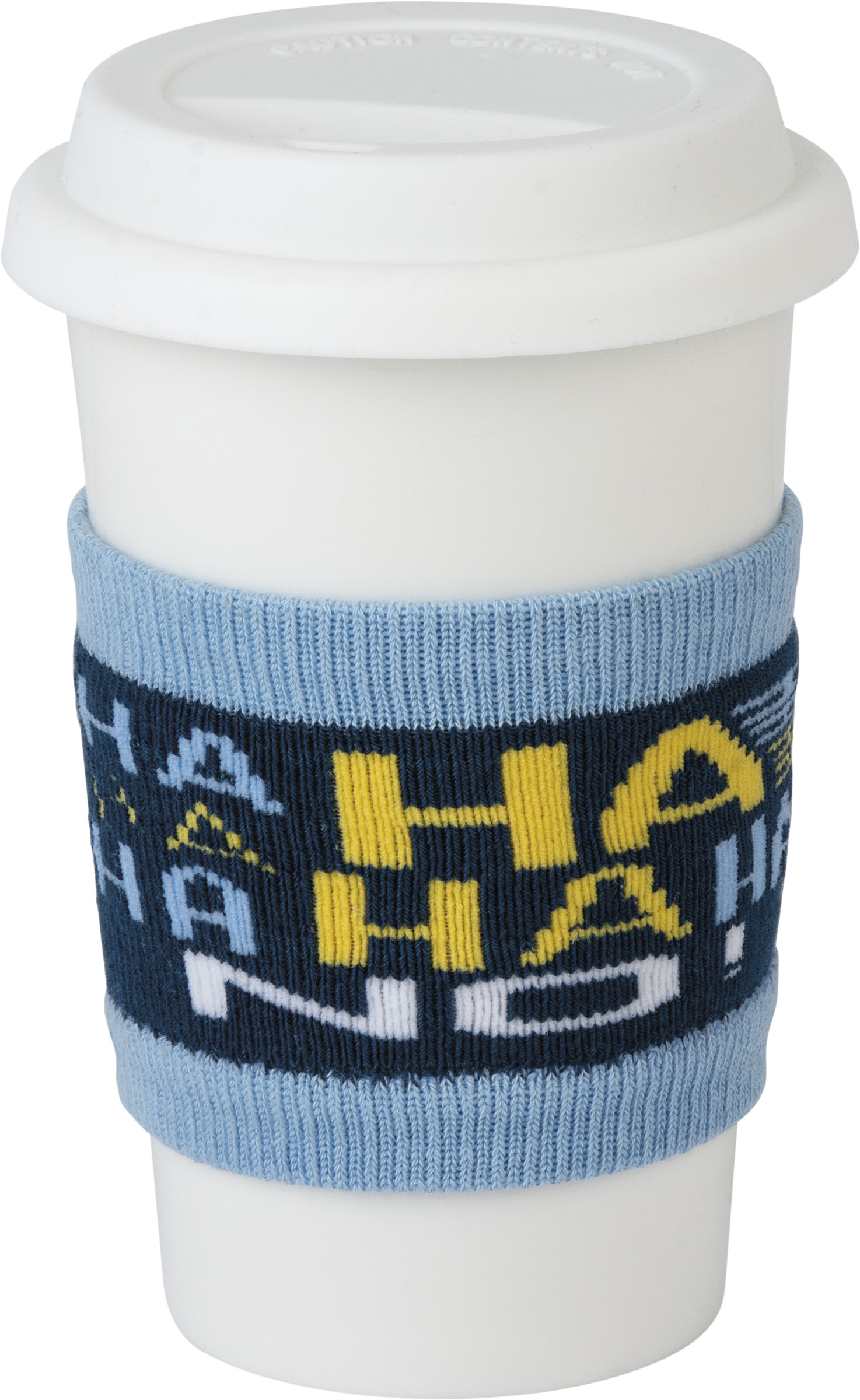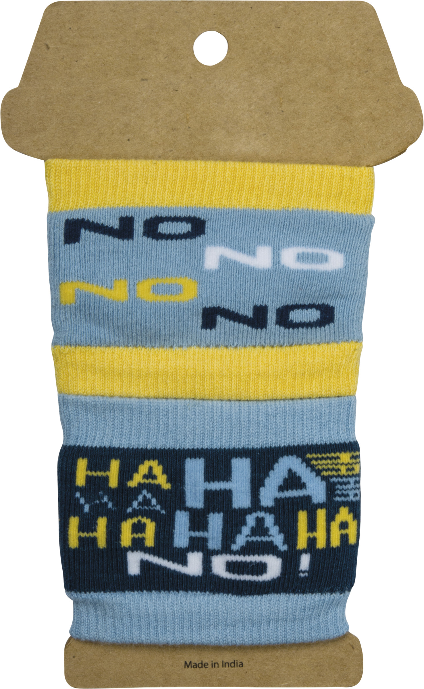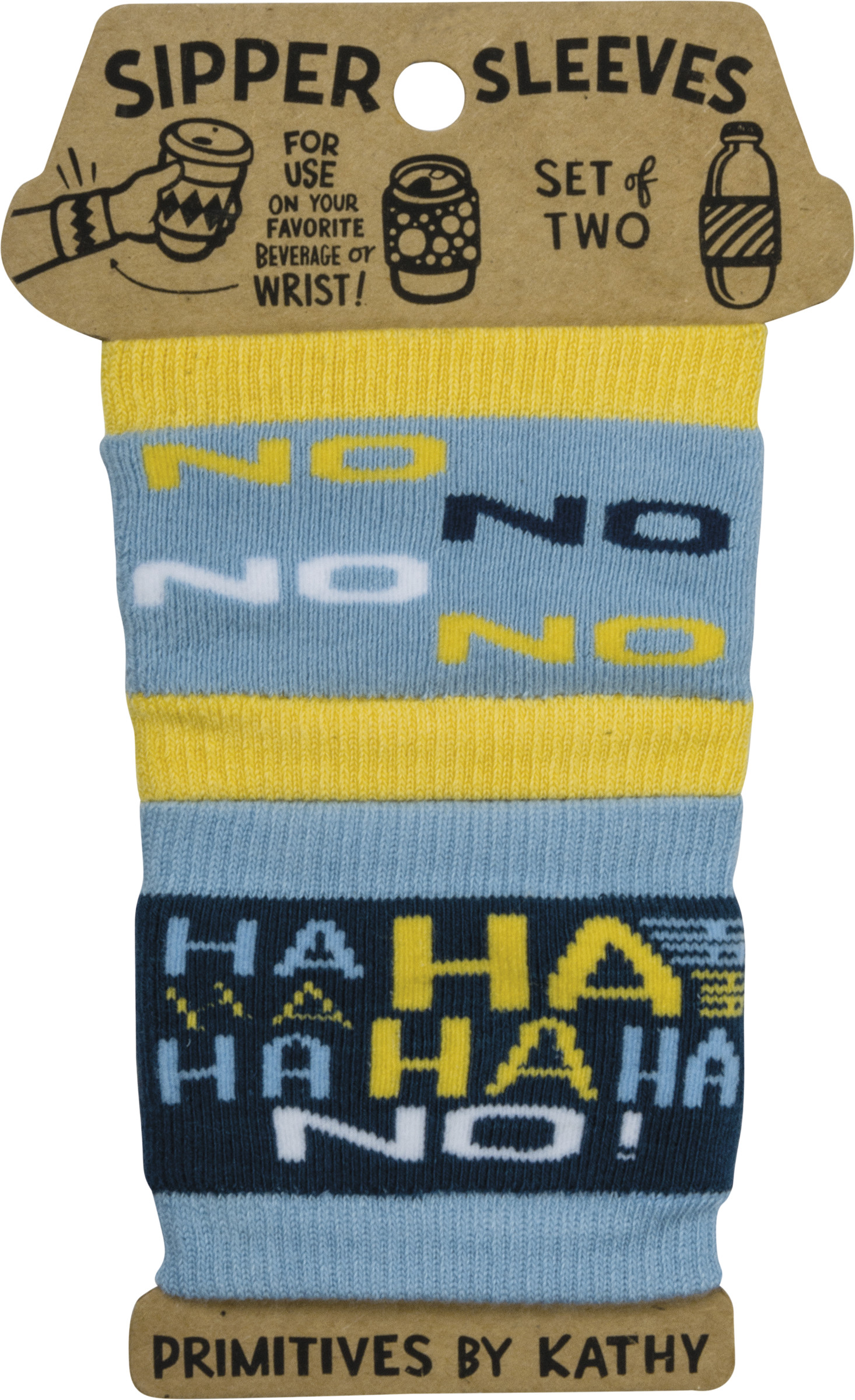 A set of two knit sipper sleeves to fit around any hot or cold beverage container. Featuring a coordinating color palette, one sleeve features a double-sided "Ha Ha Ha Ha Ha - No!" sentiment with another "No" patterned sleeve.
