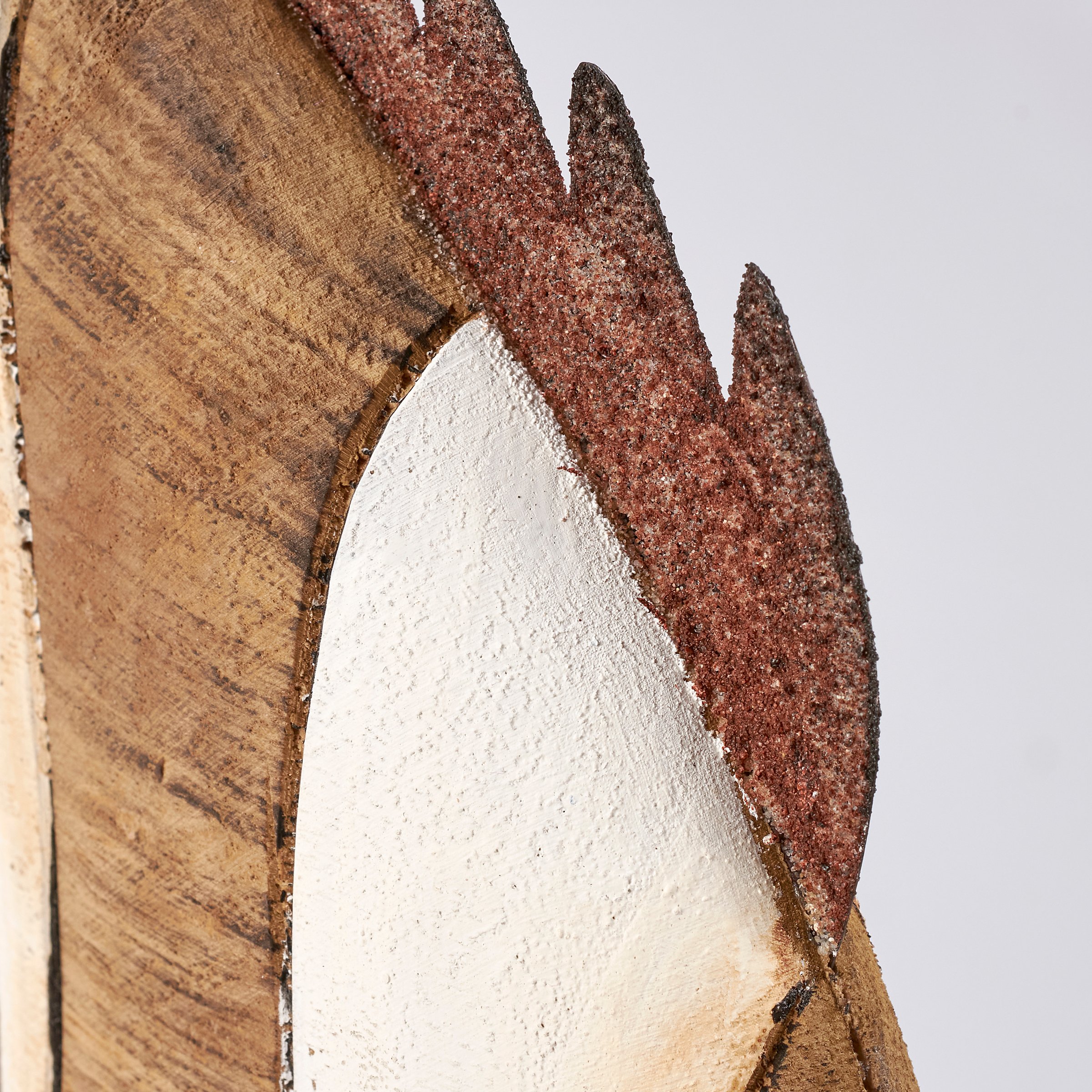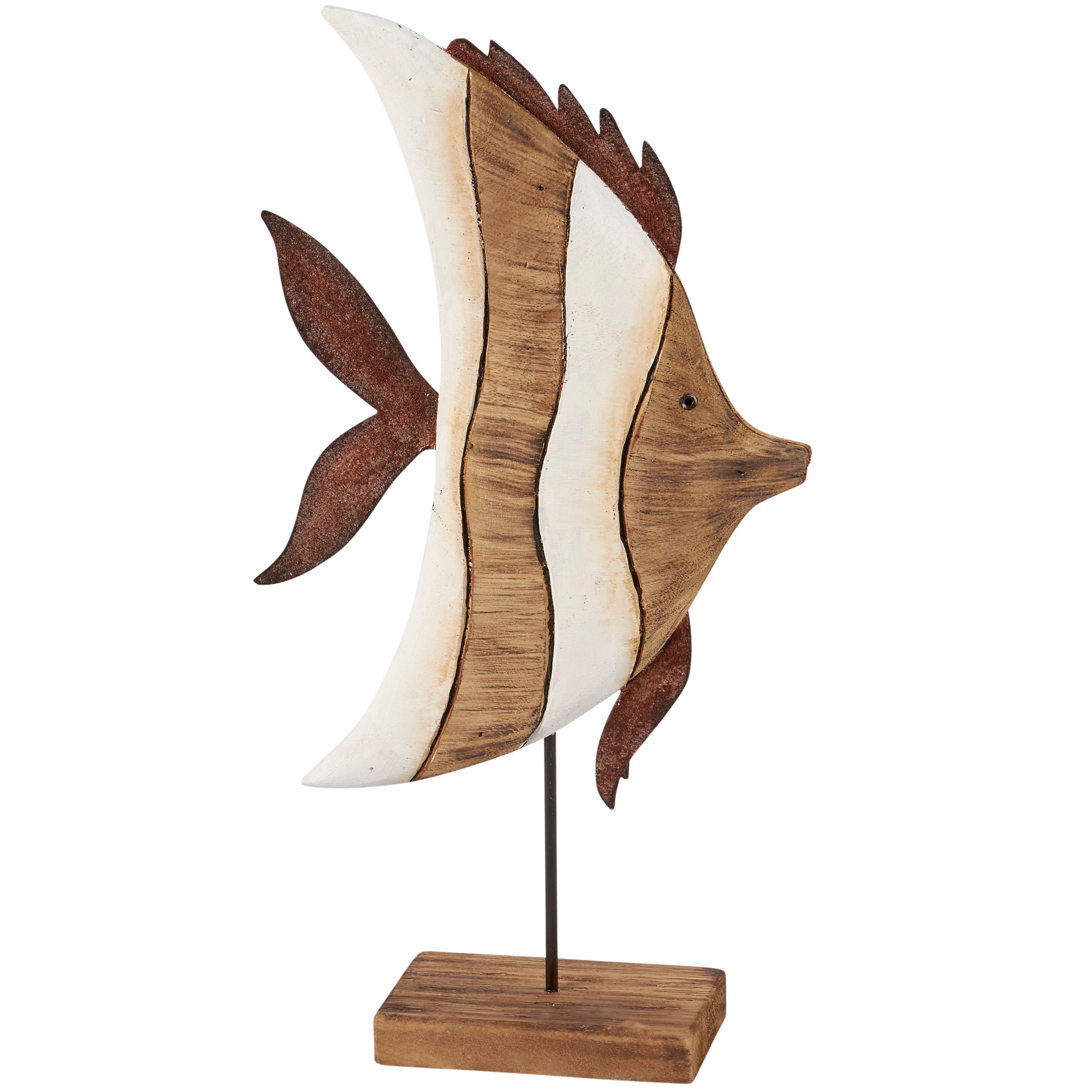 A decorative angelfish from our Beach Collection displaying a driftwood inspired design made of natural wood with painted accents and distressed details. Decorative angelfish features aged metal fins and sits on a metal stake attached to a wood base for a floating appearance. Our Angelfish sitter is designed to free-stand on any flat surface making it easy to display. A rustic beach-themed home accent that coordinates well with primitive home décor.