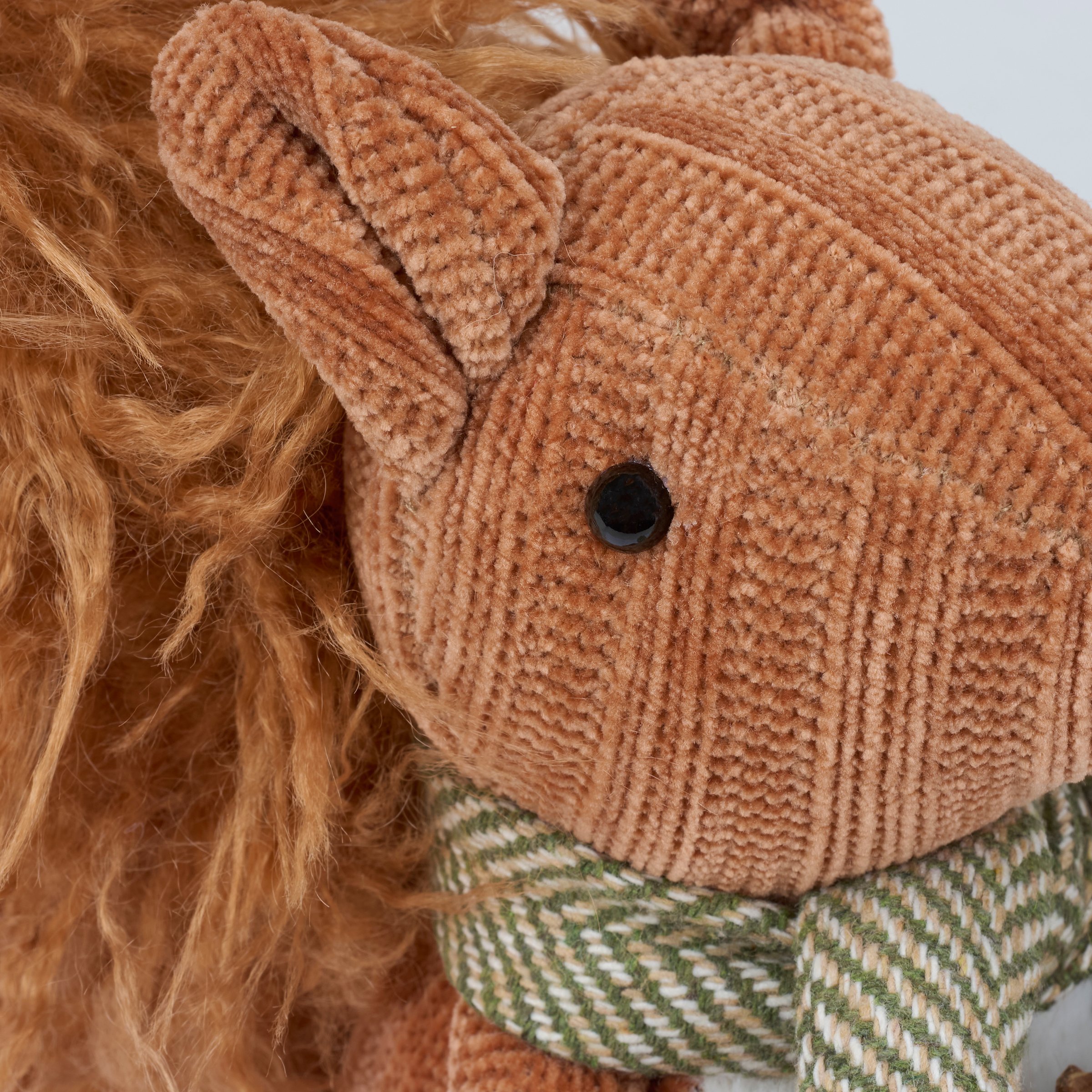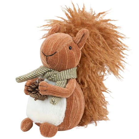 A decorative sitter from our Fall & Harvest Collection displaying a cute baby squirrel inspired doll design featuring plush accents, knit scarf, and a pinecone in its hand. Our Baby Harvest Squirrel is designed to free stand on a flat surface for display. A cute fall home accent that easily add seasonal style to any home or work space.