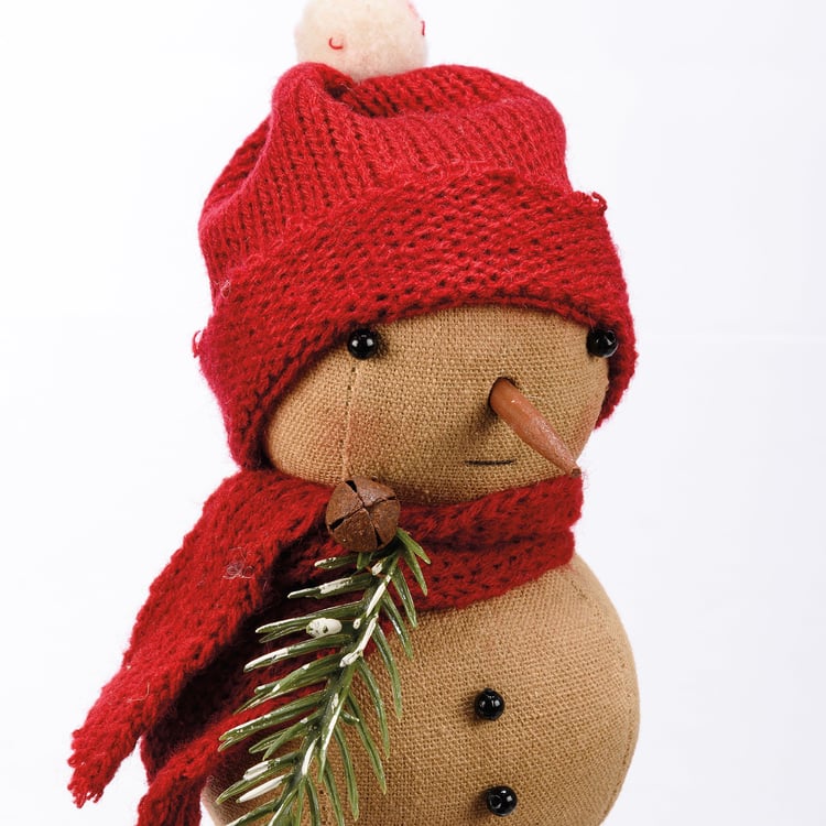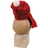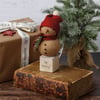 A wooden chunky sitter with a fabric snowman on top. Wooden base of sitter features "Be Merry!" sentiment and white distressed face. Snowman includes fabric hat and scarf, evergreen branch, and bell details for added interest. Our Be Merry sitter is designed to stand alone on any flat surface.