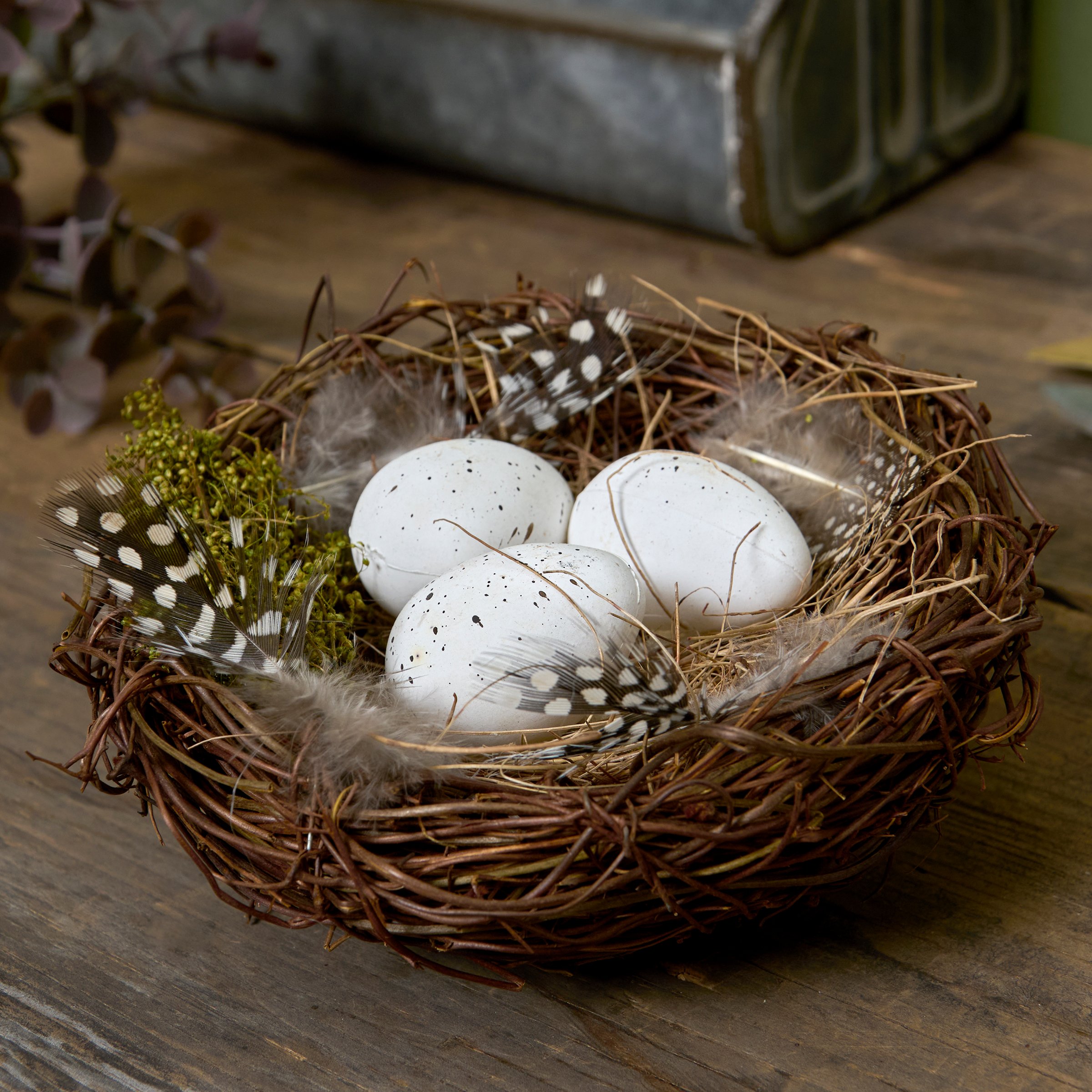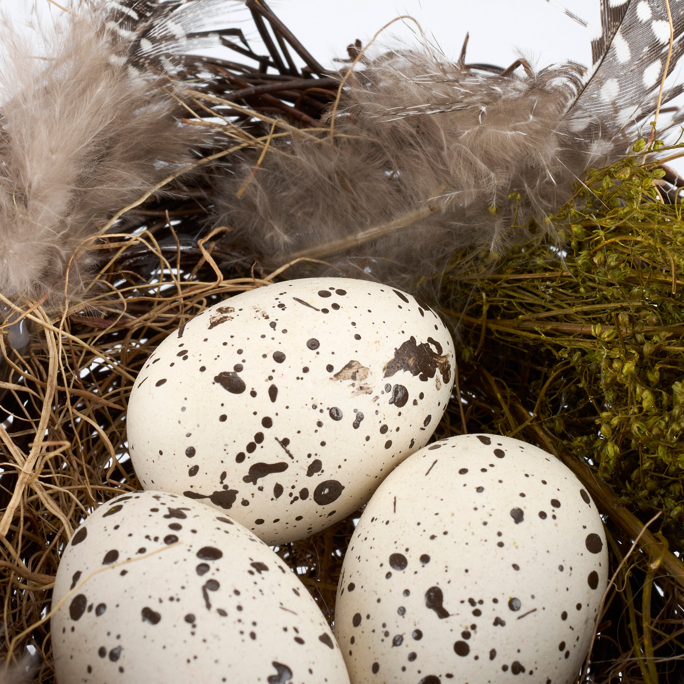 A decorative sitter from our Easter & Spring Collection displaying a detailed bird nest design featuring natural foliage and decorative bird eggs as well as faux feathers to complete the look. Our Bird Nest With Eggs is designed to free stand on flat surface for display. A nature-themed home accent perfect for seasonal decorating.