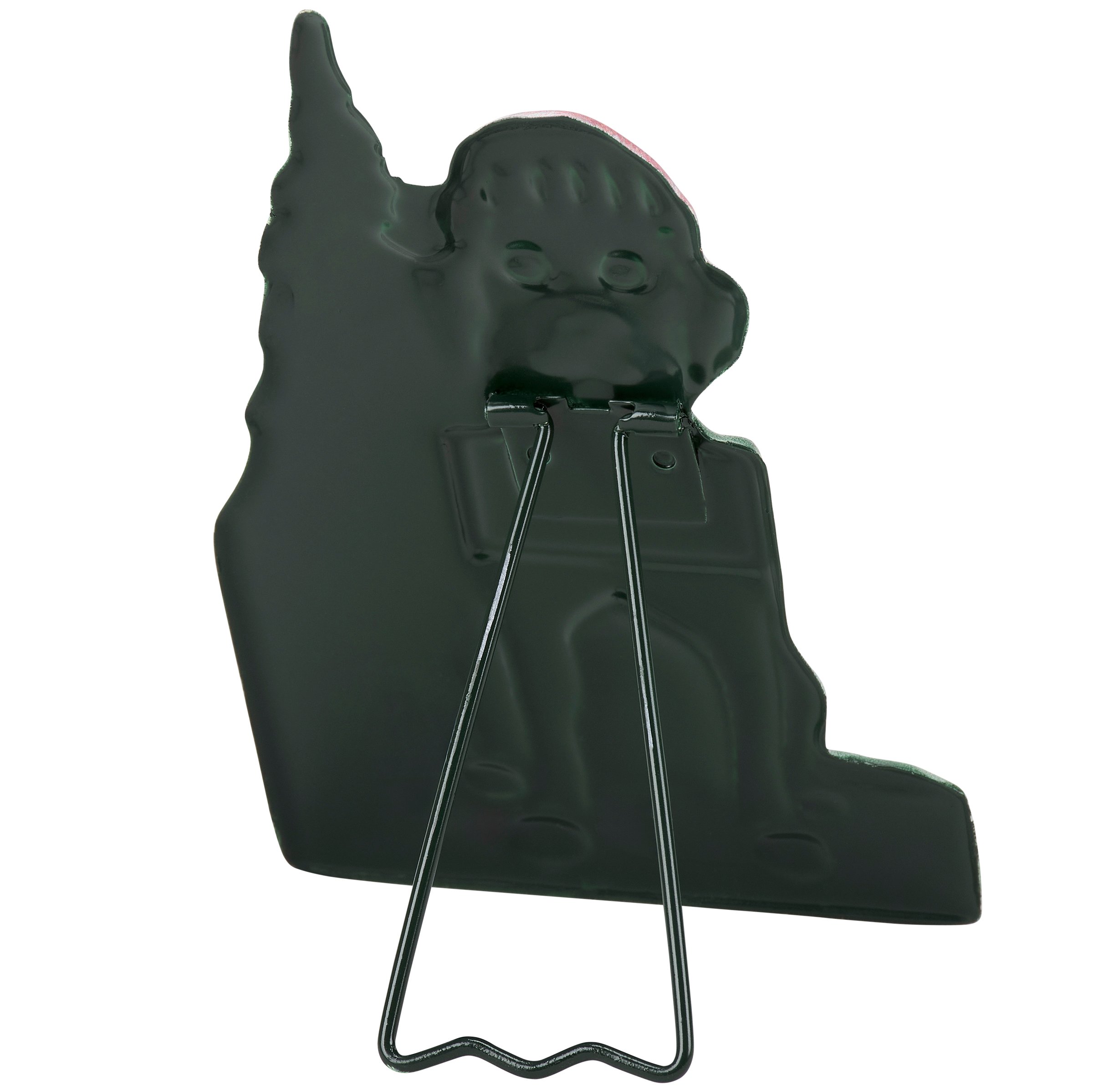 A metal sitter from our Holiday Pet Collection featuring a cutout design displaying a charming winter scene of a black labrador wearing a winter hat and holding a sign that reads "Happy Howlidays" for a fun combination of a love for Christmas and pets. Christmas black lab design is replicated from original artwork painted onto burlap canvas, giving the art a unique depth and texture. This Christmas dog sitter features embossed and debossed details to accent the original hand painted art for added dimension. Our metal Black Lab Happy Howlidays sitter free stands on flat surface for display using easel on the back. A fun dog themed home accent that easily adds seasonal style to any home or work space.