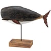 A decorative whale from our Beach Collection displaying a driftwood inspired design made of natural wood with black painted accents and distressed details. Decorative black whale features aged metal fins and sits on a metal stake attached to a wood base for a floating appearance. Our Black Whale sitter is designed to free-stand on any flat surface making it easy to display. A rustic beach-themed home accent that coordinates well with primitive home décor.