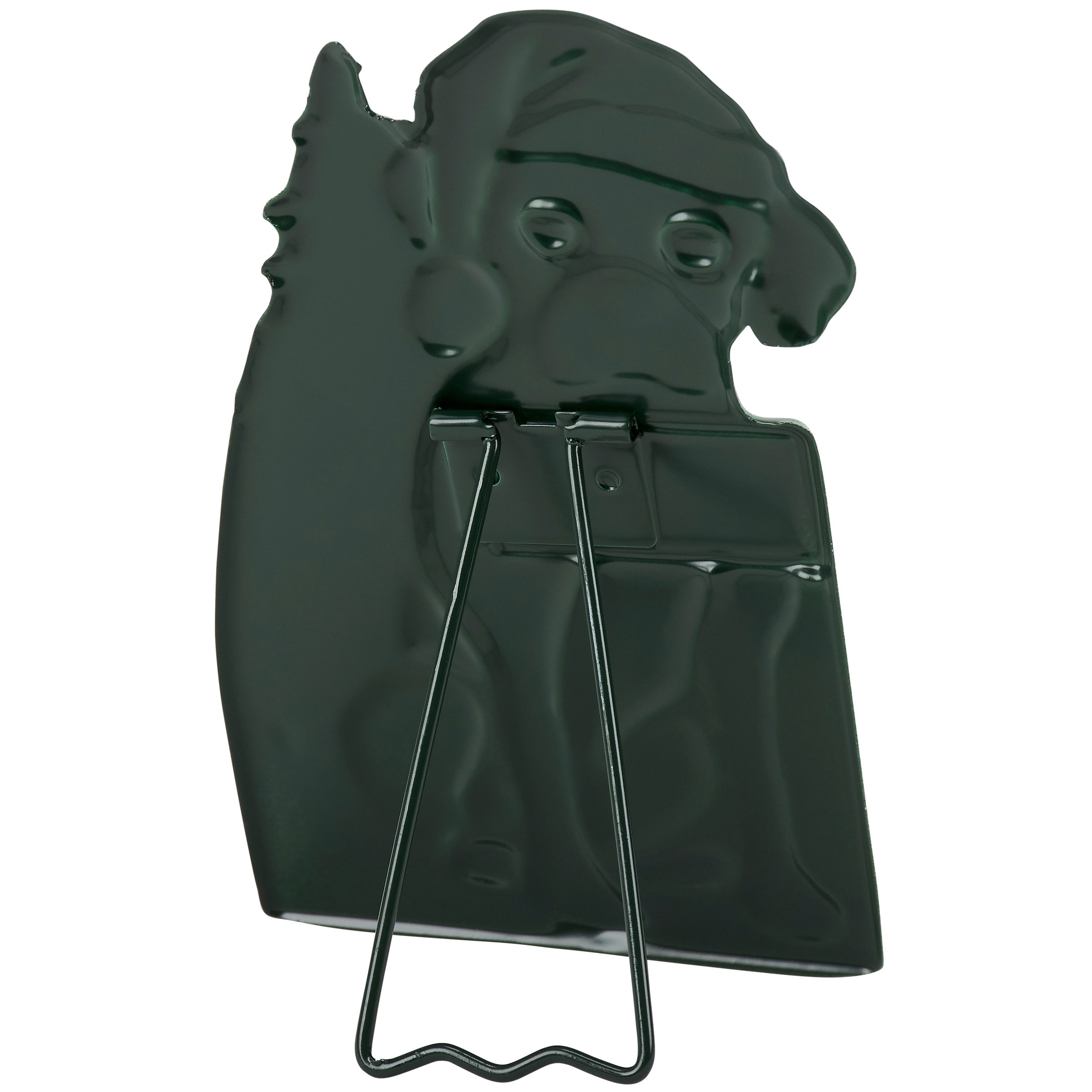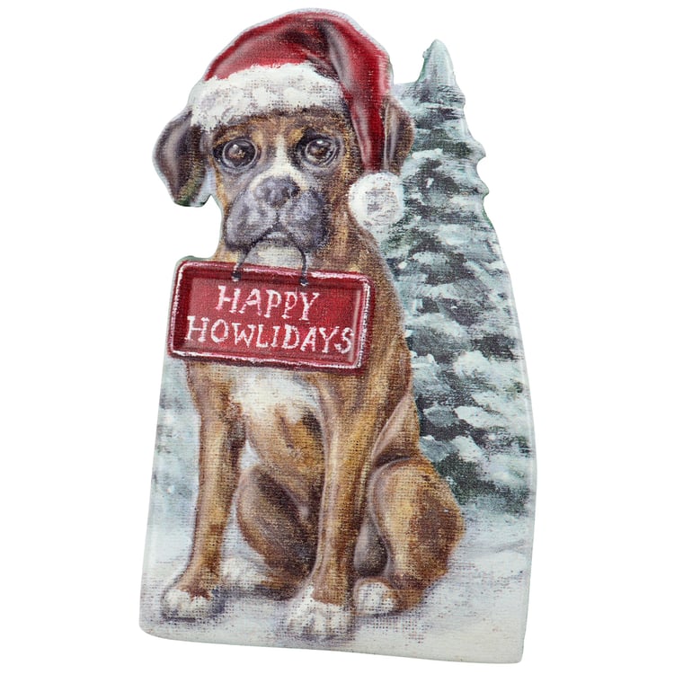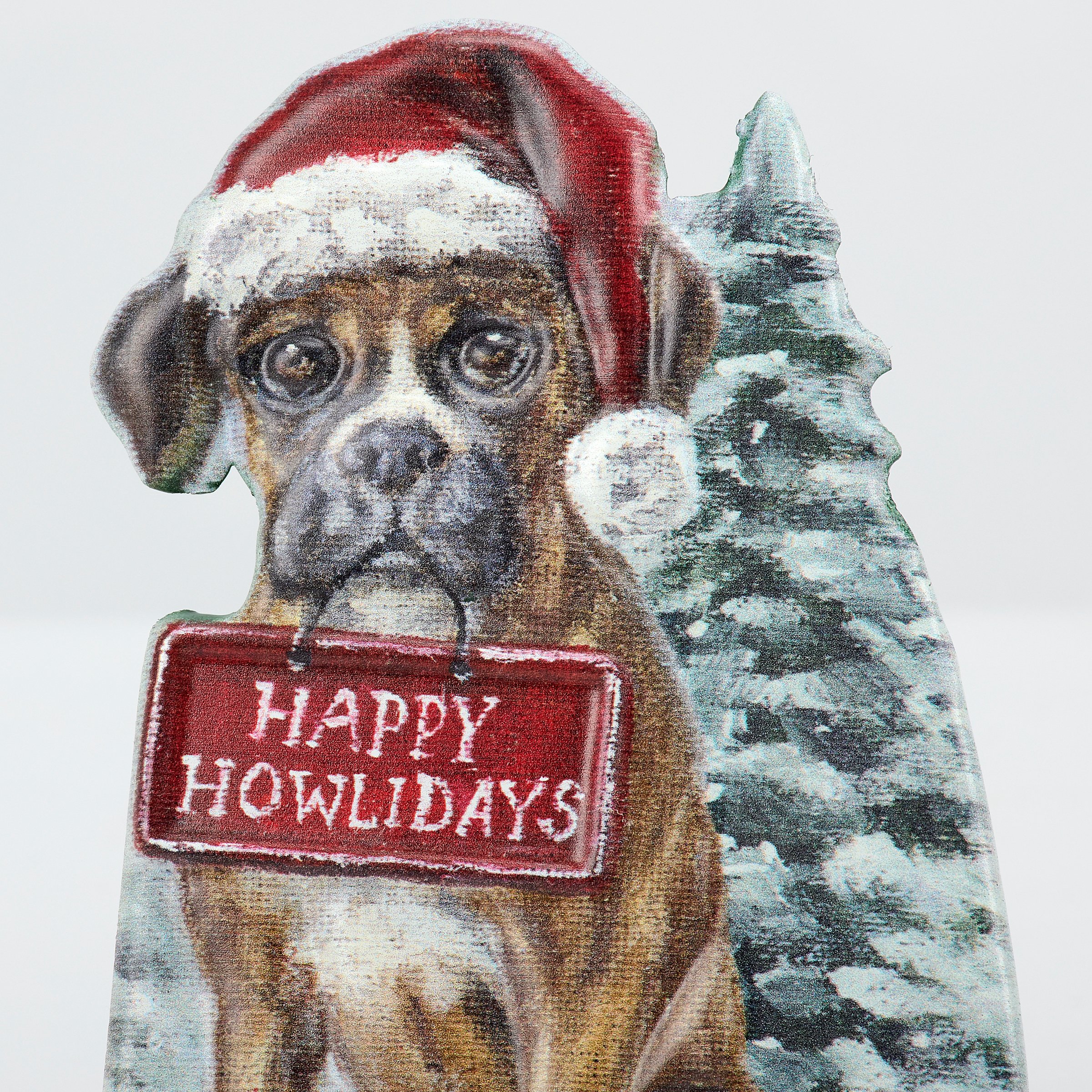 A metal sitter from our Holiday Pet Collection featuring a cutout design displaying a charming winter scene of a Boxer dog wearing a Santa hat and holding a sign that reads "Happy Howlidays" for a fun combination of a love for Christmas and pets. Christmas Boxer dog design is replicated from original artwork painted onto burlap canvas, giving the art a unique depth and texture. This Christmas dog sitter features embossed and debossed details to accent the original hand painted art for added dimension. Our metal Boxer Happy Howlidays sitter free stands on flat surface for display using easel on the back. A fun dog themed home accent that easily adds seasonal style to any home or work space.